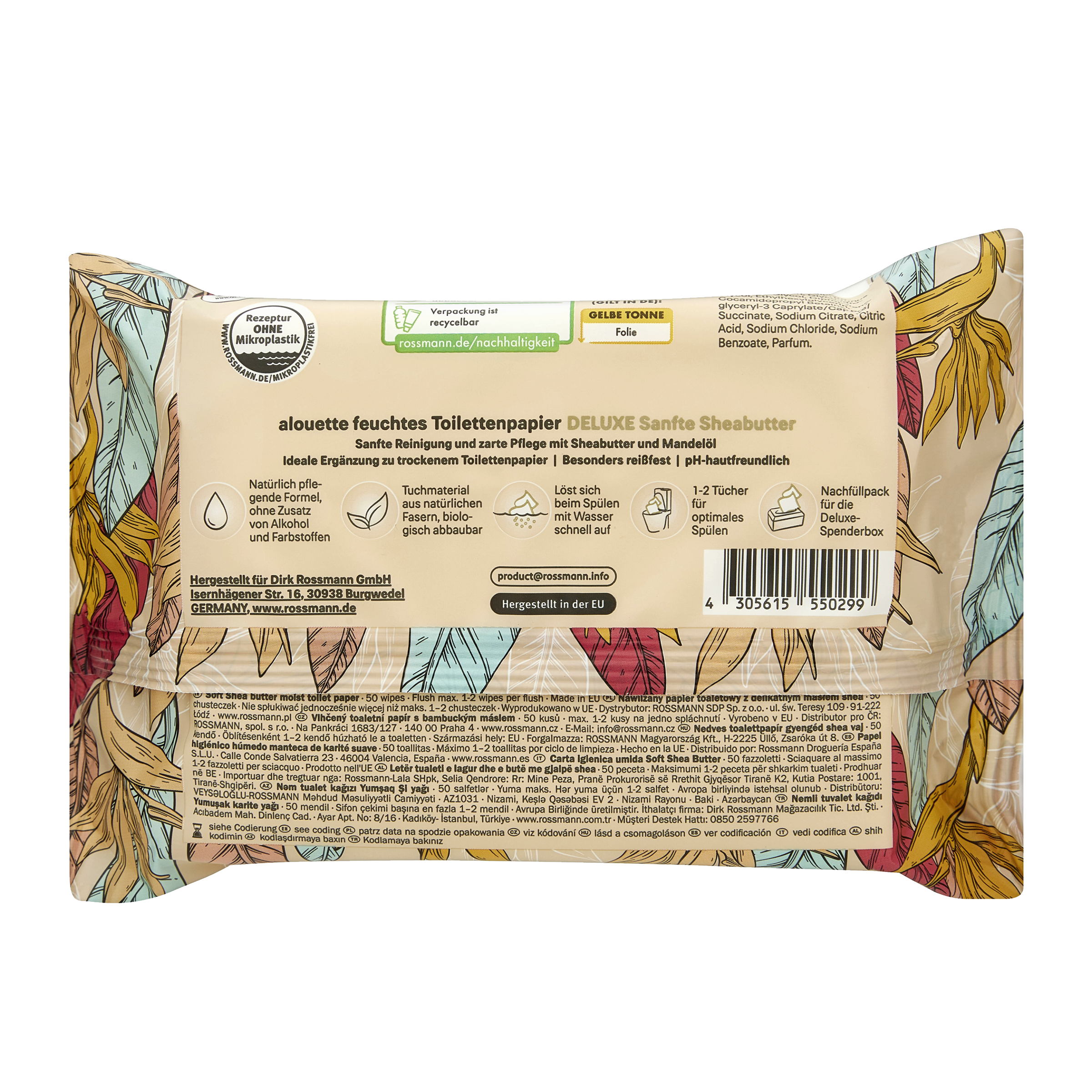 Vlhčené toaletní ubrousky s vůní bambuckého másla poskytují šetrnou péči o pokožku díky extra měkkému materiálu, neutrálnímu pH a ošetřující receptuře s allatoninem, Aloe vera a výtažkem z listů vilínu. Neobsahují alkohol a jejich snášenlivost s pokožkou je dermatologicky testovaná. Ubrousky jsou zároveň biologicky rozložitelné a neobsahují žádná umělá vlákna a při splachování se rozkládají.