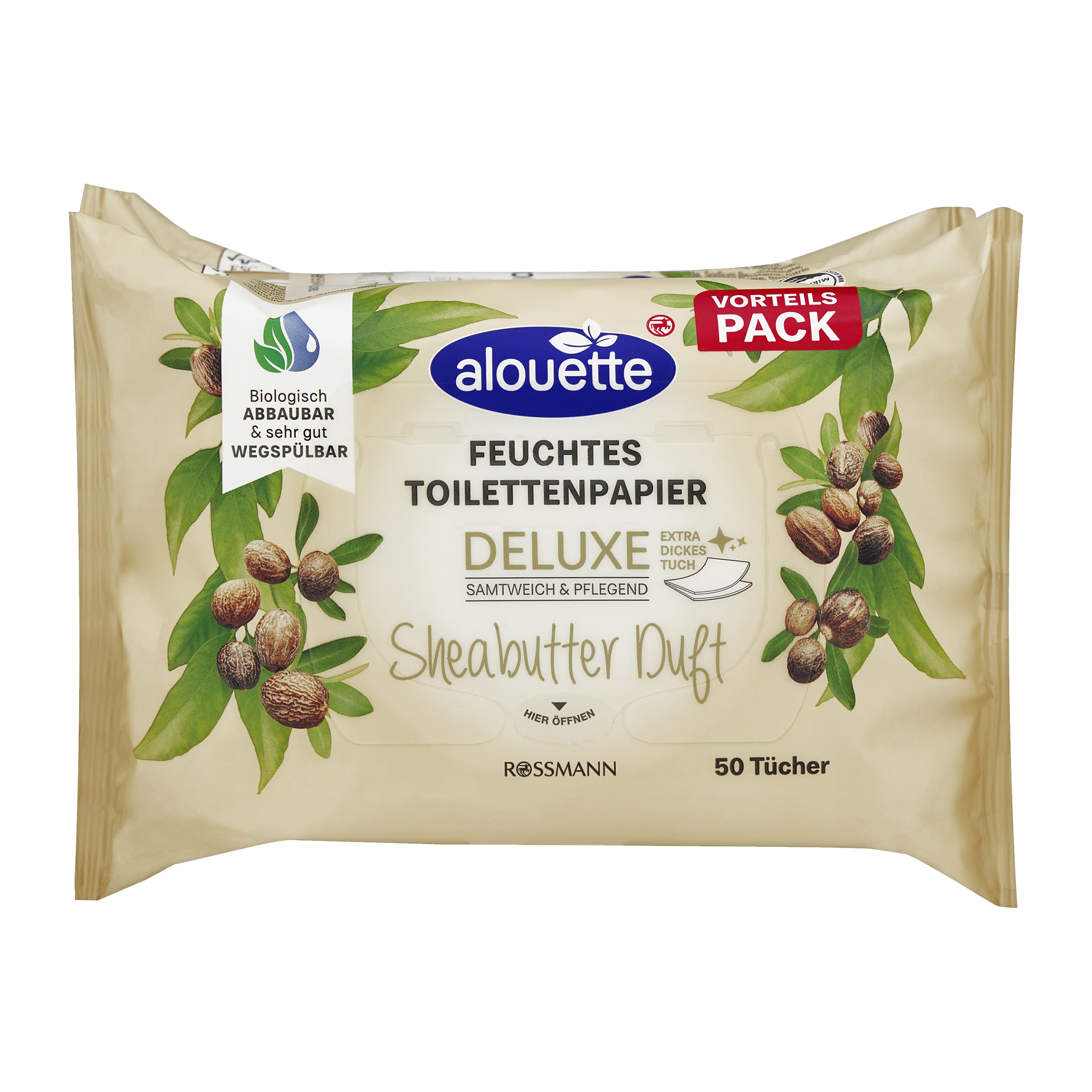 Ideální doplněk suchého toaletního papíru. Vlhké toaletní ubrousky alouette s vůní bambuckého másla nabízejí mimořádně vysokou kvalitu s biologicky odbouratelnými ubrousky. Inovativní pečující receptura s alantoinem, aloe vera a extraktem z vilínu zajišťuje svěží, hladký pocit čištění.