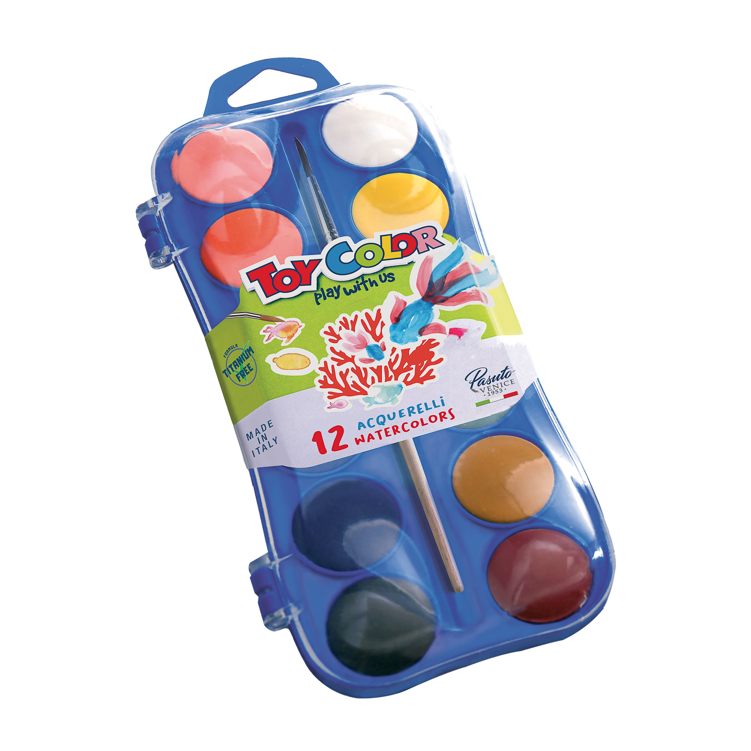 Vodové barvy Pasuto Toy Color jsou vyrobené pomocí exkluzivního technologie zvané „studené vstřikování“. Vodovky nabízejí krémovou texturu a výjimečné chromatické provedení, které umožňuje vytvářet tisíce odstínů. Každá z 12 barev má průměr 30 mm a víčko slouží díky dutinám jako malířská paleta.