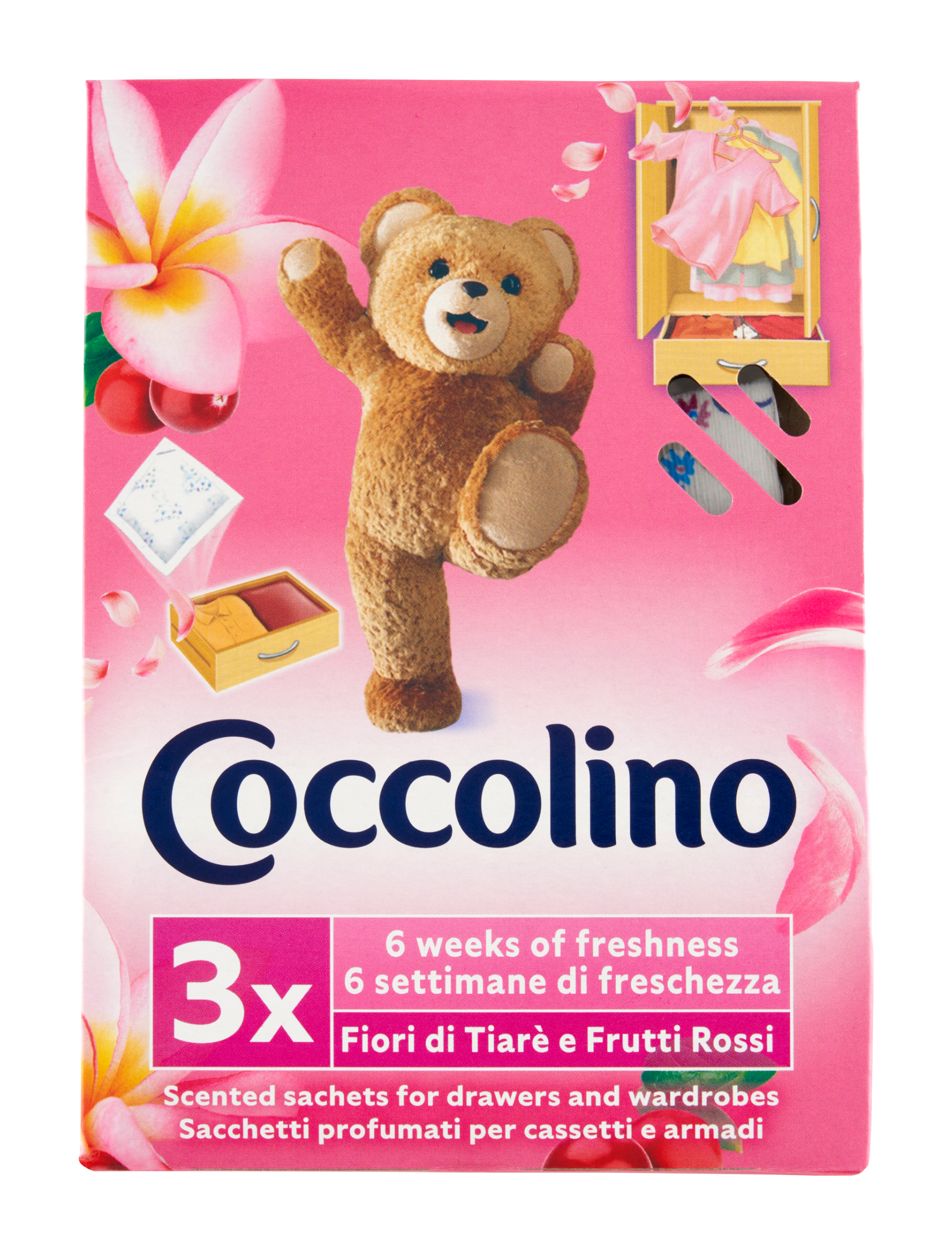 Coccolino Fiori di Tiarè e Frutti Rossi vonné sáčky do šatníku. UPOZORNĚNÍ: Nepoužívejte v pračce ani sušičce. Nevyhazujte do kanalizace. Uchovávejte mimo dosah dětí. Zamezte styku s očima. Při zasažení očí důkladně oči vypláchněte vodou. Nekonzumujte. Při požití vyhledejte lékařskou pomoc. Po použití si opláchněte ruce. Obsahuje linalool. Může vyvolat alergickou reakci.
