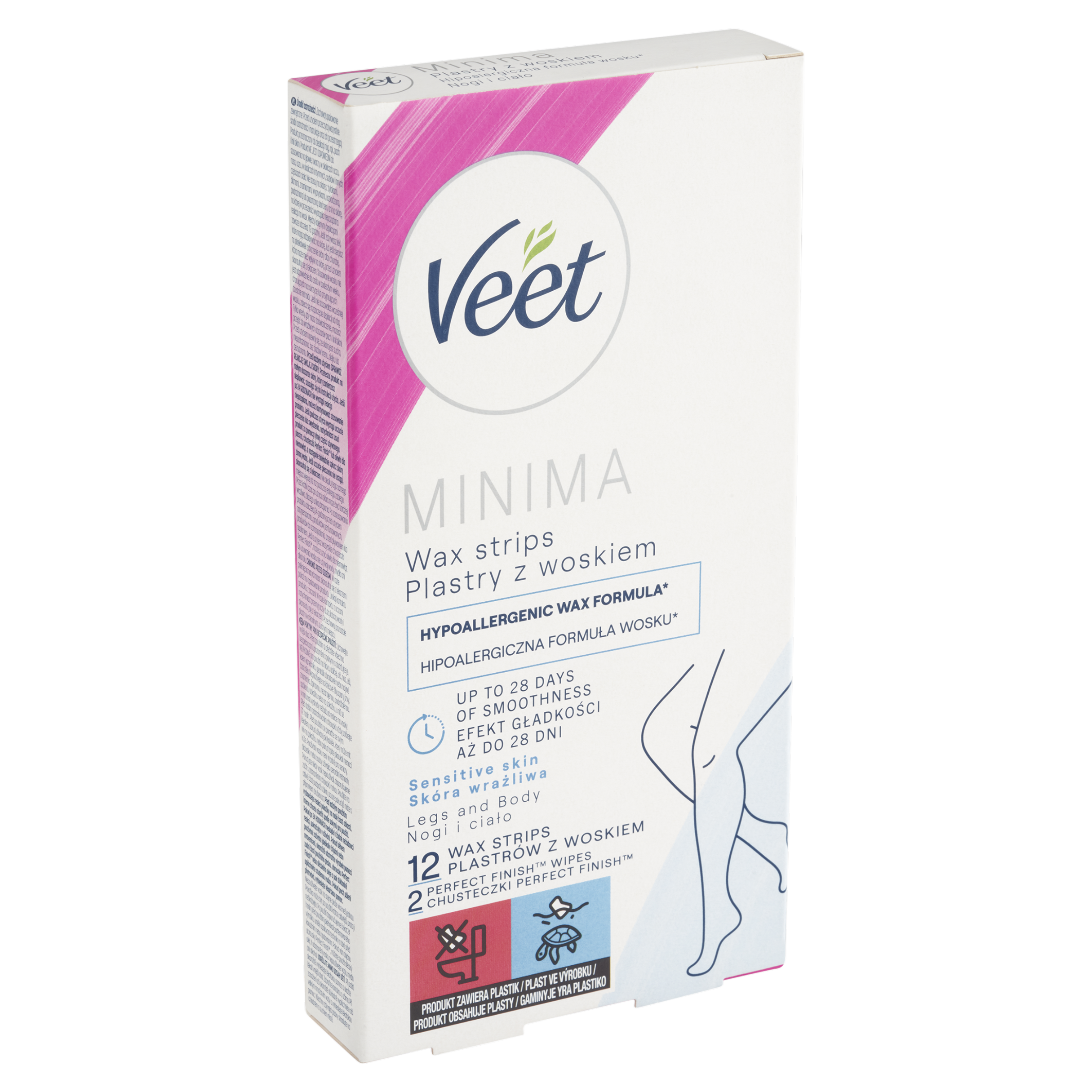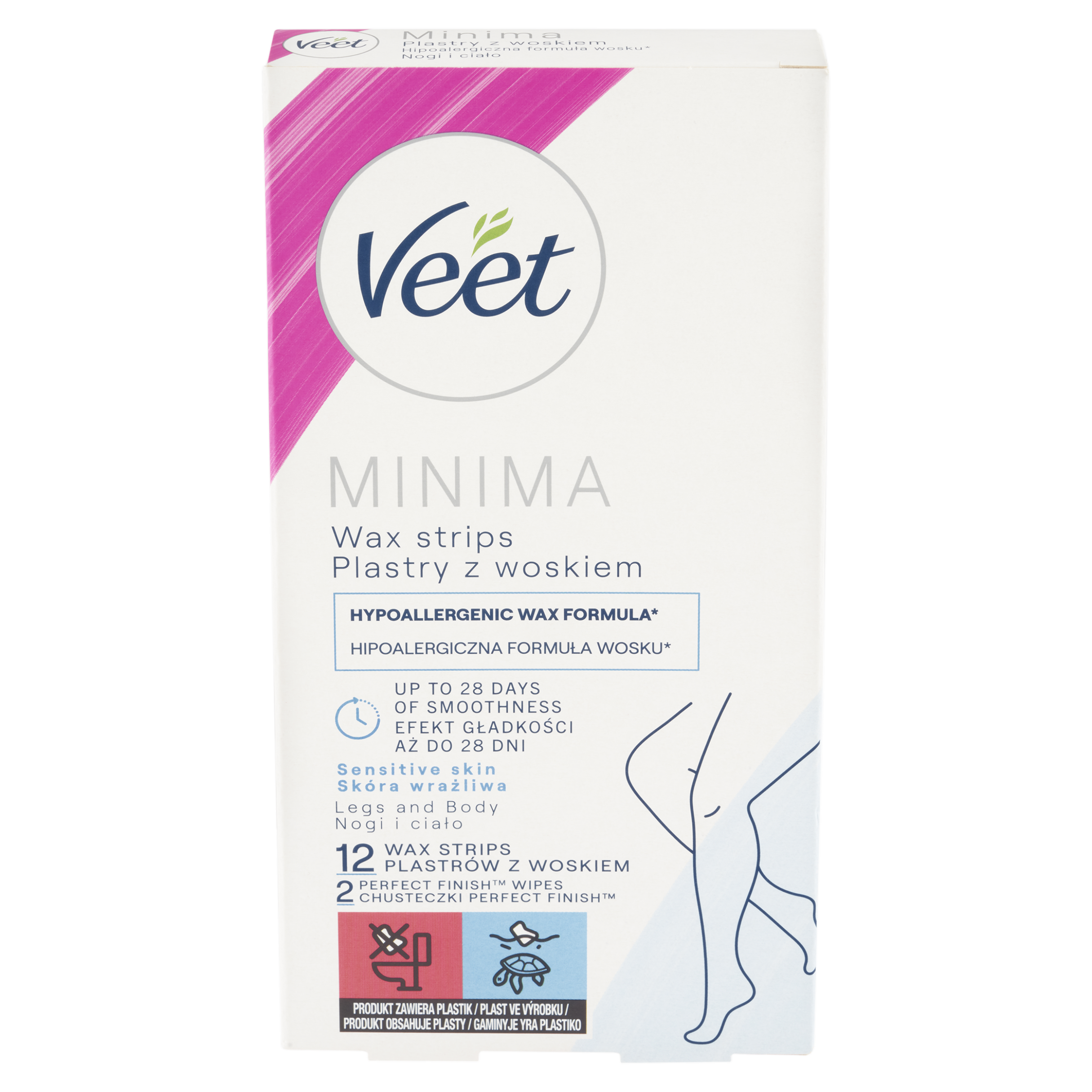 Veet Minima voskové pásky na nohy a tělo s hypoalergenním složením* pro citlivou pokožku. Obsahuje minimální množství ingrediencí. Odstraní chloupky od kořínků pro hladkou pokožku až na 28 dní. *Složení minimalizuje riziko alergických reakcí.