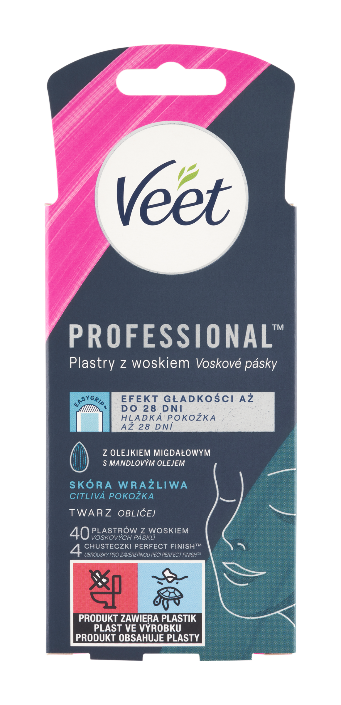 Veet Professional™ voskové pásky na obličej pro citlivou pokožku a ubrousky pro závěrečnou péči Perfect Finish™ Profesionálně navržené voskové pásky s technologií EasyGrip™ Vám umožní odstranit i ty nejmenší chloupky* od kořínků již při první aplikaci. S mandlovým olejem, který je známý pro své uklidňující vlastnosti; voskové pásky zanechají pokožku hladkou až na 28 dní. Pásek je navržen tak, aby umožňoval přesné použití, takže je ideální pro malé a choulostivé oblasti, jako je horní ret, tváře a brada.