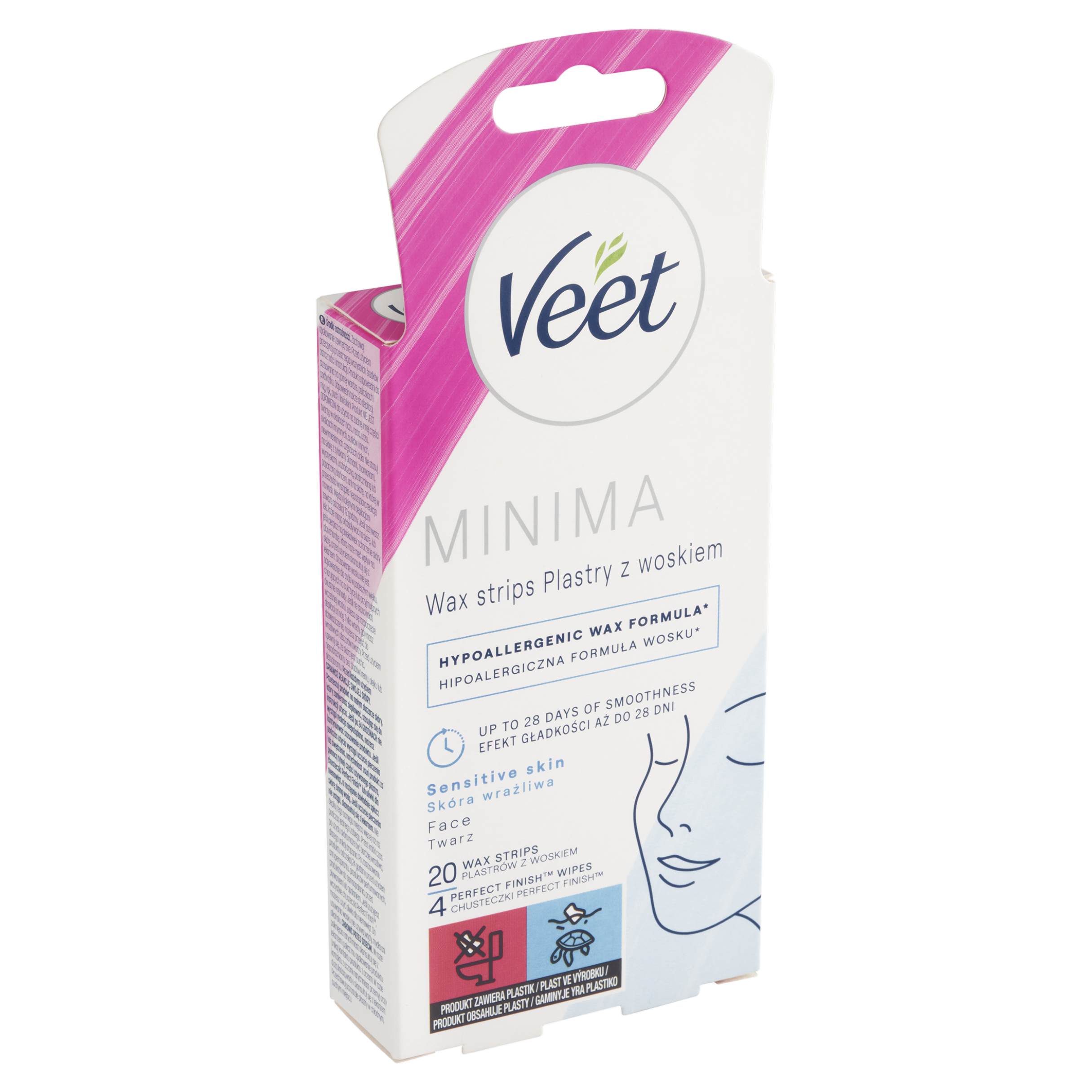 Veet Minima voskové pásky na obličej s hypoalergenním složením* pro citlivou pokožku Složení s minimálním množstvím ingrediencí odstraní chloupky od kořínků pro hladkou pokožku až na 28 dní. *Složení minimalizuje riziko alergických reakcí Veet Minima voskové pásky na obličej s hypoalergenním složením* pro citlivou pokožku Složení s minimálním množstvím ingrediencí odstraní chloupky od kořínků pro hladkou pokožku až na 28 dní. *Složení minimalizuje riziko alergických reakcí