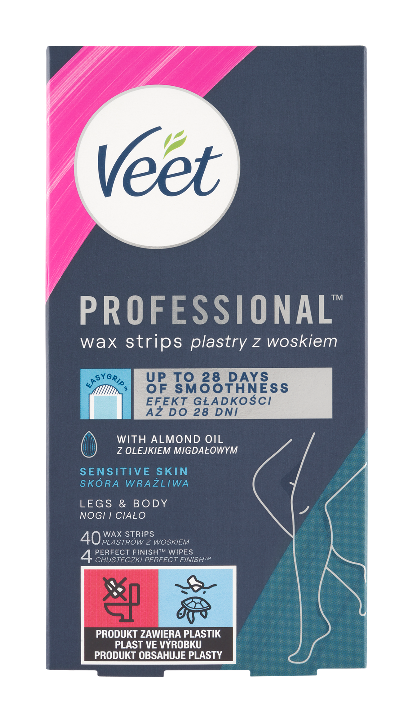 Před použitím voskových pásků Veet si pečlivě přečtěte bezpečnostní pokyny na balení. Před použitím pásek se ujistěte, že je pokožka zcela čistá a suchá. Každý pásek můžete opakovaně použít až do okamžiku, kdy ztratí svou lepivost. Můžete dosáhnout skvělých výsledků pouze pomocí 4 jednoduchých kroků: Pro oddělení pásků od sebe není potřeba mnout je mezi rukama! 1 Pomalu od sebe pásky oddělte pomocí vnějších zaoblených okrajů. 2 Aplikujte jeden pásek na pokožku ve směru růstu chloupků. Použitím zaobleného okraje ve směru růstu chloupků se ujistěte, že vosk dobře drží. 3 Uchopte okraj. Držte pokožku napnutou. Strhněte pásek zpět proti směru růstu chloupků co nejrychleji! Jedním rychlým pohybem co nejblíže pokožce. 4 Po depilaci voskem očistěte veškerý vosk, který zůstal na kůži, pomocí ubrousku Perfect Finish™. Dostatečné množství na 4 depilace obou lýtek.