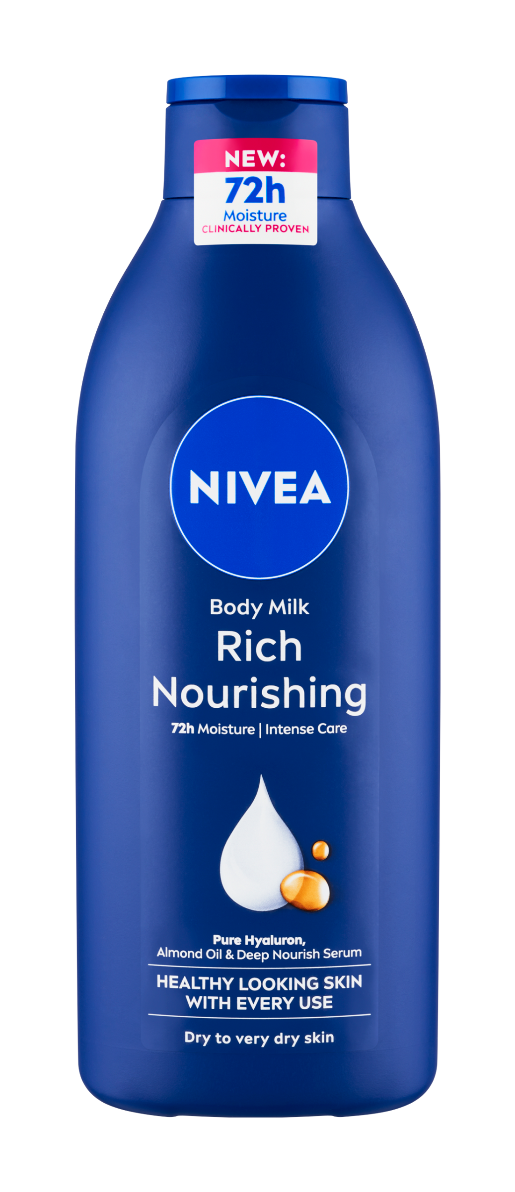 INOVOVANÉ SLOŽENÍ. NIVEA® Výživné tělové mléko Rich Nourishing hloubkově hydratuje i velmi suchou pokožku po 72 hodin. Rychle se vstřebávající a nemastné složení je obohacené o čistou kyselinu hyaluronovou, mandlový olej a hloubkově vyživující sérum. Lahev je z 50 % z recyklovaného plastu (bez uzávěru).