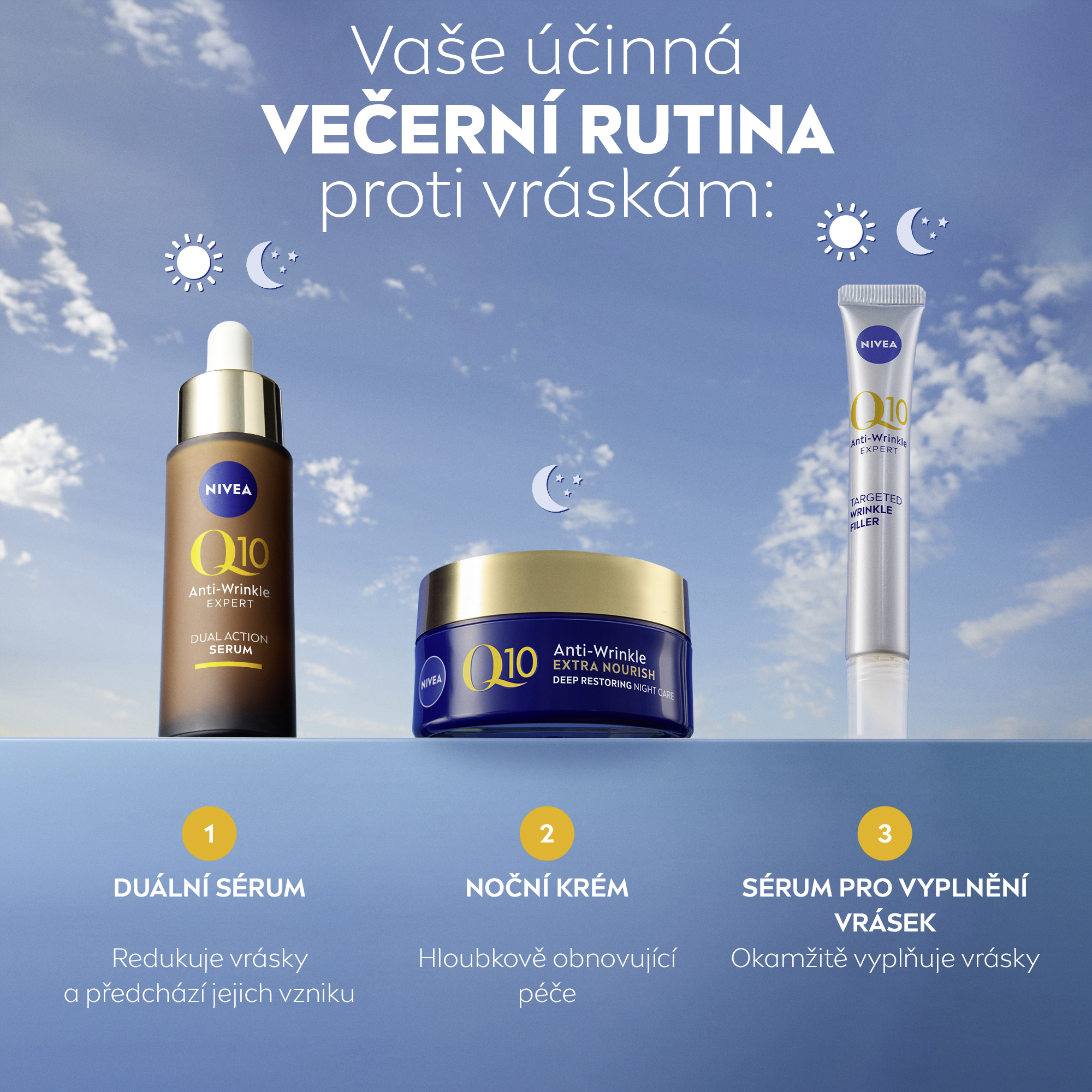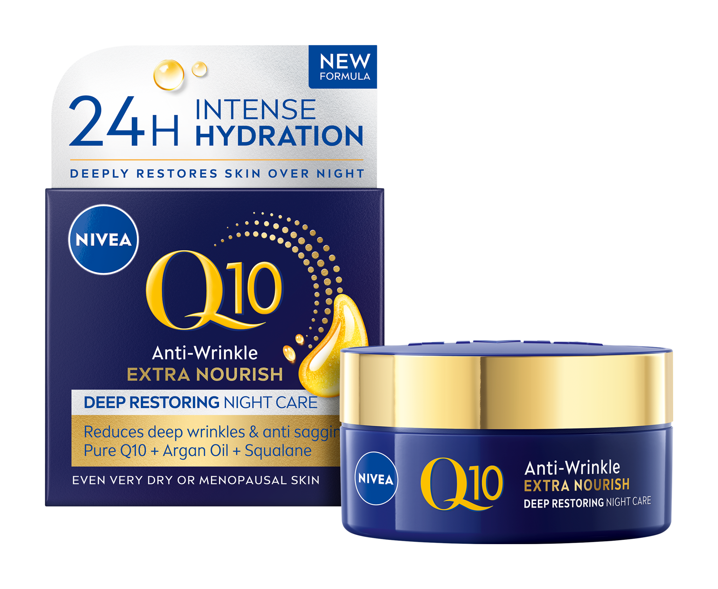 Nivea® Výživný noční krém proti vráskám Q10 Extra Nourish je speciálně navržen tak, aby dobře fungoval během noci, kdy je pleť vnímavější. Složení s čistým koenzymem Q10, organickým arganovým olejem a skvalanem intenzivně pleť vyživuje, aby byla okamžitě hladší a jemnější.