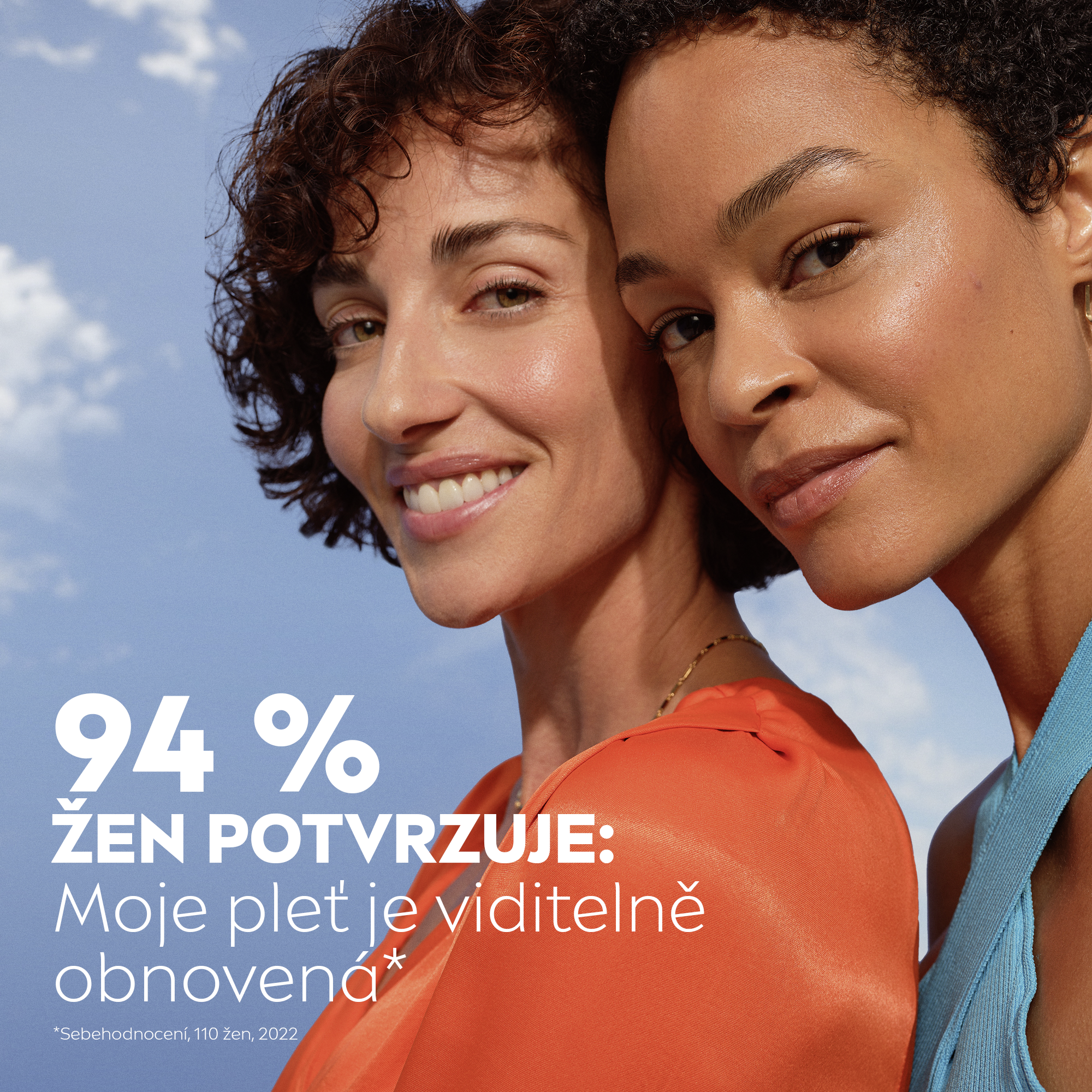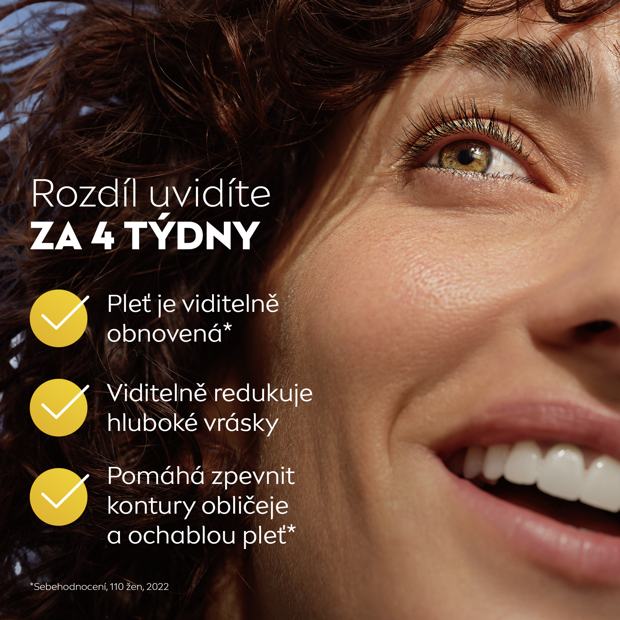 - 2 týdny: měřitelně pevnější pleť. Pleť vypadá viditelně obnovená pro 94% žen.* *sebehodnocení, 107 žen, 2022.