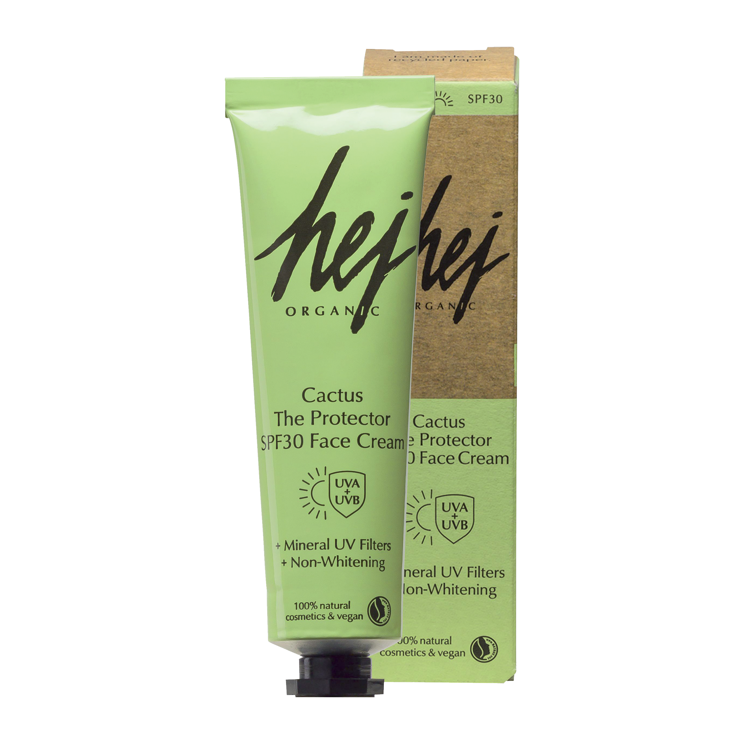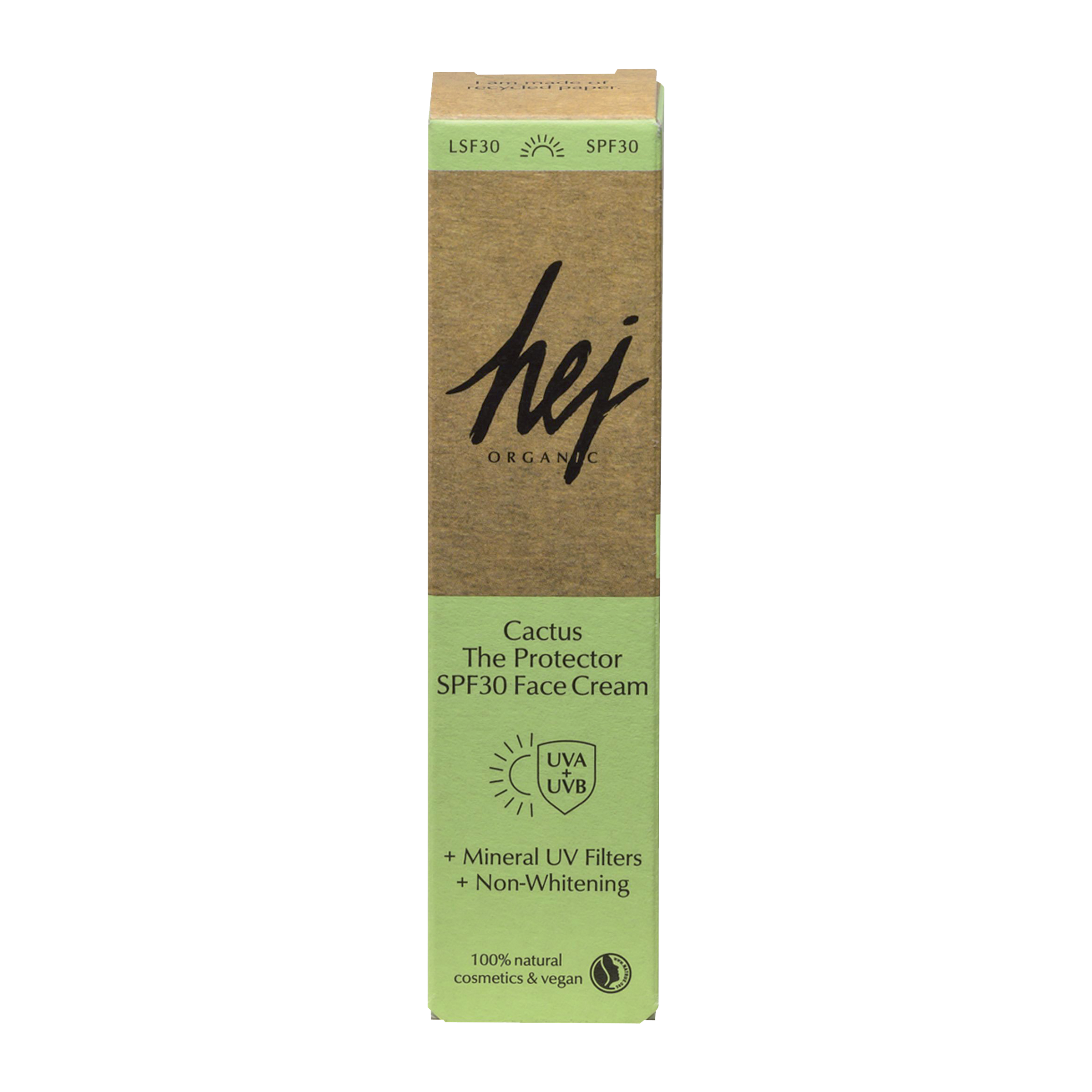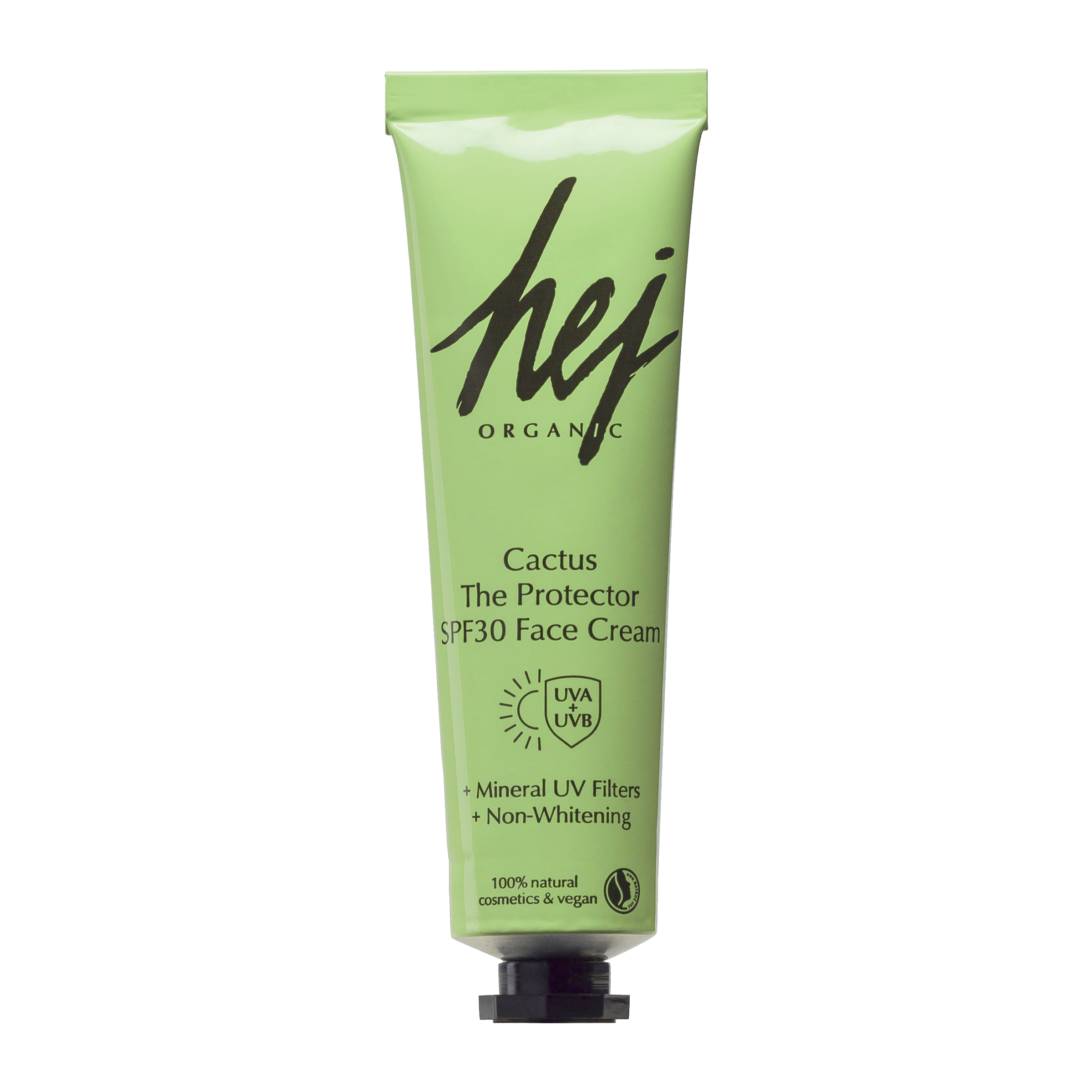 Hej Organic ochranný a vyživující krém s SPF 30 je lehký, ale výživný. Má minerální filtr, ale nezanechává bílý film a na pleti nelepí. Obsahuje vitamín C a kyselinu hyaluronovou, které pokožku chrání a dodávají jí hydrataci. Krém je vhodný i na citlivou pokožku. Zabraňuje předčasnému stárnutí pleti a dá se kombinovat se všemi produkty Hej Organic. Zelené produkty Hej Organic obsahují olej z opuncie (kaktusu), který je jedním z nejvzácnějších a nejluxusnějších přírodních olejů, které se v kosmetice používají.