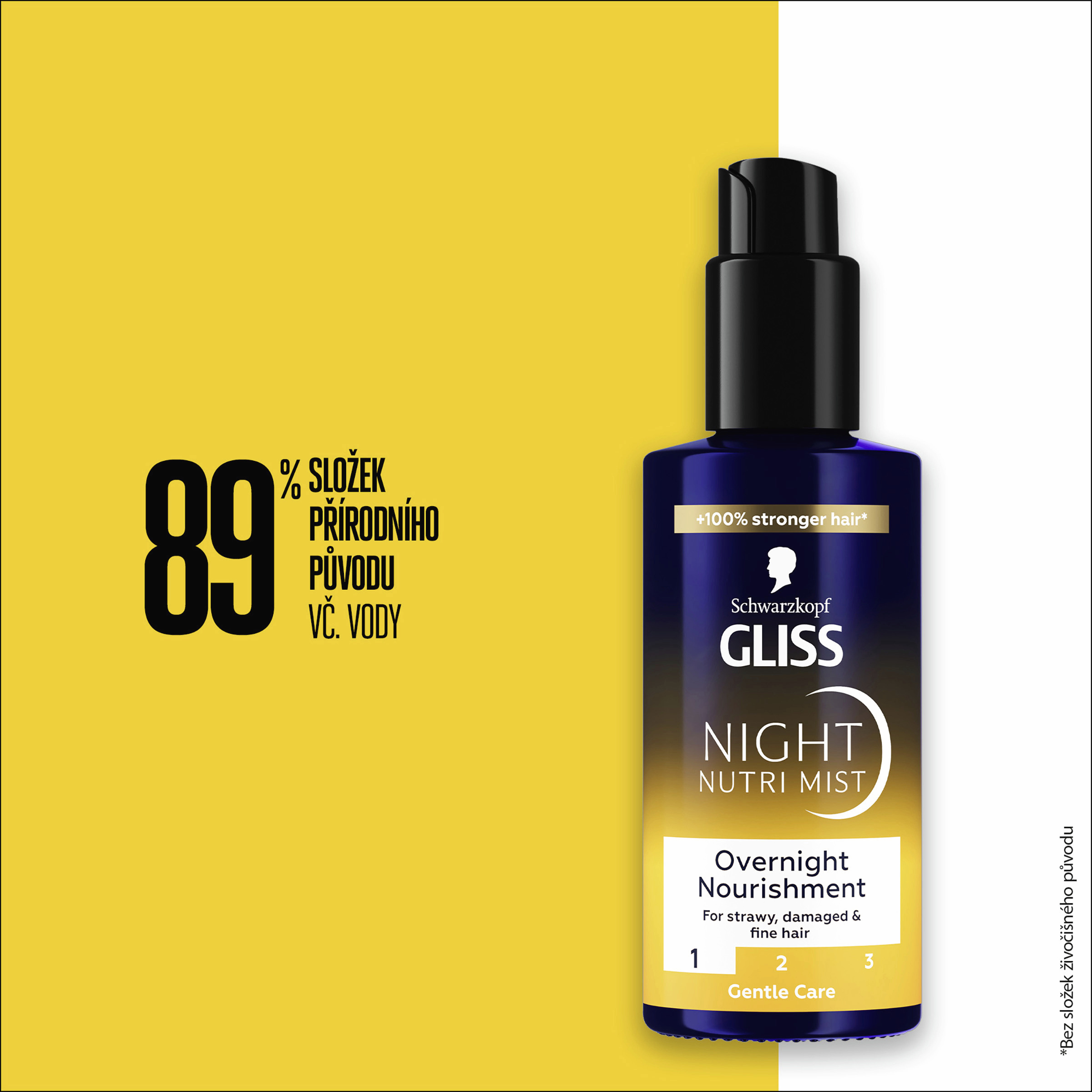 Noční výživa pro roztřepené, poškozené a jemné vlasy Gliss Night Nutri Mist s HaptIQ systémem a arganovým olejem vyživuje vlasy během noci, zatímco spíte, a zajišťuje dlouhotrvající regeneraci. Vyživující sprej na vlasy využívá noční dobu k tomu, aby pronikl do hloubky vlasového vlákna a vytvořil nové mikrovazby uvnitř vlasu. Ráno jsou vlasy krásné, hebké a lesklé.