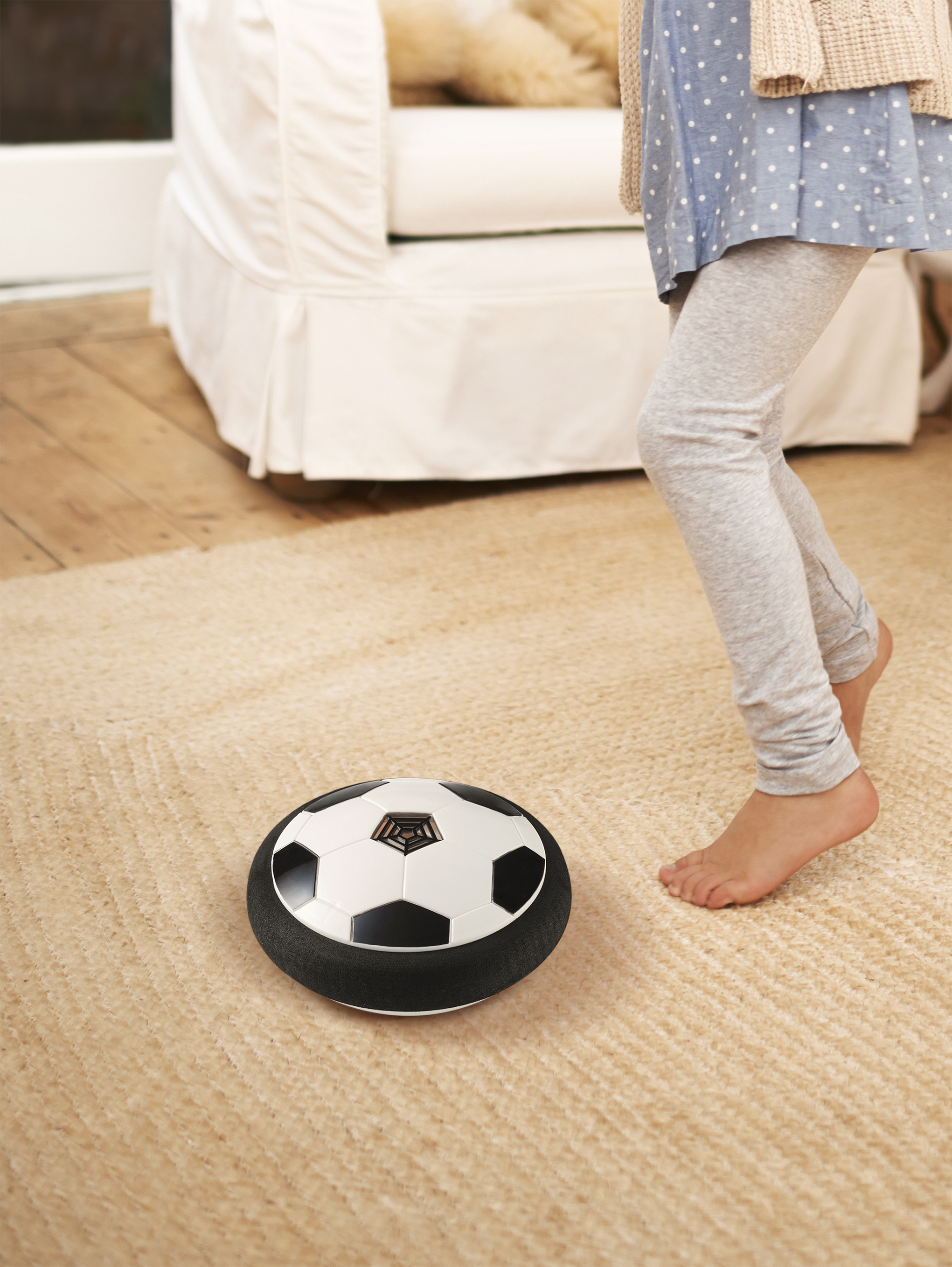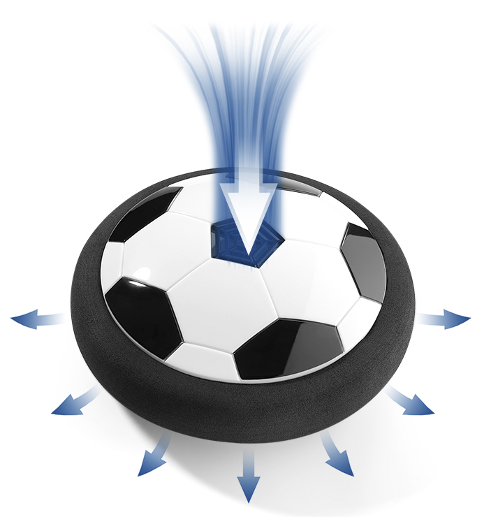 Užijte si zábavu s tímto unikátním fotbalovým míčem, který se vznáší na vzduchovém polštáři a hladce klouže po všech hladkých tvrdých podlahách i po krátkovlasých kobercích. Pěnové polstrování chrání nábytek i nohy, takže si hru můžete užít bez obav.