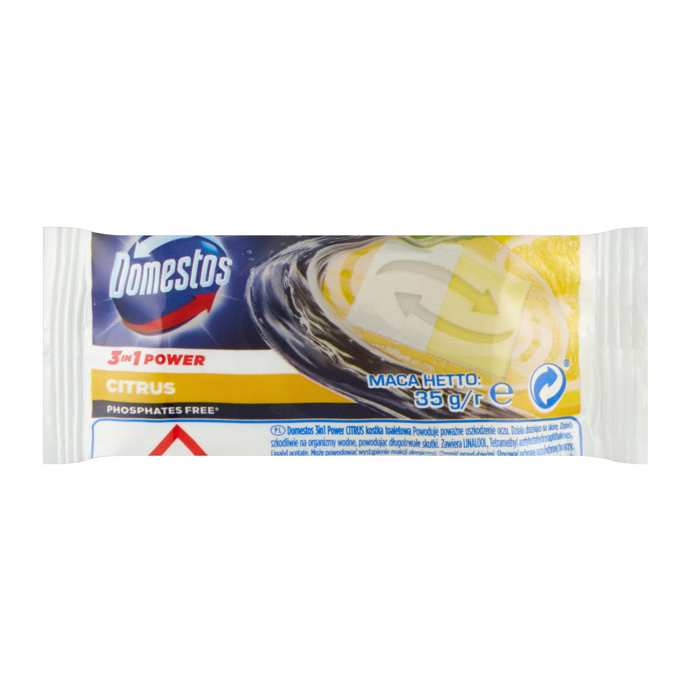 NEBEZPEČÍ Domestos 3v1 Power Citrus tuhý WC blok - náhradní náplň. Způsobuje vážné poškození očí. Dráždí kůži. Škodlivý pro vodní organismy, s dlouhodobými účinky. Obsahuje linalool, 1-(1,2,3,4,5,6,7,8-oktahydro-2,3,8,8-tetramethyl-2-naftyl)ethan-1-on, 3,7-dimethylokta-1,6-dien-3-yl-acetát. Může vyvolat alergickou reakci. Uchovávejte mimo dosah dětí. Používejte ochranné brýle/obličejový štít.
