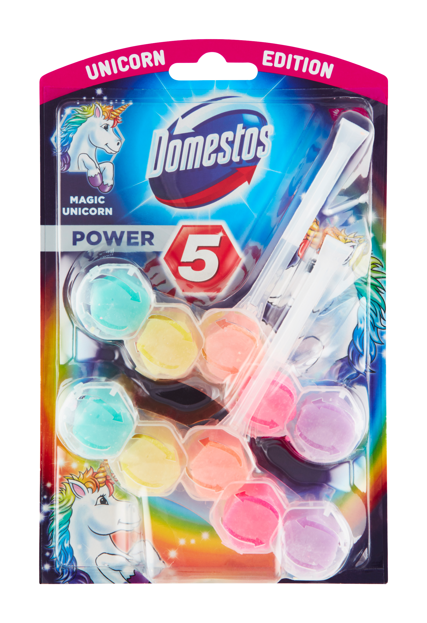 Síla v každém spláchnutí! Udržování svěžesti a čistoty vašeho WC nebylo nikdy tak snadné jako s revolučním závěsným WC blokem Domestos Power 5 Unicorn. Tento účinný závěsný WC blok má ne jednu, ale hned pět klíčových výhod pro úžasnou čistotu a mimořádnou svěžest. S každým jednotlivým spláchnutím uvolňuje blok Power 5 pod okraj toaletní mísy aktivní čistící pěnu, která odstraňuje nečistoty i bakterie, desinfikuje, brání tvorbě vodního kamene, leští vaši toaletu a zároveň uvolňuje svěží a dlouhotrvající vůni limetky, pomerančového květu, levandule a růžové magnólie. Domestos Power 5 UNICORN tak zanechá vaše WC čisté, zářící a se svěží vůní. Nyní výhodné balení.
