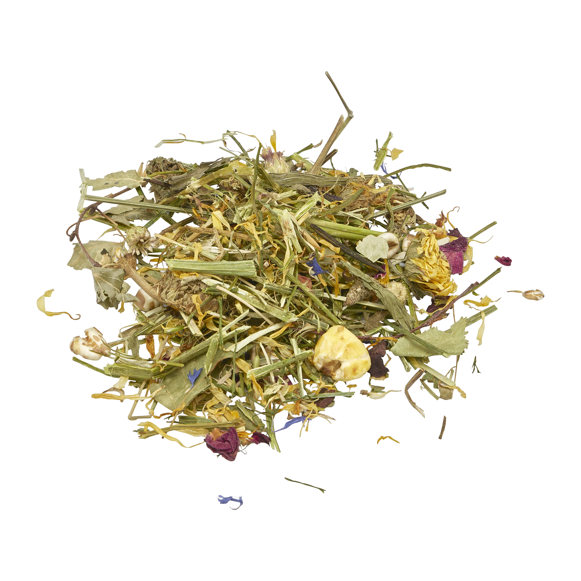 Hrachové vločky (12,6 %), ovesné vločky (10,7 %), pšeničné vločky (10,7 %), květy měsíčku (8,7 %), petržel (8,5 %), vojtěška (7,0 %), kopřiva (4,1 %), červená řepa (4,0 %), pampeliška (3,6 %), jitrocel (3,5 %), pšenice (3,5 %), pšenice pufovaná (3,5 %), kukuřice pufovaná (3,5 %), březové listy (3,5 %), kukuřičné vločky (2,3 %), květy chrpy (2,3 %), mrkev (2 %), meduňka (2 %), jetel (2 %), máta peprná (1,0 %), květy růže (1,0 %).