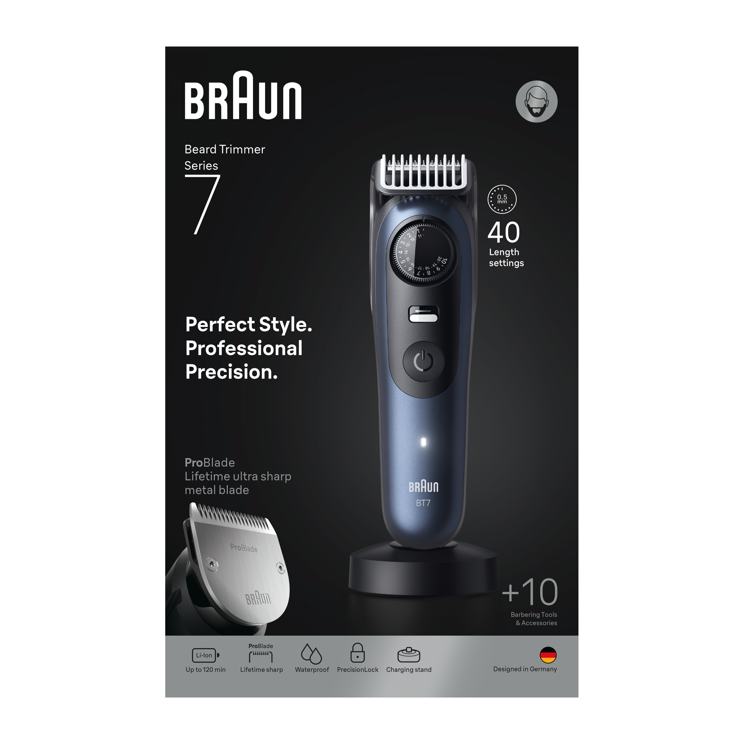 Zastřihovač vousů Braun Series 7, navržený pro profesionální přesnost a dokonalost při každém tahu. Díky břitu ProBlade extrémně ostrému po celou dobu životnosti a technologii AutoSense zachytí tento zastřihovač chloupky i v těch nejobtížněji dostupných místech. Už žádné omyly. Díky zámku PrecisionLock a 40 možnostem nastavení délky máte svůj styl zcela pod kontrolou. Ať už zastřihujete, holíte, upravujete kontury nebo detaily, tento zastřihovač má ty nejlepší nástroje pro dokonalé linie, oholení do ztracena a konečnou úpravu vousů.