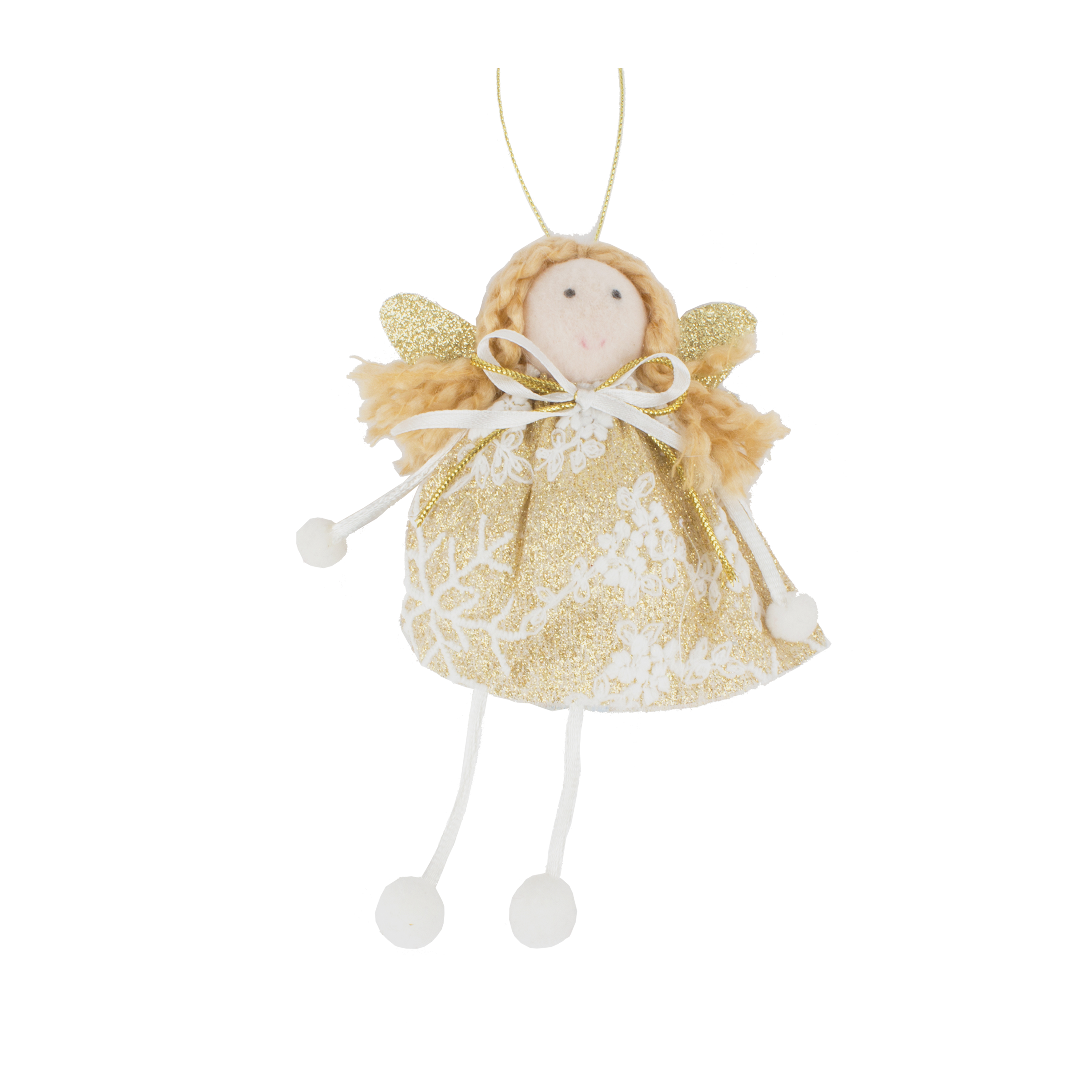 Kouzelná závěsná figurka anděla s kudrnatými blond vlásky, zlatými třpytivými křídly a šaty s jemným květinovým vzorem. Tenké provázkové ruce a nohy zakončené bílými bambulkami dodávají dekoraci hravý vzhled. Ideální pro zavěšení na stromek či do okna. Výška: 16 cm.