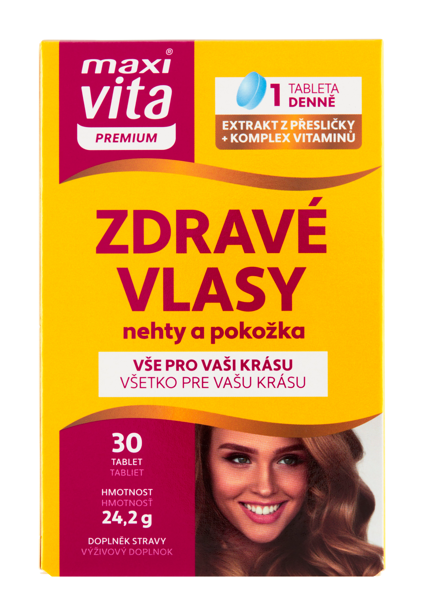 Maxivita® Premium Zdravé vlasy, nehty a pokožka obsahuje kombinaci vyváženého množství důležitých látek, které pomáhají ke zlepšení vzhledu a struktury oslabených či řídnoucích vlasů. Jsou prospěšné k udržení krásné zdravé pleti, pokožky i nehtů.