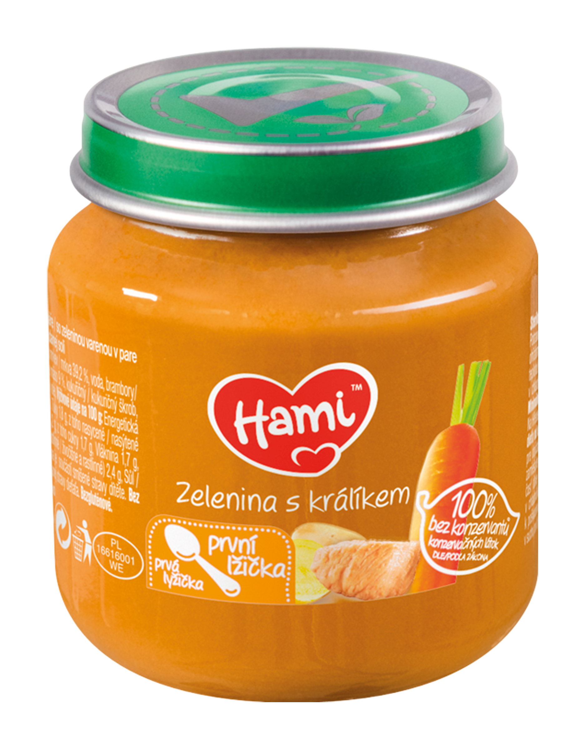 Složení ve 100 g výrobku: mrkev 39,2 %, voda, brambory 16 %, králičí maso 9 %, kukuřičný škrob, celer 2,5 %, řepkový olej