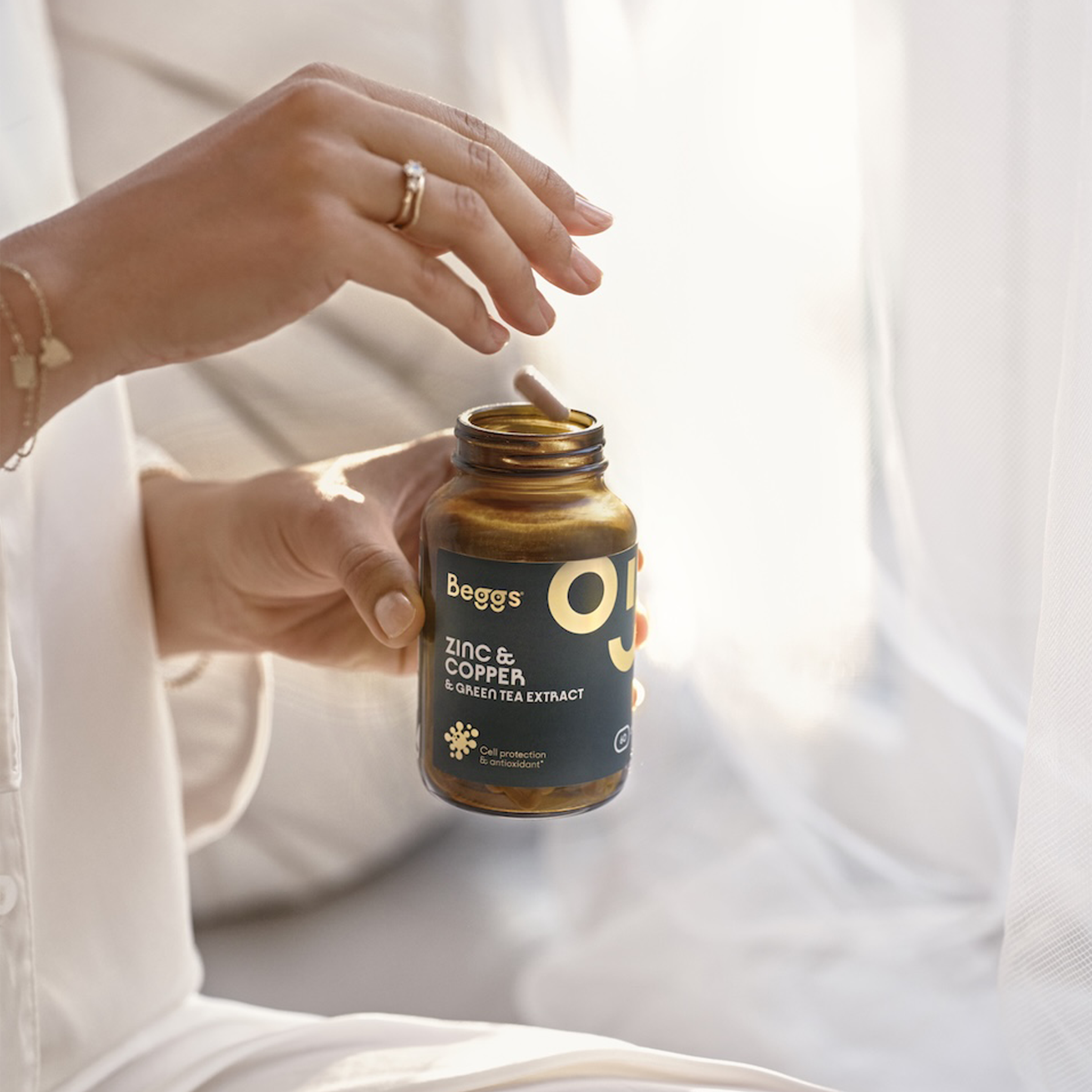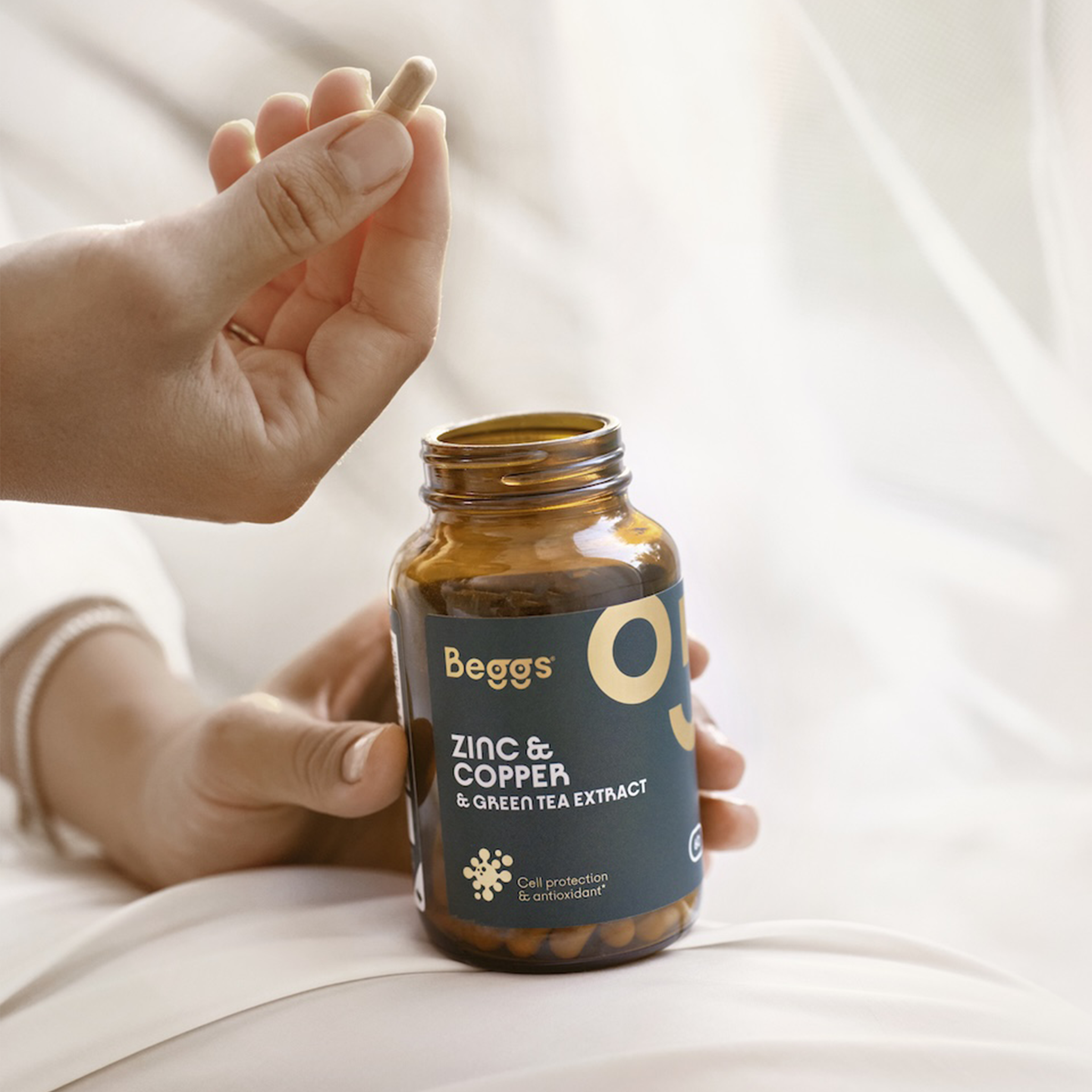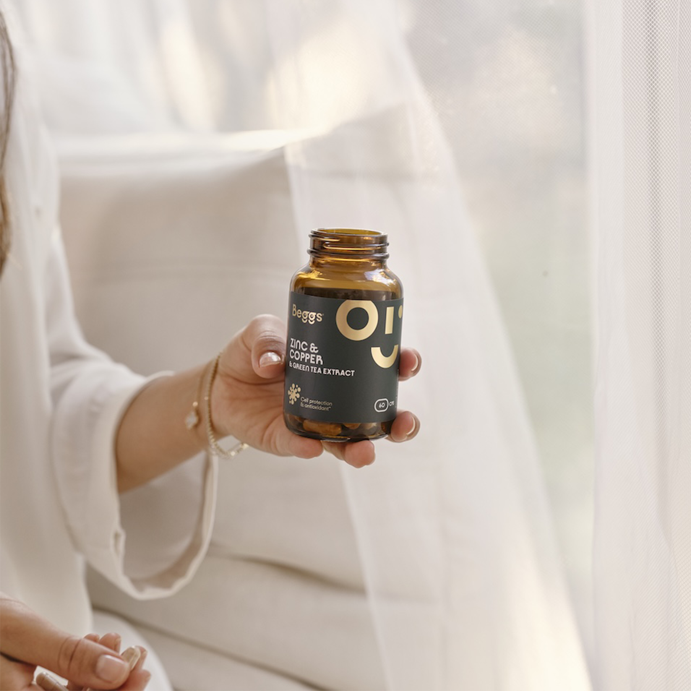 Beggs Zinek + měď + zelený čaj je prémiový doplněk stravy s pečlivě vyváženou kombinací minerálů a extraktu ze zeleného čaje. Přináší každodenní podporu imunity, vitality a ochranu buněk před oxidativním stresem. Zinek a měď přispívají k normální funkci imunitního systému, ochraně buněk před oxidativním stresem a podpoře zdravé pokožky, vlasů a nehtů. Extrakt ze zeleného čaje s obsahem minimálně 50 % EGCG přináší antioxidační účinky a jemné osvěžení těla i mysli.