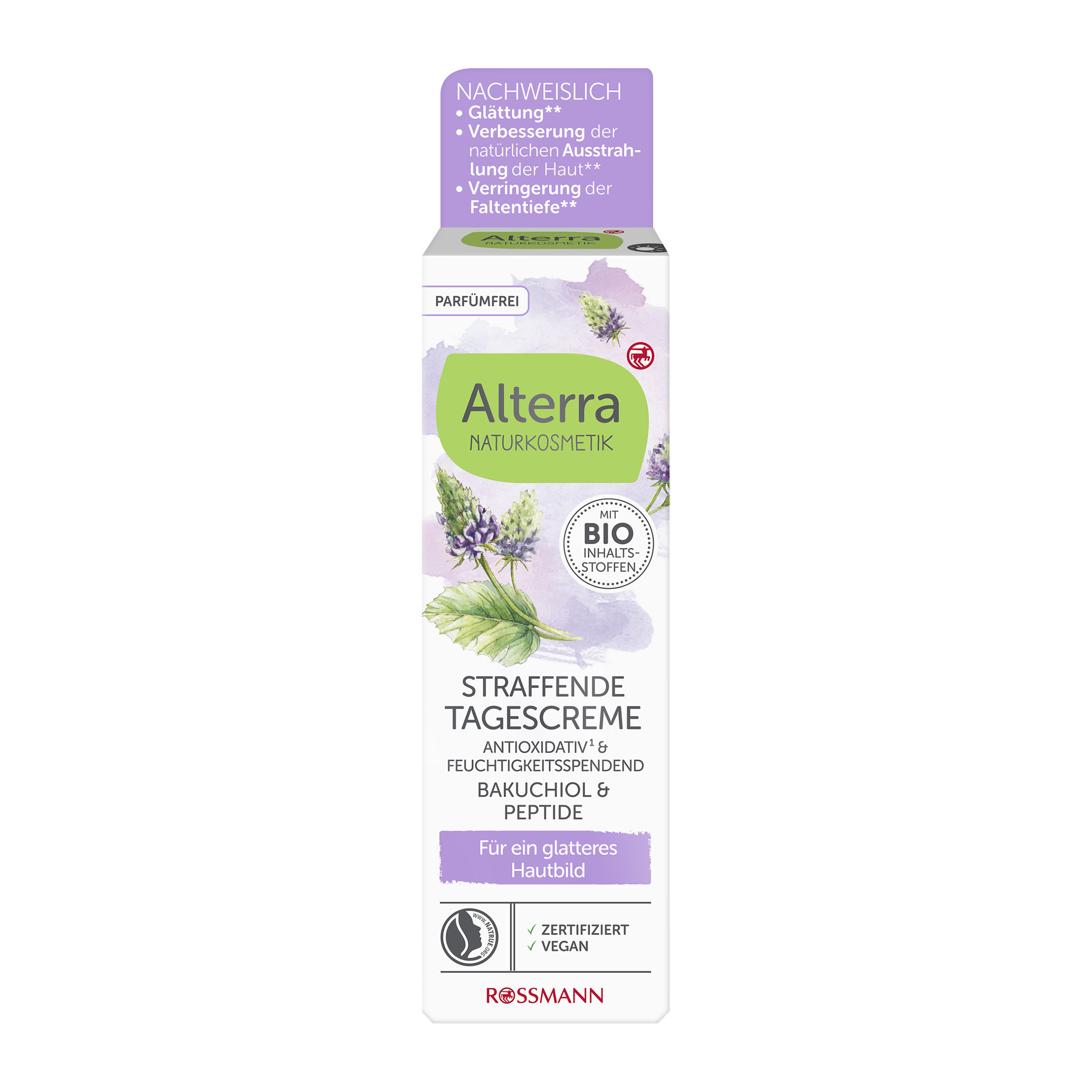 Zpevňující denní krém Alterra prokazatelně působí proti známkám stárnutí pleti. Účinné složení s bakuchiolem a peptidy - známými mimo jiné tím, že stimulují vlastní kolagenový systém pleti - zajišťuje pevnější a hladší pleť obličeje. První linky a vrásky jsou redukovány - pro pleť s přirozeným leskem.