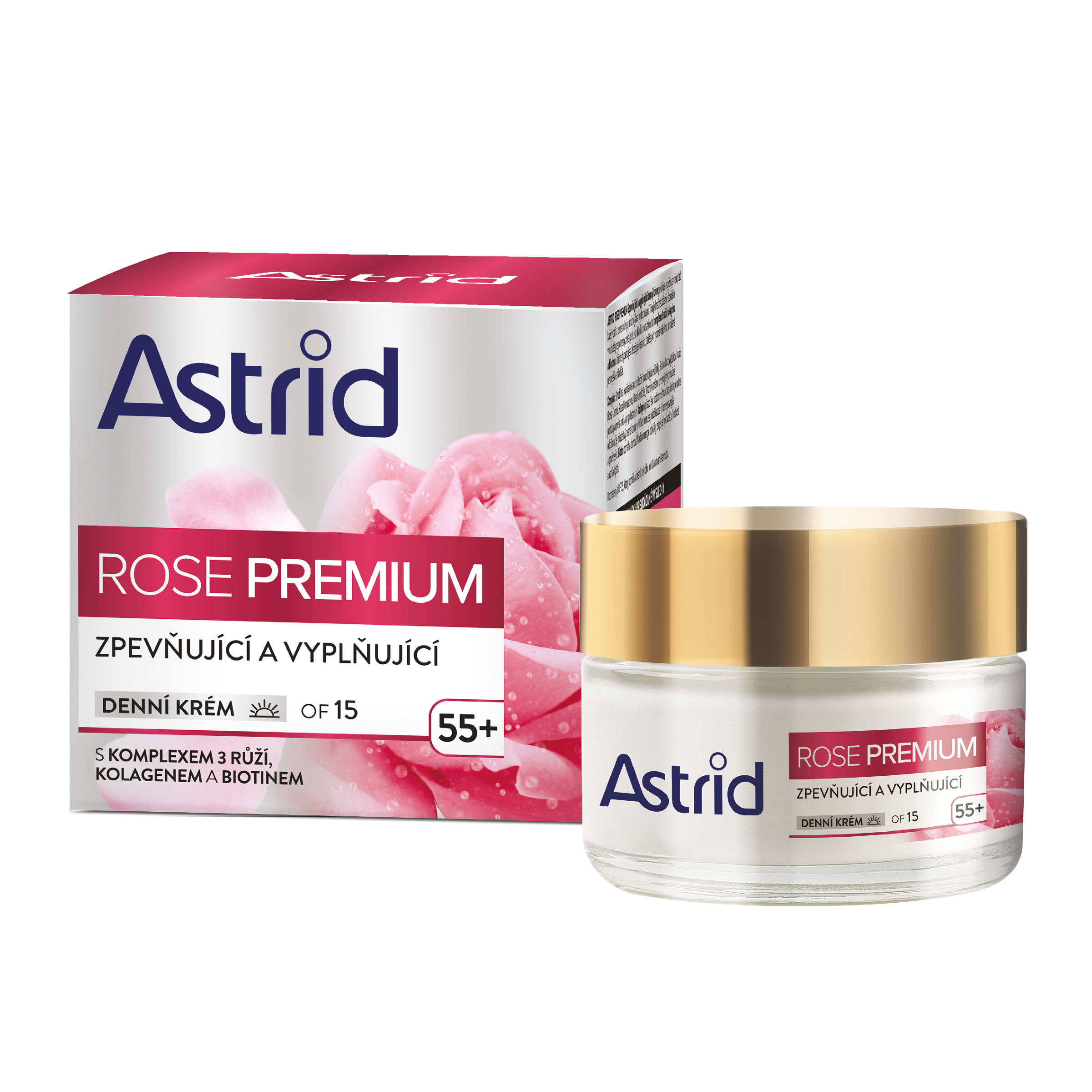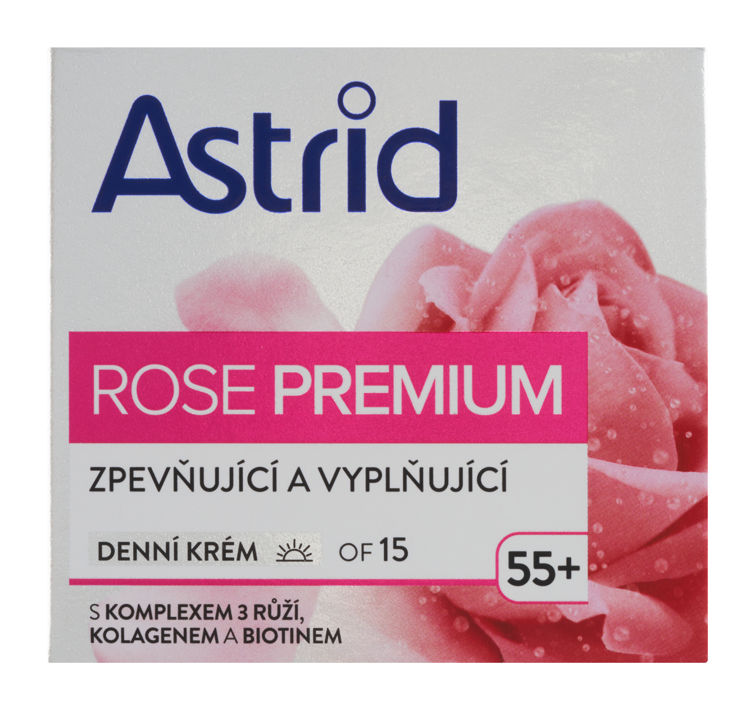 Astrid Rose Premium Zpevňující a vyplňující denní krém posiluje a vyživuje vaši pleť každý den a zanechává jí pružnější a hydratovanou. Toto jedinečné složení, speciálně vyvinuté pro potřeby zralé pleti, se skládá z inovativního komplexu 3 růží, kolagenu a biotinu. Účinně hydratuje a zlepšuje elasticitu, takže pleť vypadá viditelně omlazená, pevnější a hladší. Komplex 3 růží má vynikající antioxidační a zklidňující účinky. Pochází z výtažků 3 růží (Rosa Canina, Rosa Damascena, Rosa Centifolia), které jsou známé pro své hydratační, protizánětlivé a anti-aging vlastnosti. Kolagen působí jako podpůrná struktura pleti a pomáhá udržovat její mladistvý tvar a kontury. Díky tomu se pokožka zdá výrazně pevnější a pružnější. Biotin pomáhá obnovit hladinu energie pokožky, zlepšuje hydrataci, hladkost a vzhled pleti. Obohacený o OF 15, který pomáhá chránit pokožku před známkami stárnutí.