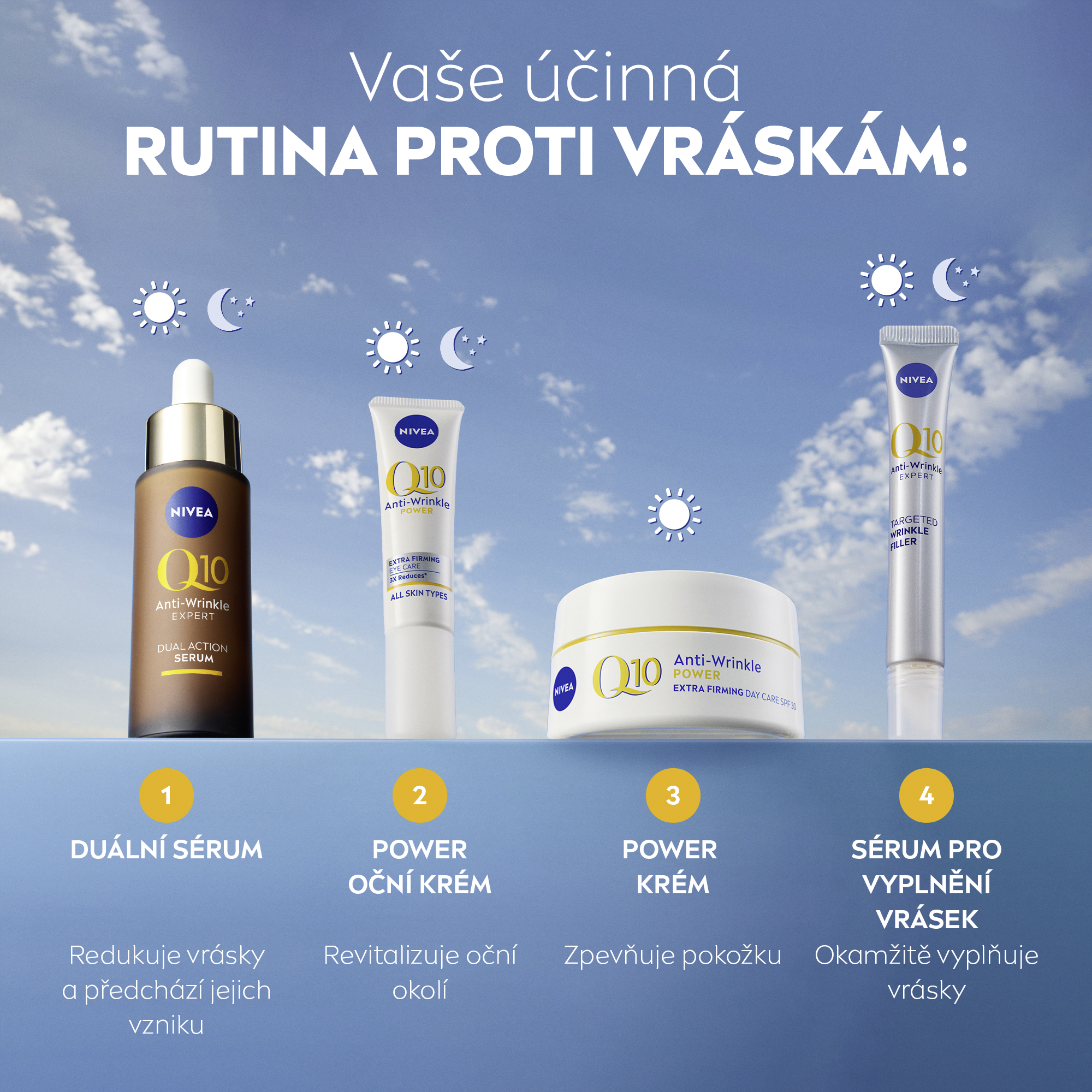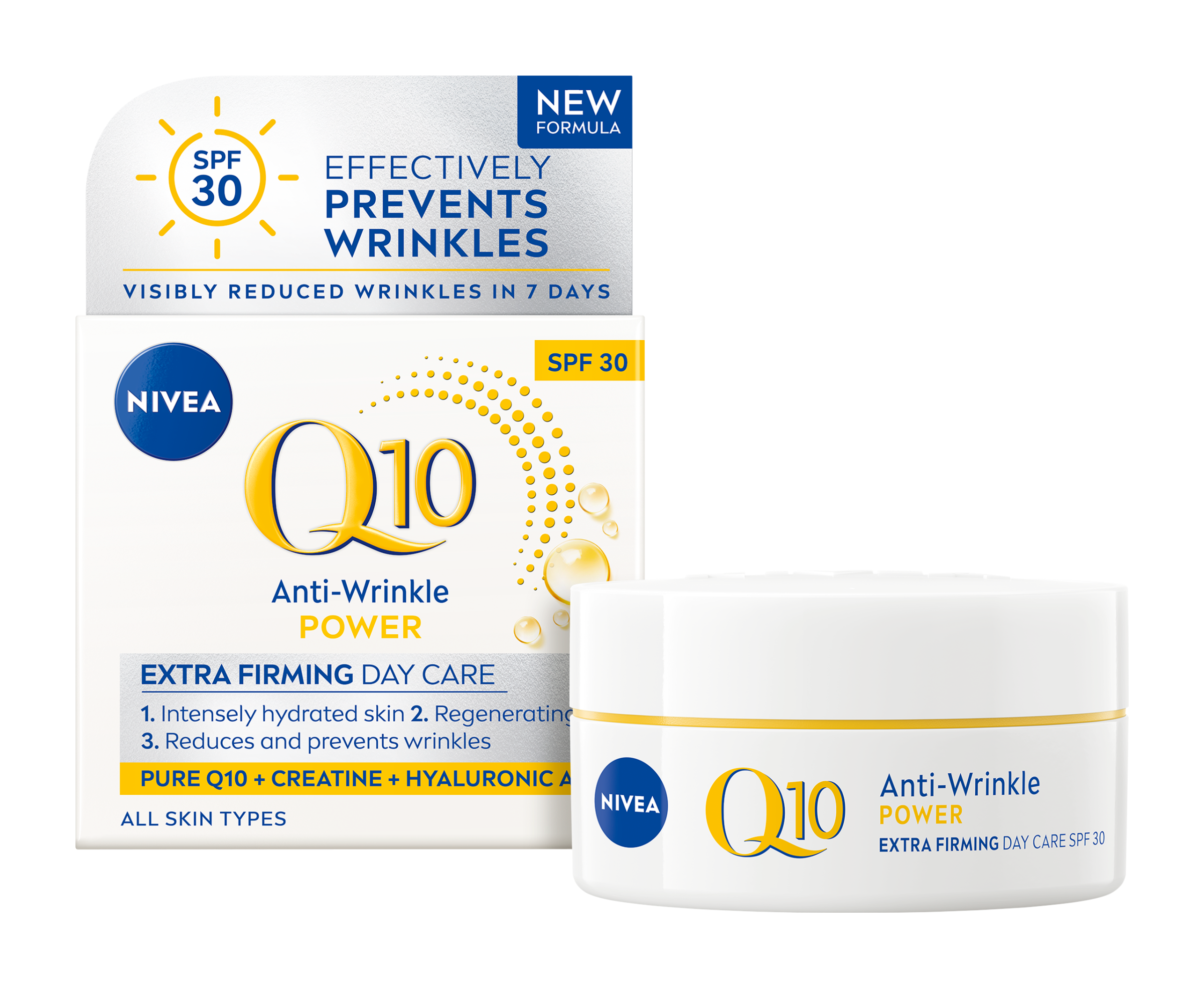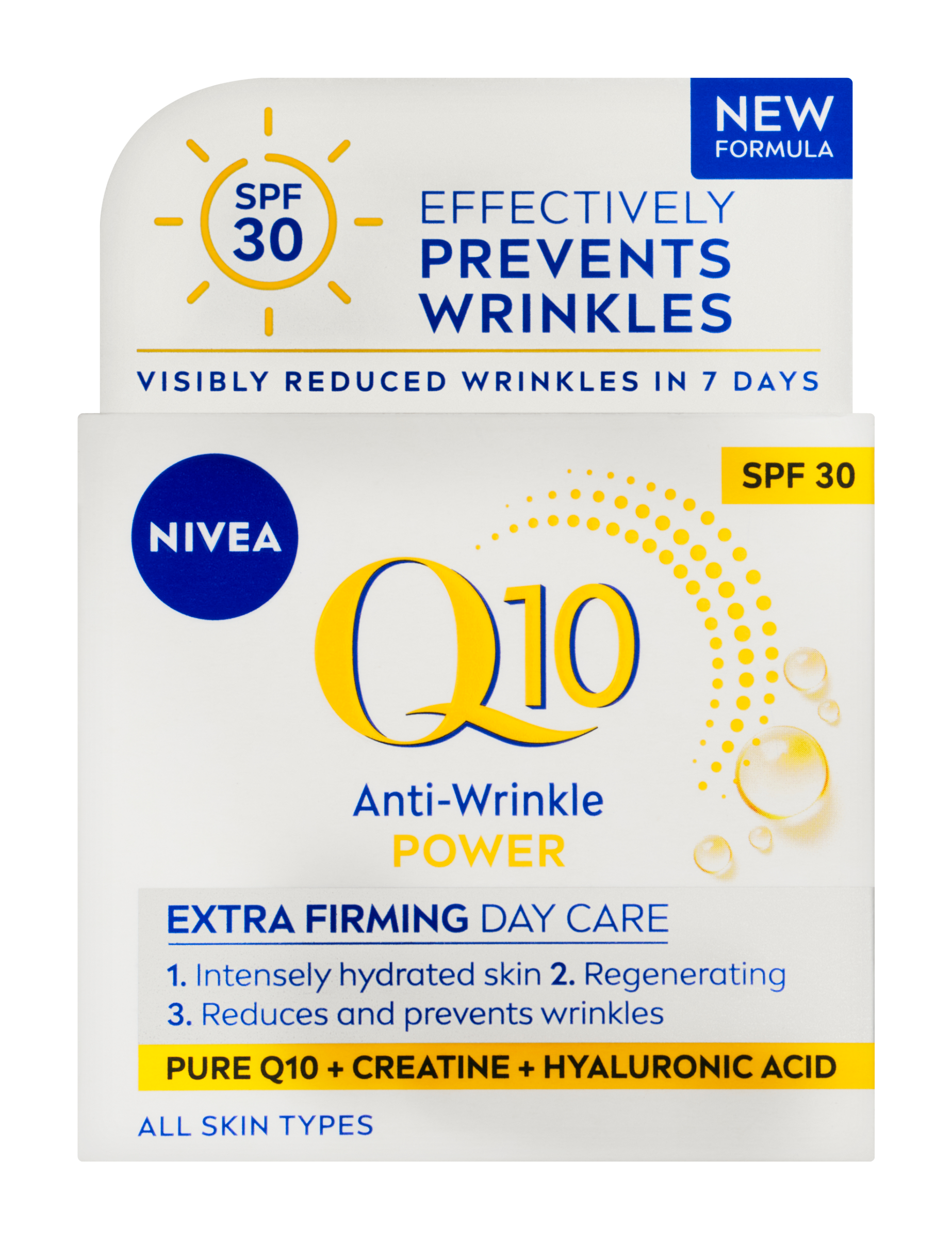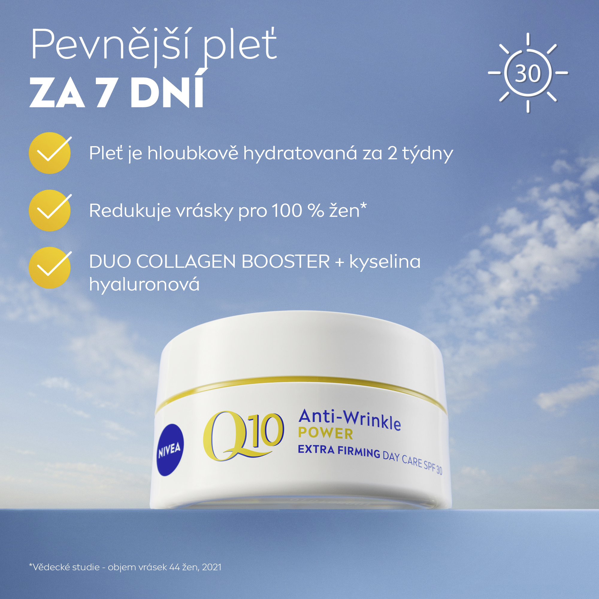 Nivea® Zpevňující denní krém proti vráskám Q10 Power OF 30 chrání pleť před UVA/UVB zářením způsobujícím předčasné stárnutí pleti.