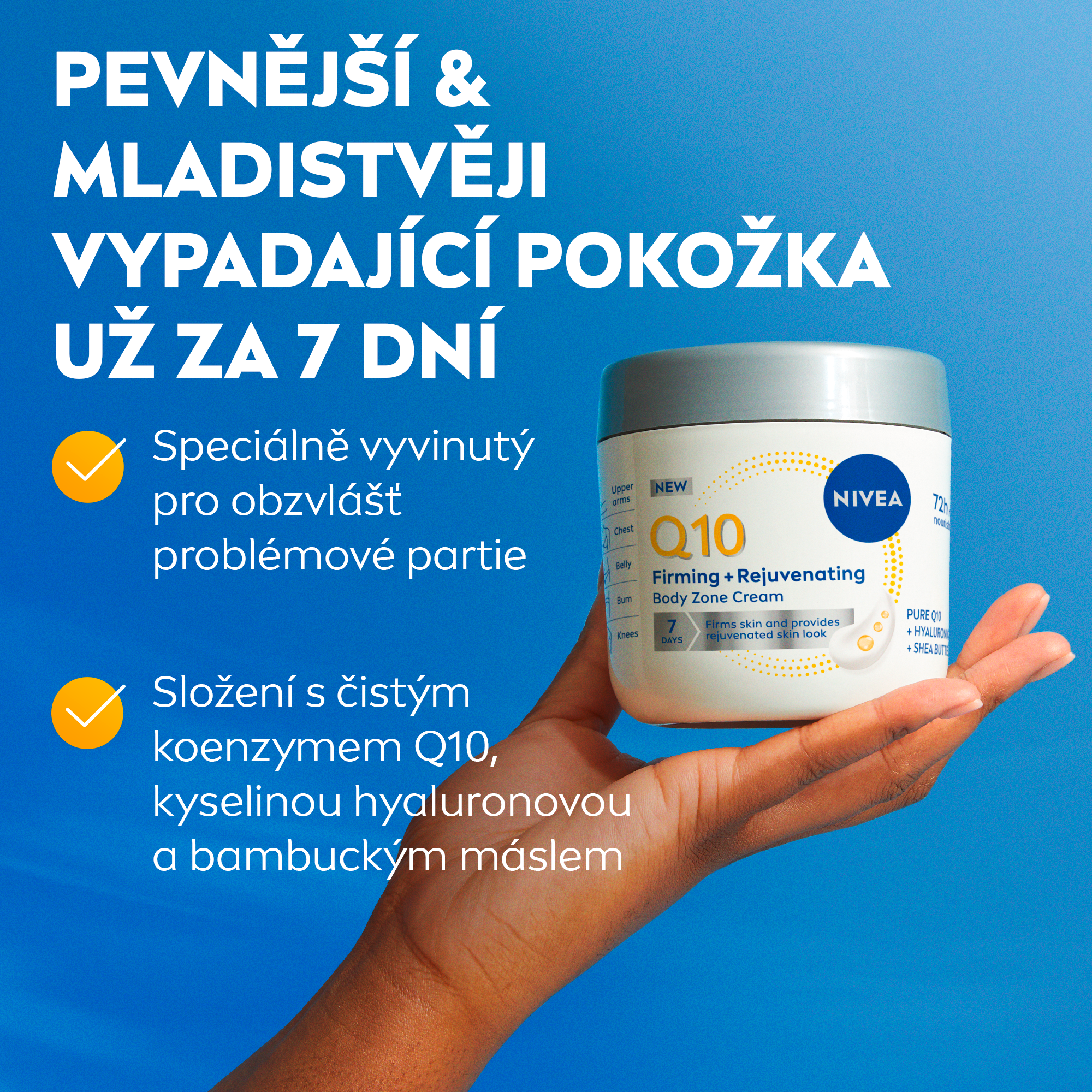 Trápí vás povolená a mdle vypadající pokožka? Vyzkoušejte novinku od NIVEA Zpevňující a remodelační krém, který je speciálně vyvinutý pro obzvlášť problémové partie. Viditelně zpevňuje pokožku na bříšku, zadečku i dekoltu. Obsahuje čistý koenzym Q10, který stimuluje tvorbu kolagenu a působí také jako silný antioxidant. Kyselina hyaluronová a bambucké máslo pokožku hloubkově vyživují a hydratují až na 72 hodin. Výsledkem je už za 7 dní viditelně pevnější a mladistvěji vypadající pokožka, která je vypnutá a na dotek hebká. Zpevňující krém je vhodný pro všechny typy pokožky a seženete ho ve výhodném 400ml balení.