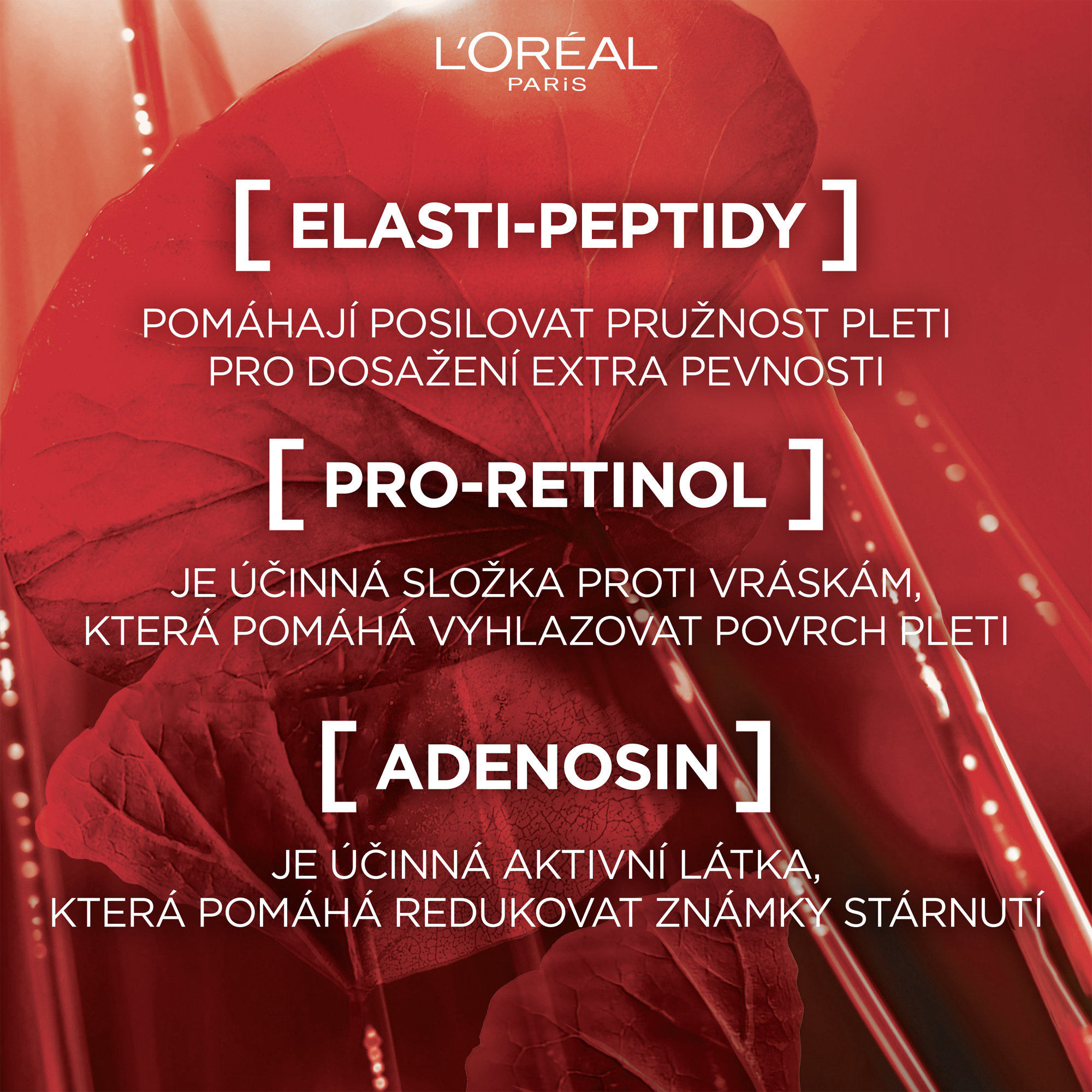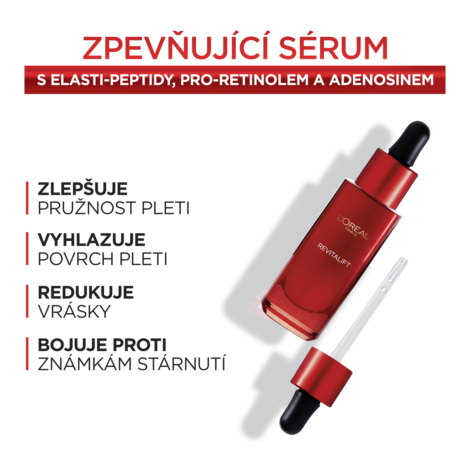 Zpevňující sérum s elasti-peptidy, pro-retinolem a adenosinem zlepšuje pružnost pleti, vyhlazuje povrch pleti, redukuje vrásky a bojuje proti známkám stárnutí. Elasti-peptidy pomáhají posilovat pružnost pleti pro dosažení extra pevnosti. Pro-retinol je účinná složka proti vráskám, která pomáhá vyhlazovat povrch pleti. Adenosin je účinná aktivní látka, která pomáhá redukovat známky stárnutí.