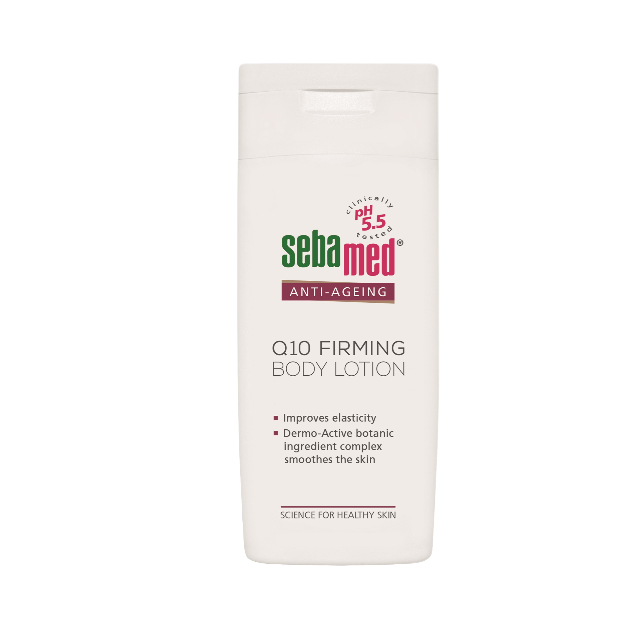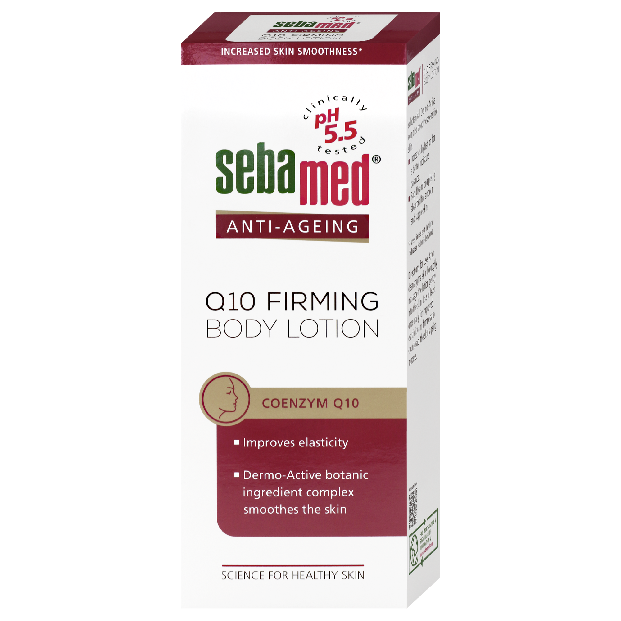 Anti-Ageing tělové mléko s Q10 působí proti stárnutí pokožky. Zvyšuje hydrataci, zlepšuje a obnovuje elasticitu a chrání kůži před příznaky stárnutí. Podporuje obnovu přirozeného ochranného pláště kůže s pH 5,5. Koenzym Q10 aktivuje metabolismus okysličování buněk. Komplex Dermo-Active (inovované rostlinné ingredience v kombinaci s arganovým olejem), výtažek z ječmene a bambucké máslo zvyšují a obnovují elasticitu kůže pro zachování její pevnosti. U 98 % uživatelů bylo prokázáno zpevnění pokožky po 3 týdnech používání. Tělové mléko je vhodné pro pokožku citlivou na vitamin A a produkty s AHA. Rychle se vstřebává bez pocitu mastnoty.