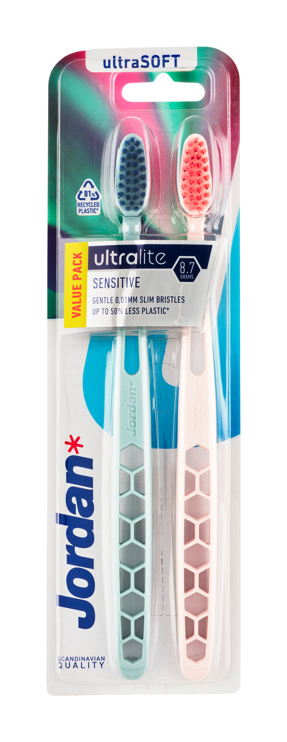 Zubní kartáčky Jordan UltraLite Extra Soft představují novou generaci kartáčků, které spojují šetrnou péči o zuby s moderním ekologickým designem. Kartáček váží pouhých 8,7 gramu a díky inovativnímu šestiúhelníkovému vzoru využívá až o 50 % méně plastu než běžné kartáčky na zuby. Extra měkké štětiny jsou navrženy tak, aby efektivně odstraňovaly zubní plak a zároveň byly maximálně šetrné k dásním a zubům. Rukojeť zajišťuje pevný a pohodlný úchop pro každodenní šetrné čištění.
