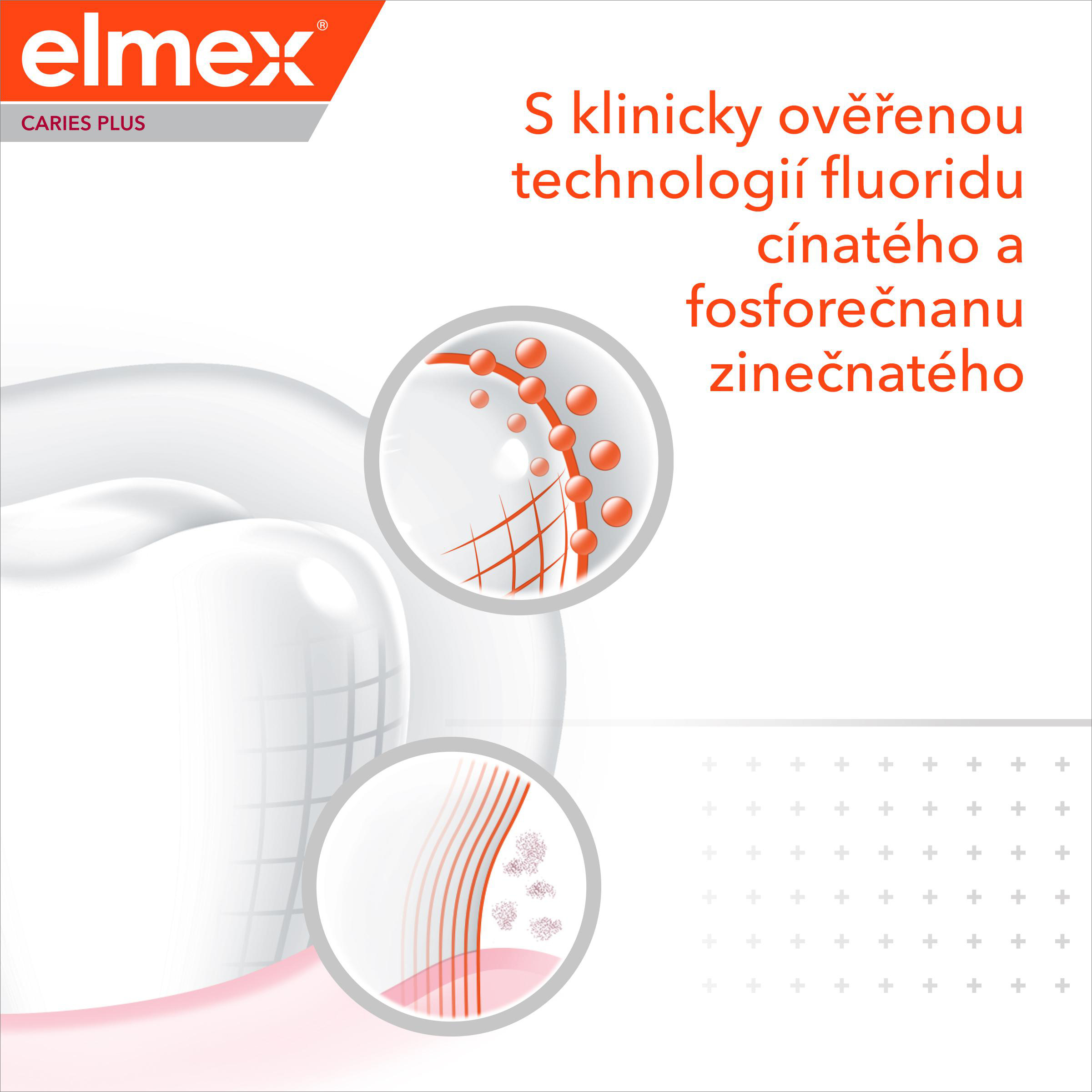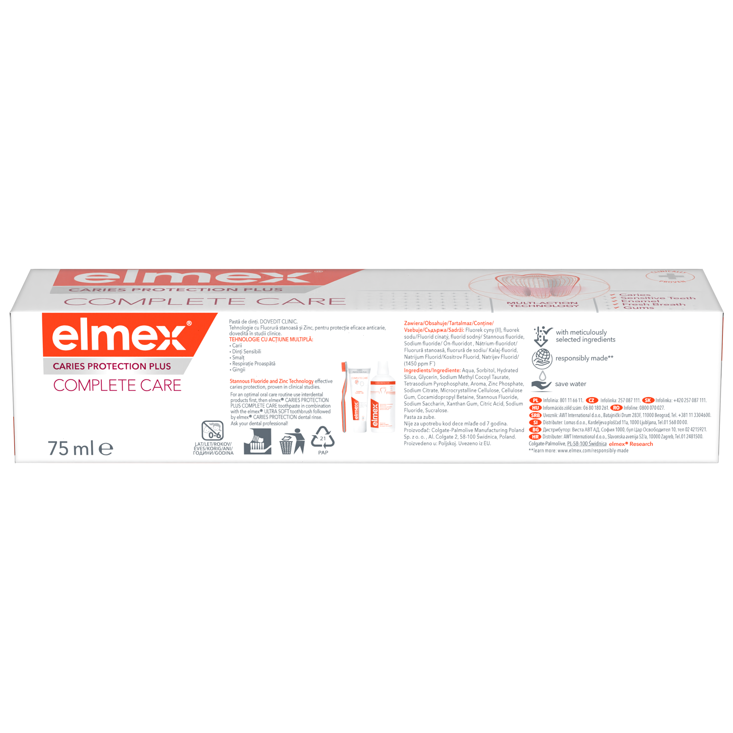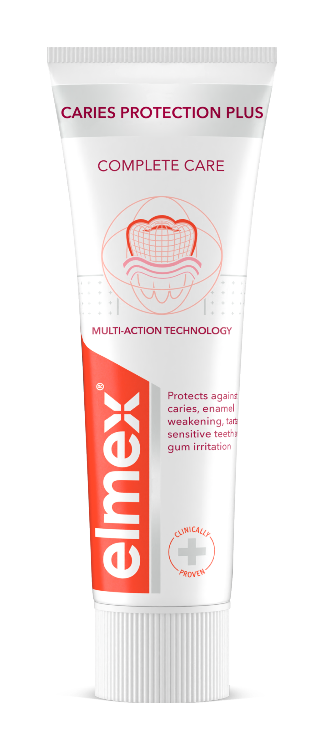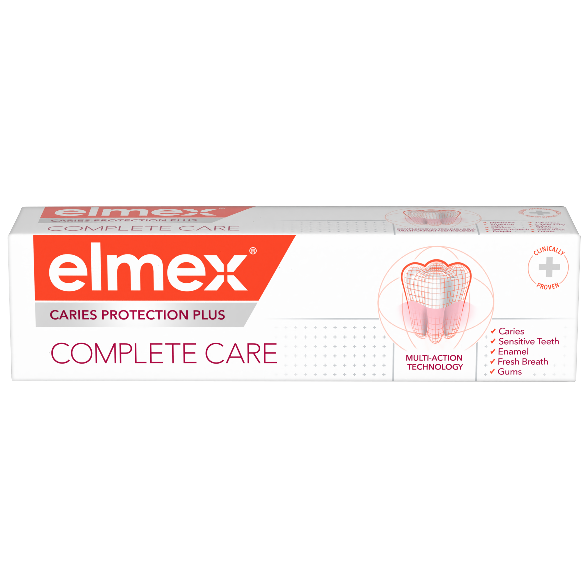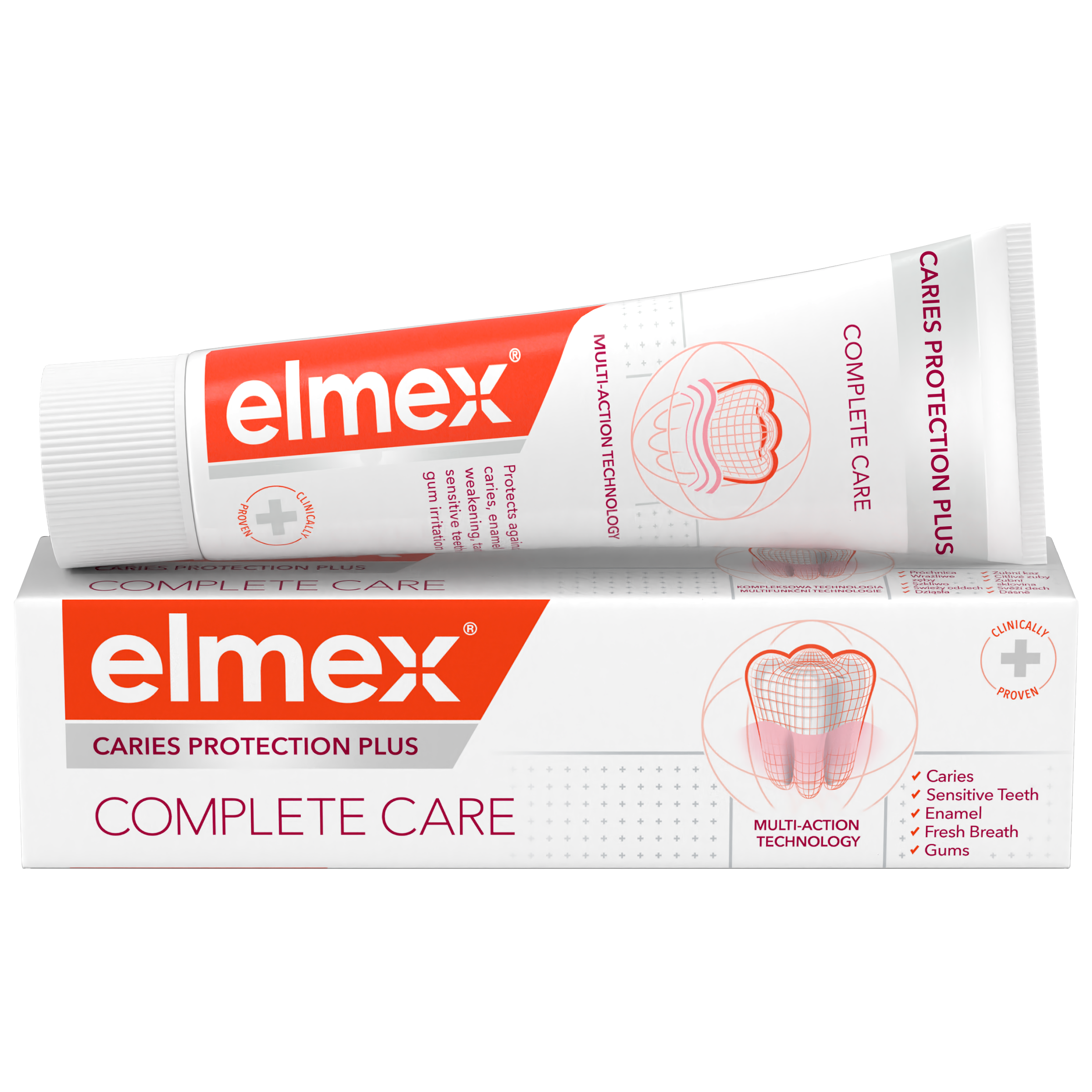 Pečujte efektivně o svá ústa pomocí zubní pasty elmex® Caries Protection Plus Complete Care, která pomáhá předcházet řadě problémů dutiny ústní. elmex® Caries Protection Plus Complete Care obsahuje klinicky ověřenou technologii fluoridu cínatého a fosforečnanu zinečnatého s vysokou účinností v ochraně proti zubnímu kazu při použití dvakrát denně. Zubní pasta při každodenním použití také pomáhá remineralizovat sklovinu a pomáhá chránit před zubním kazem, oslabením zubní skloviny, zubním kamenem , citlivostí zubů a podrážděním dásní. Pomáhá rovněž obnovovat přirozenou bělost vašich zubů. Pečujte o své zuby a ústa pomocí zubní pasty elmex® Caries Protection Plus Complete Care.