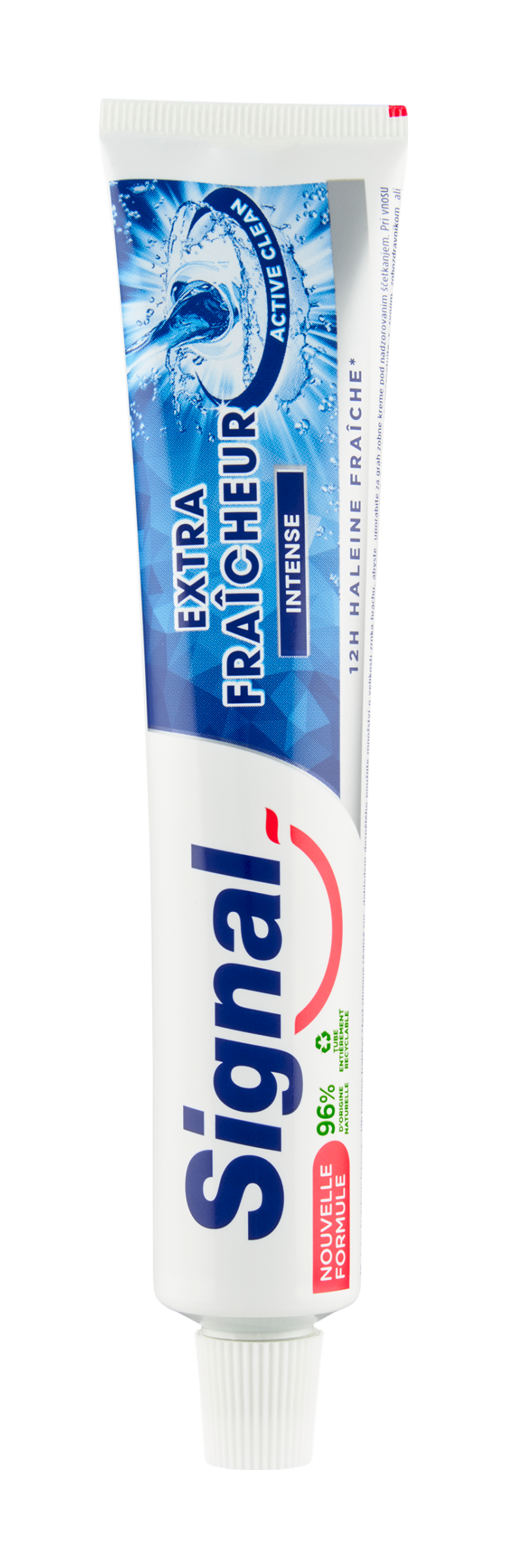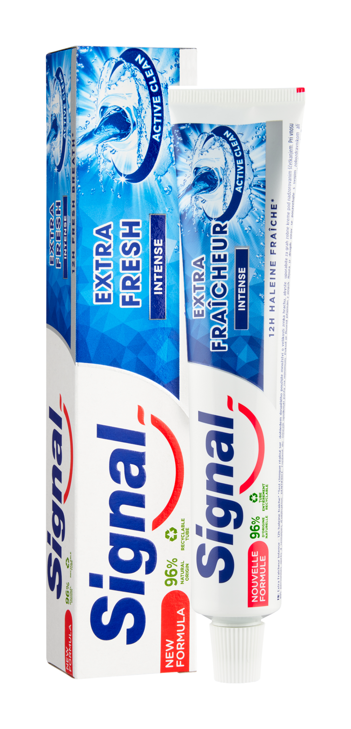 Zubní pasta Signal Extra Fresh Intense zaručuje 12h svěžího dechu díky nové technologii Active Clean. Díky síle zinku garantuje dvojí efekt: antibakteriální účinek a navíc extra svěžest. Dopřejte si intenzivní svěžest!