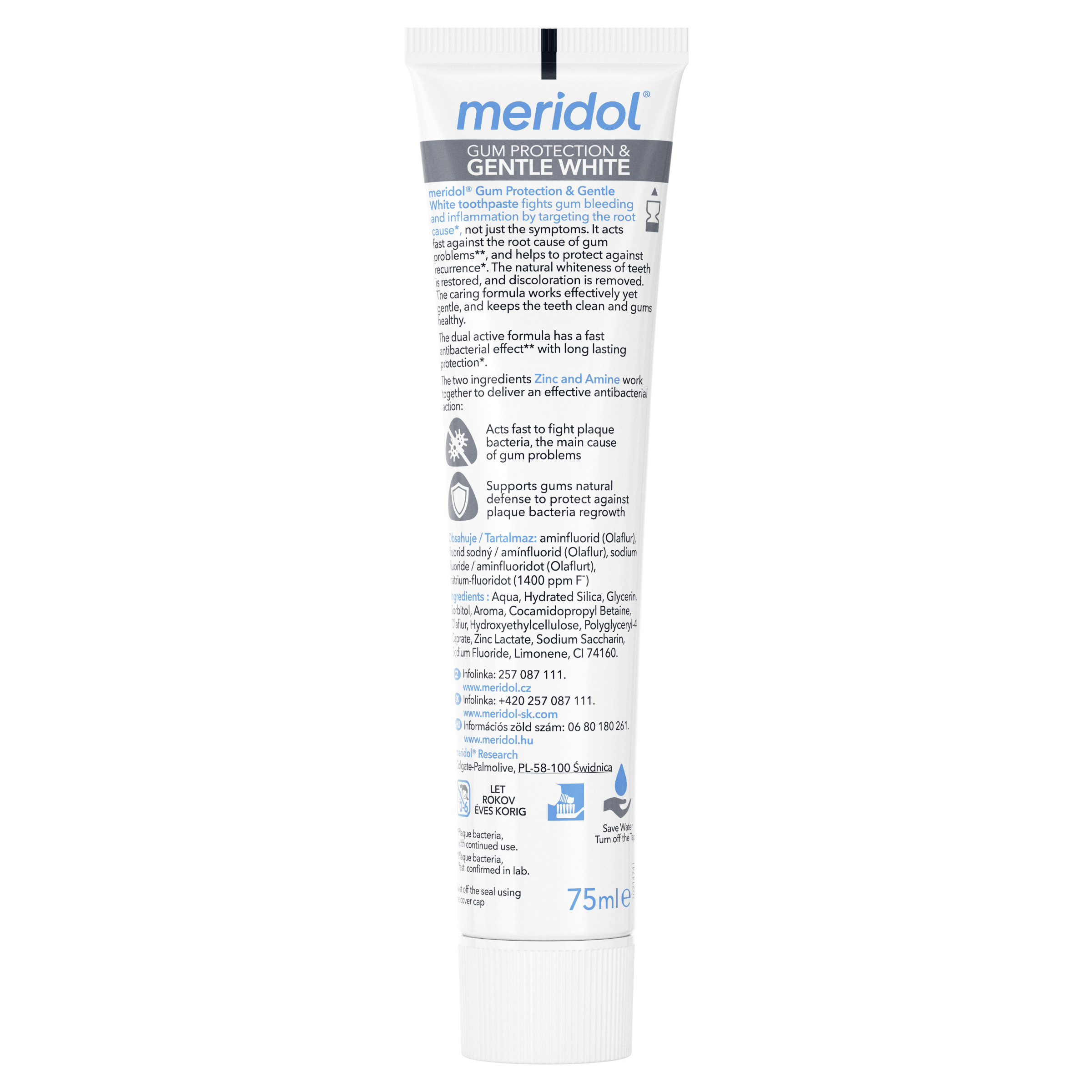 Pečujte o zdraví vašich dásní používáním zubní pasty meridol® Ochrana dásní +jemné bělení. Pomáhá bojovat proti bakteriálnímu plaku, který je příčinou 5 problémů dásní¹: krvácení, zánětu, citlivosti, zápachu z úst a zubního kamene. Naše zubní pasta na problémy s dásněmi pomáhá chránit vaše dásně a je 12x účinnější² v boji proti příčinám krvácení a zánětu dásní. Účinnost je nejen klinicky prokázána, ale pasta je také doporučovaná zubními lékaři³. Naše fluoridová zubní pasta vyvinutá ve spolupráci s odborníky na ústní hygienu obsahuje zinek a aminy ve dvojím aktivním složení, které působí společně v boji s bakteriálním plakem a poskytuje rychlou a dlouhotrvající ochranu⁴. Zubní pasta na problémy s dásněmi také pomáhá chránit před zubním kazem, tvorbou plaku, zubním kamenem, zánětem dásní (gingivitida), citlivostí dásní i parodontitidou. Navíc má novou příchuť a je navržená tak, aby nezanechávala skvrny na vašich zubech a pomáhala obnovit jejich přirozenou bělost.