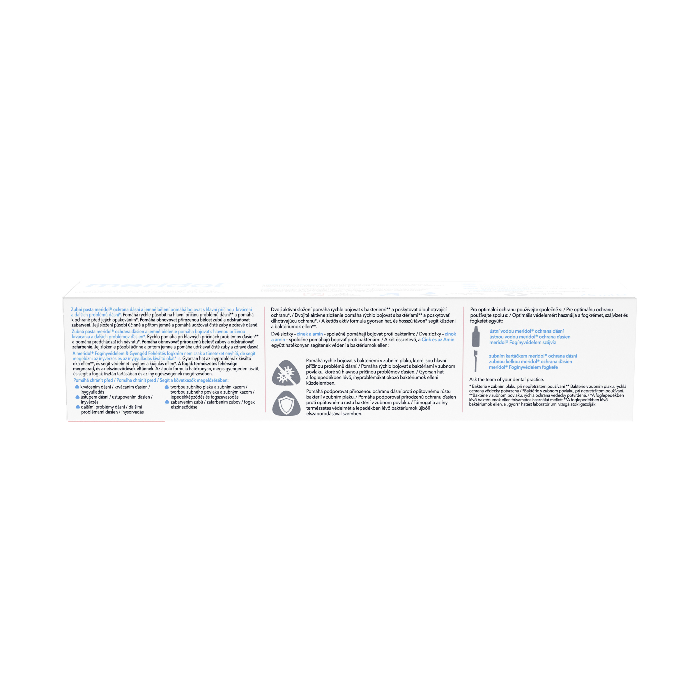 Pro optimální použití kombinujte s: - ústní vodou Meridol - zubním kartáčkem Meridol - zubní nití Meridol Zeptejte se svého zubního lékaře.