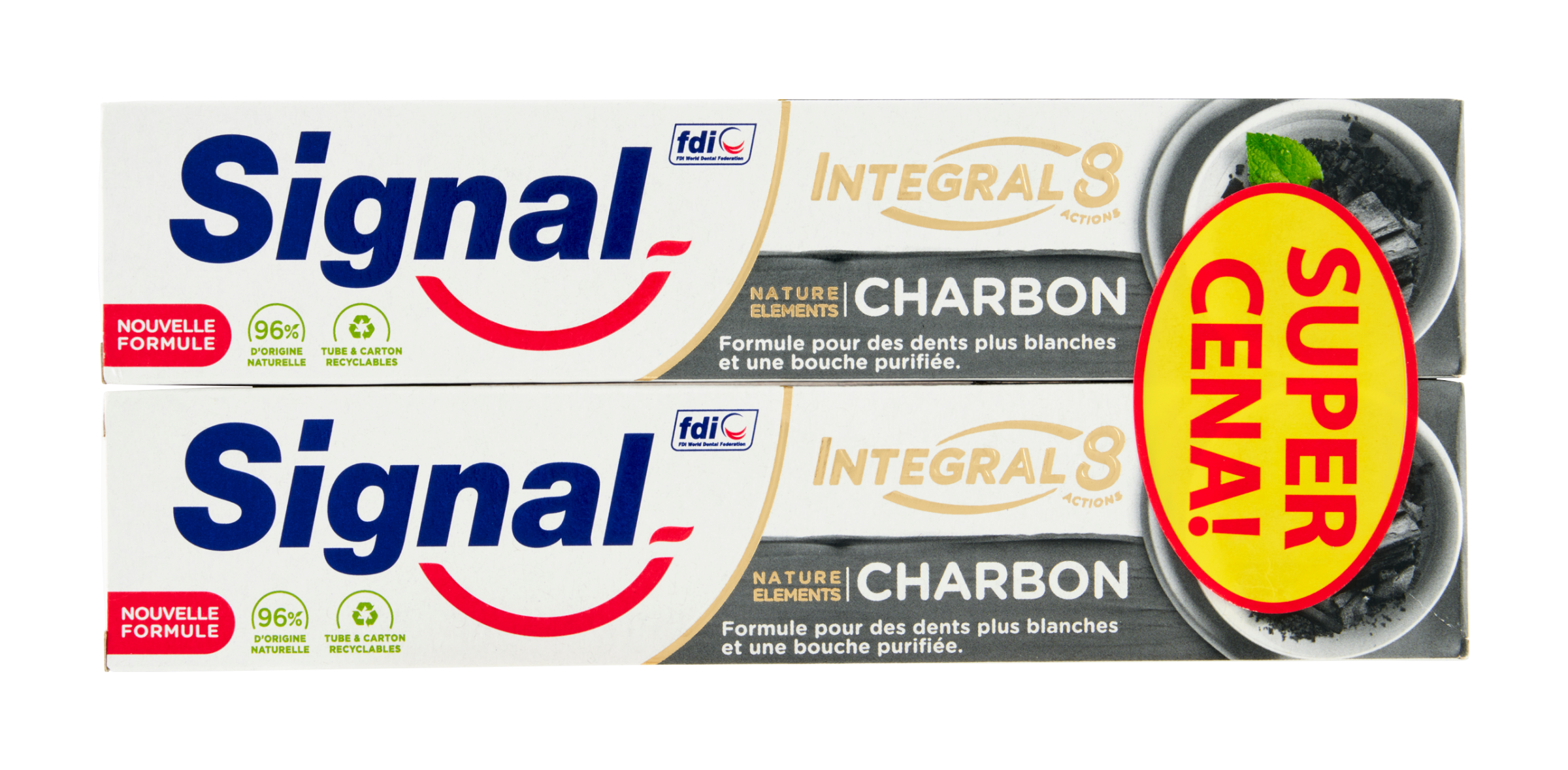 Ještě více přírodních ingrediencí. Plně recyklovatelné balení. Nyní dvě pasty za výhodnější cenu. Všechny zubní pasty z řady Signal Nature Elements nyní obsahují 96% ingrediencí přírodního původu. Naše šetrné složení kombinuje přírodní oleje a zinek, poskytuje kompletní ochranu proti zubnímu kazu. Varianta Charcoal je obohacena práškem z aktivního uhlí, známé pro své čistící a detoxikační vlastnosti. Napomáhá odstraňovat skvrny způsobené jídlem a navrací přirozenou bělost zubů.