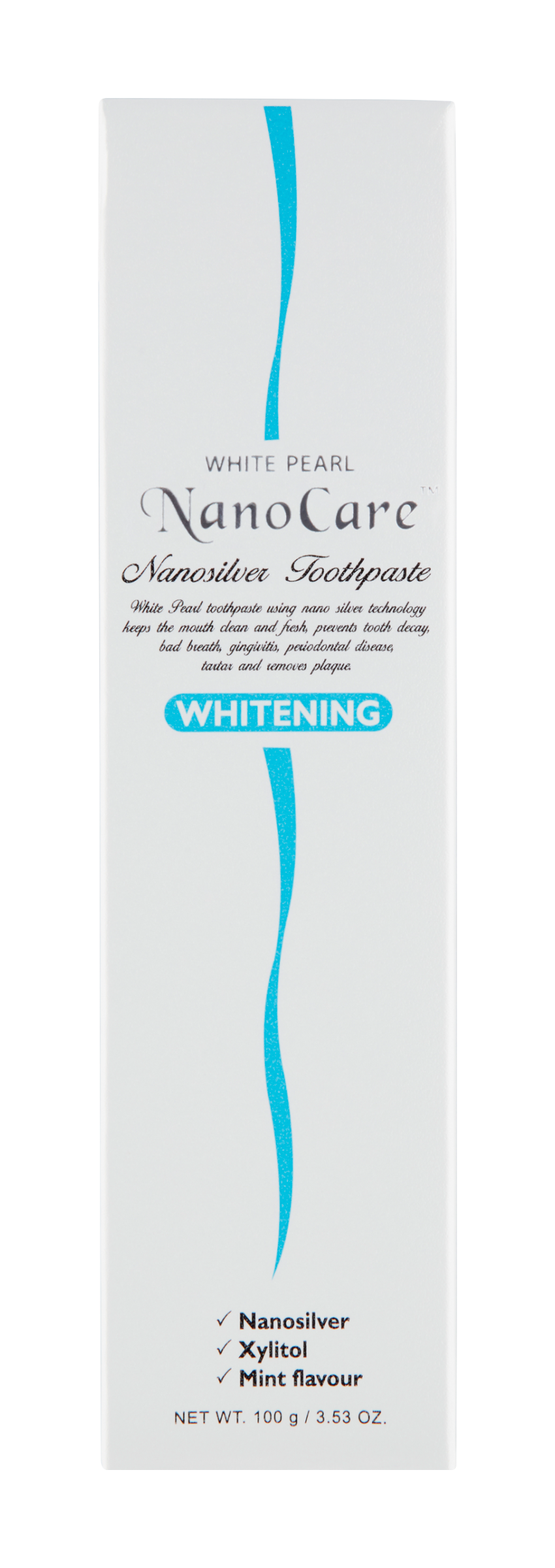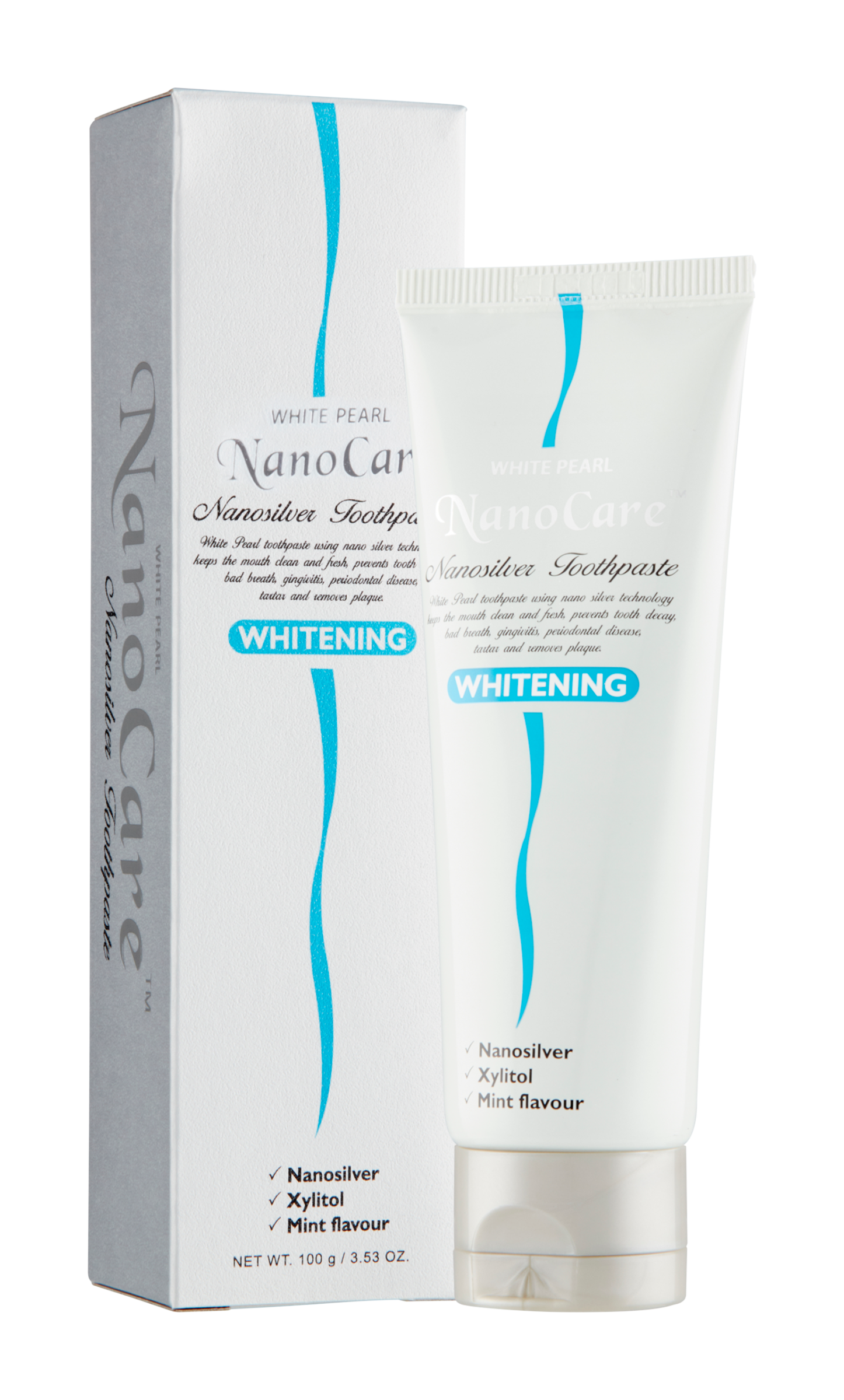 White Pearl NanoCare zubní pasta je velmi efektivní v pomoci předcházení a odstraňování zubního kazu, zánětu dásní, zubního plaku a redukuje nepříjemný zápach z úst. Pomáhá odstraňovat bakteriální povlak na zubech a dásních, který může vést k zánětům dásní a zvyšování kazivosti zubů. Obsahuje částice stříbra, propolis, extrakt ze zeleného čaje a mentolový extrakt. Zvýšený bělící účinek