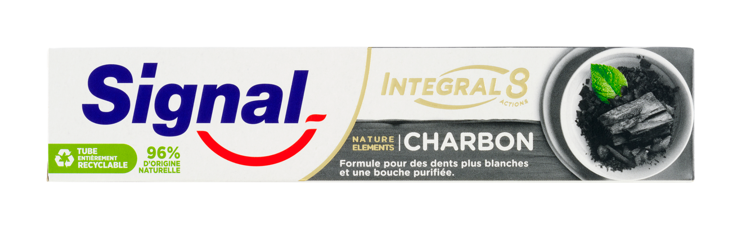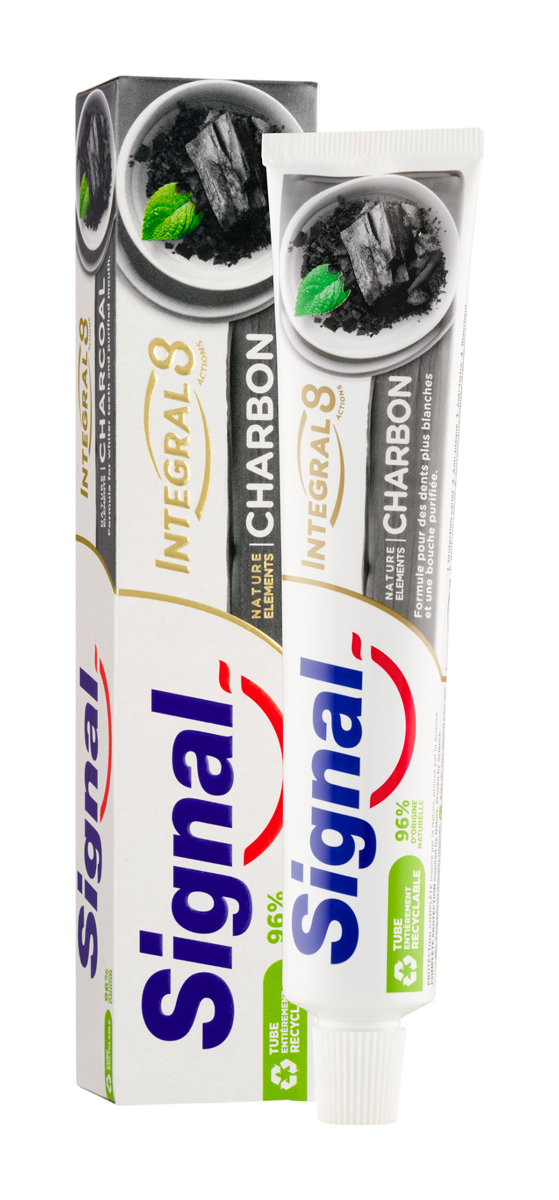 Ještě více přírodních ingrediencí. Plně recyklovatelné balení. Všechny zubní pasty z řady Signal Nature Elements nyní obsahují 96% ingrediencí přírodního původu. Naše šetrné složení kombinuje přírodní oleje a zinek, poskytuje kompletní ochranu proti zubnímu kazu. Varianta Charcoal je obohacena práškem z aktivního uhlí, známé pro své čistící a detoxikační vlastnosti. Napomáhá odstraňovat skvrny způsobené jídlem a navrací přirozenou bělost zubů. Navíc jsou již plně recyklovatelné. Kromě krabičky od zubní pasty nyní můžete recyklovat i tubu. Vnitřní hliníkovou bariérovou vrstva (ABL), která se obvykle používá v laminátu tuby, jsme totiž nahradili recyklovatelnou alternativou z plastu (PBL). V nové tubě jsme použili laminát, který je tenčí (nebo v případě větších tub stejně silný) ve srovnání s předchozími typy tub. Náš přechod na recyklovatelné plasty tedy znamená, že ve výsledku používáme méně plastů - a tuby jsou navíc měkčí a pasta se z nich snáze vymačkává.