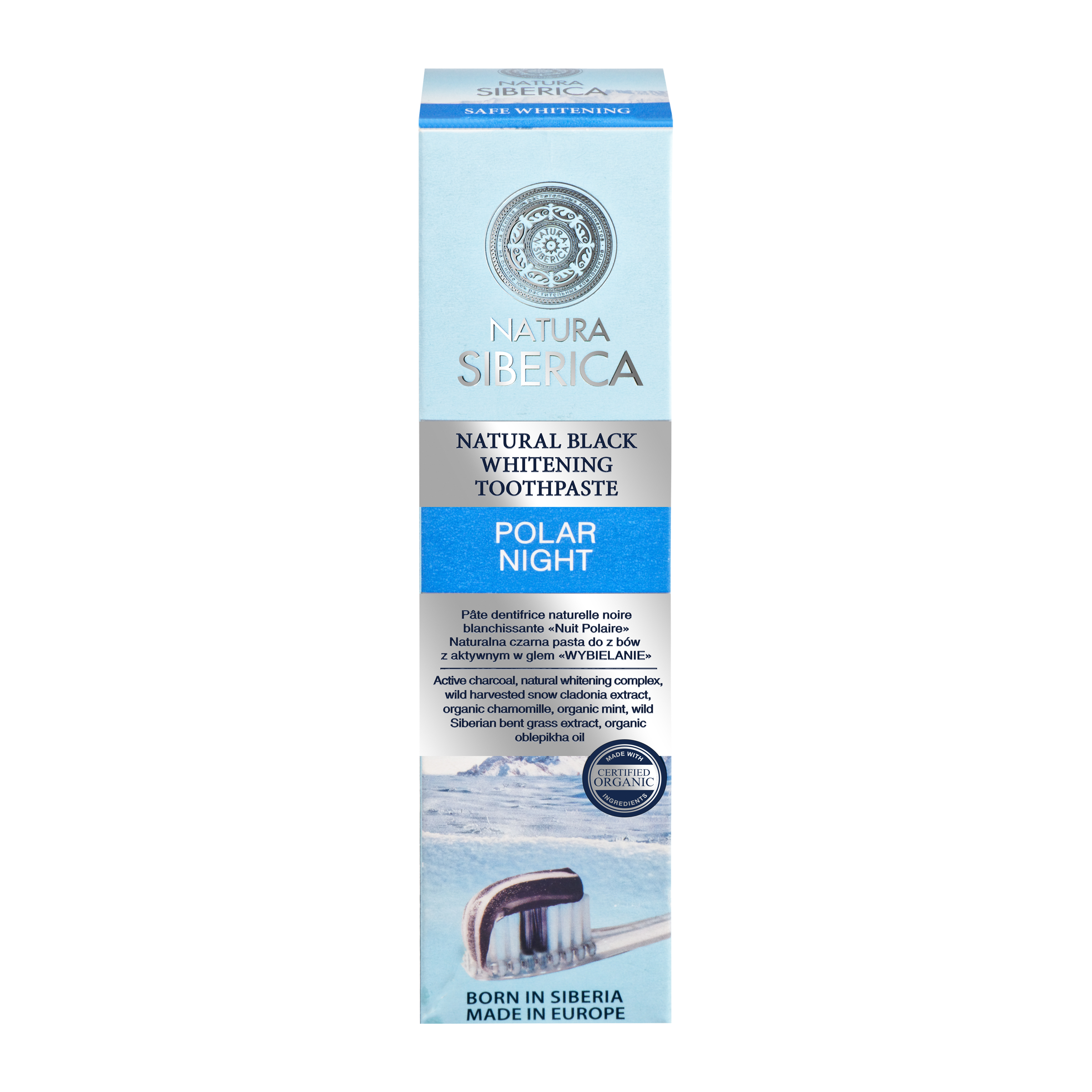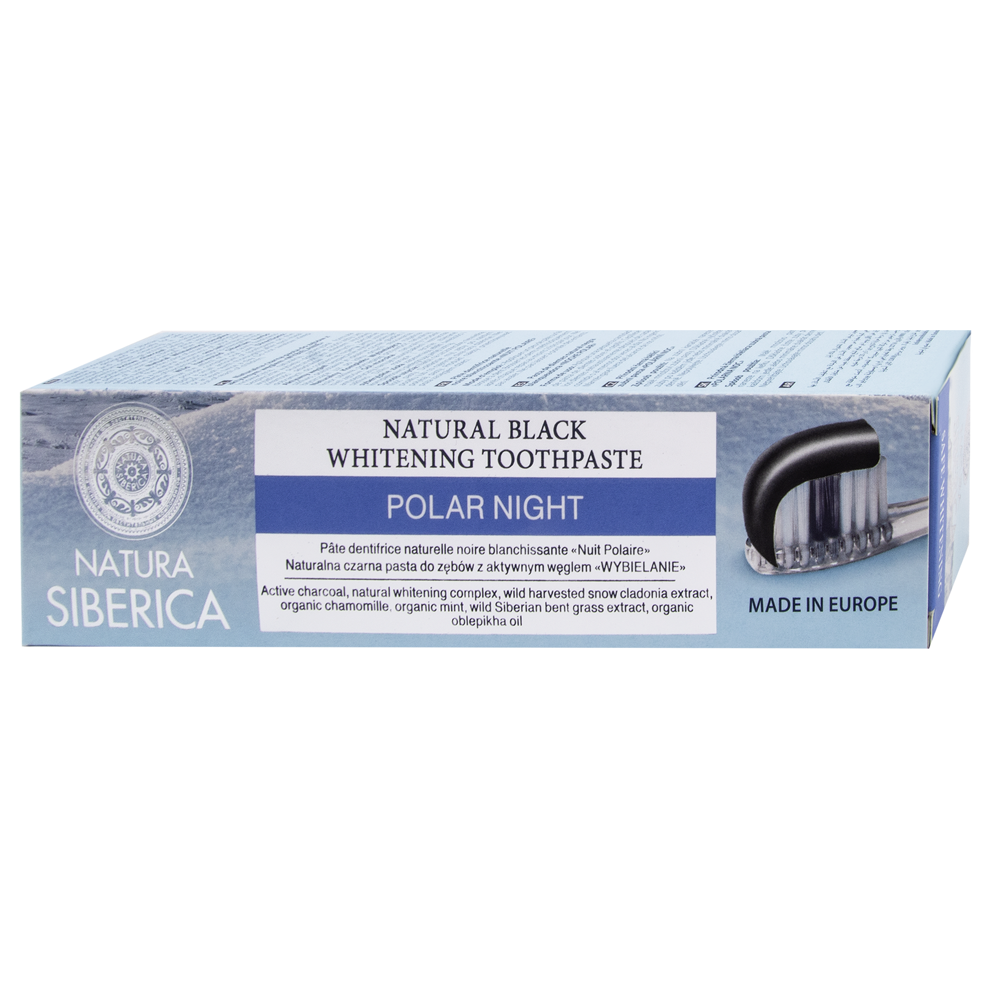 Inovativní černá zubní pasta "Polární noc" je určena pro bezpečné bělení a hluboké čištění. Působí efektivně díky vysoké aktivitě jejích přírodních složek. Aktivní uhlí bezpečně bělí a leští zubní sklovinu, zanechává ji dokonale čisté a hladké po několika dnech užívání. Přírodní bělící komplex jemně zesvětluje barvu skloviny a pomáhá obnovit přirozenou bělost vašich zubů. Mořská sůl je přírodní antiseptikum, zpomaluje růst bakterií a pomáhá posílit zubní sklovinu. Divoké sibiřské byliny maximalizují účinek svěžesti ústní dutin a poskytují komplexní péči.