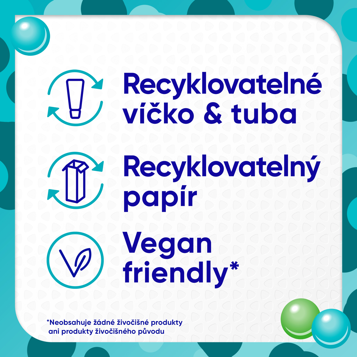 *Při čištění zubů 2x denně a dodržování zásad zdravého stravování. ** Ve srovnání s přirozenou obranyschopností vašich úst. ***Neobsahuje žádné živočišné produkty ani produkty živočišného původu.