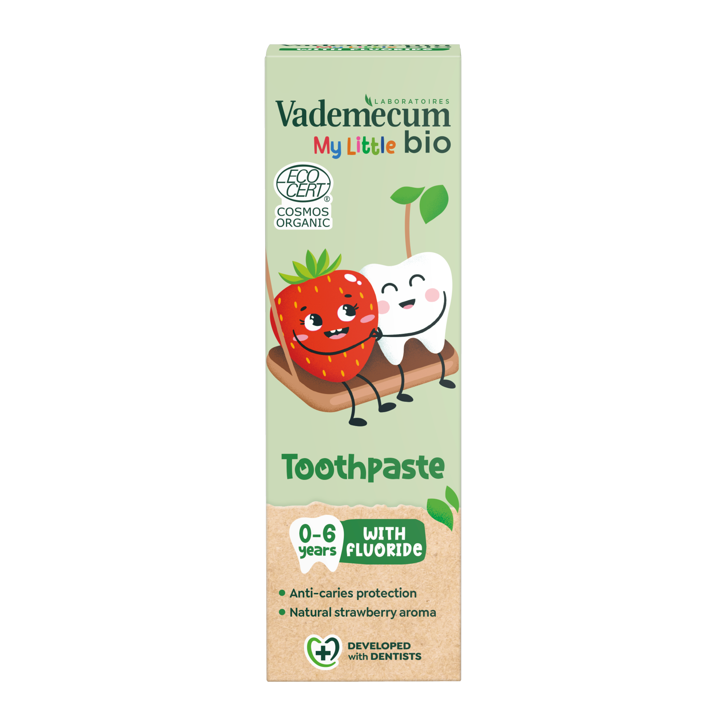 BIO zubní pasta Vademecum s fluoridem pro děti ve věku 0-6 let s přírodní jahodovou příchutí. Certifikováno u Ecocert Greenlife jako COSMOS ORGANIC podle COSMOS standardů: