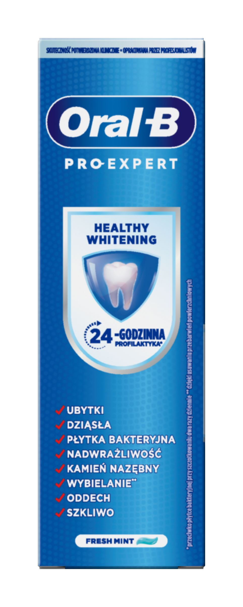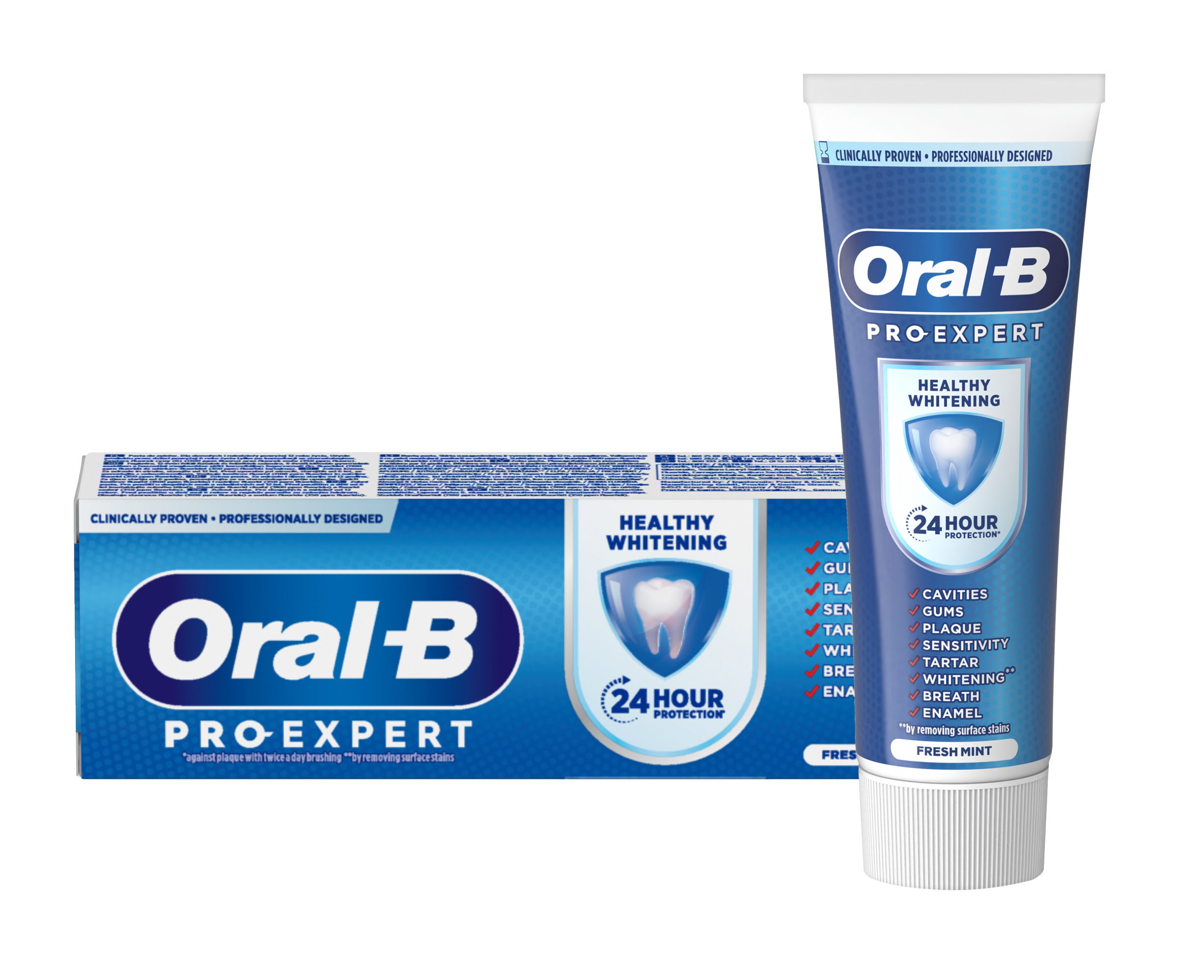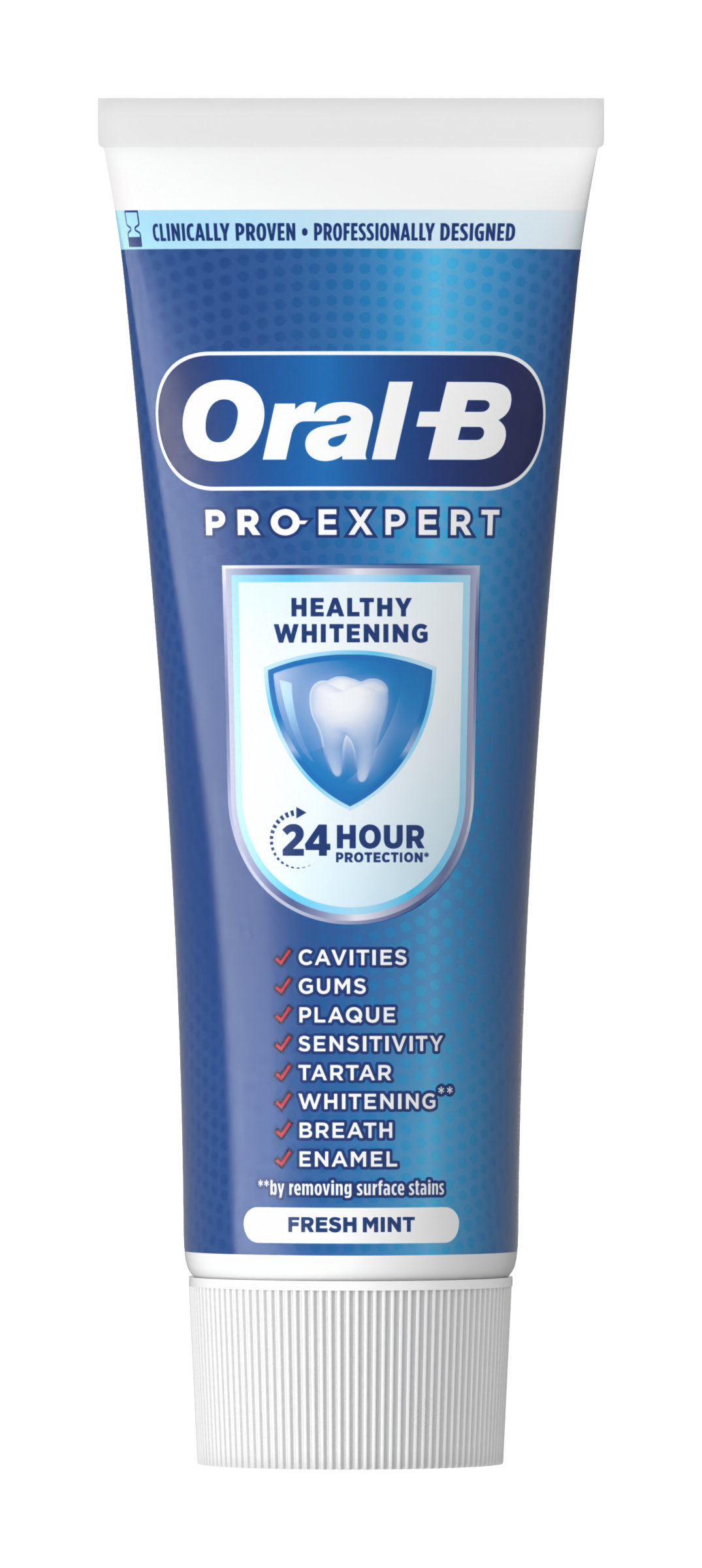 Zubní pasta Oral-B Pro-Expert Healthy Whitening je klinicky ověřená a profesionálně navržená společně se zubními lékaři, bělí odstraňováním povrchových skvrn a při čištění dvakrát denně poskytuje 24hodinovou ochranu proti zubnímu plaku.