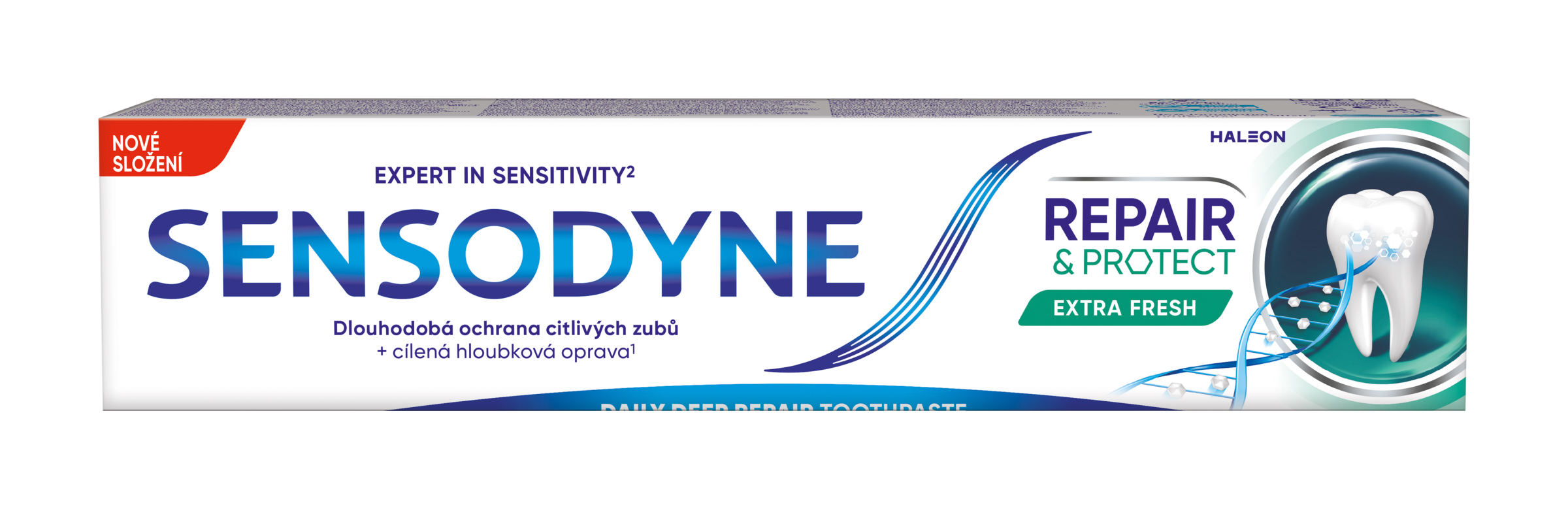 Zubni pasta Sensodyne Repair & Protect Extra Fresh, s technologii NOVAMIN a složením na bázi vápníku, pomáhá opravovat místa obnaženého dentinu tím, že vytváří ochrannou vrstvu podobnou přirozené struktuře zubu. Ulevuje od citlivosti zubů*, abyste si mohli užívat život bez obav z bolesti citlivých zubů. S příchutí Extra Fresh pro svěží dech. - Dlouhodobá ochrana citlivých zubů + cílená hloubková oprava* - Opravuje citlivé zuby* - Nové složení - stejně účinná ochrana před citlivostí zubů ** - Obsahuje fluorid sodný 0,315 % w/w (1450 ppm fluoridu). *Pomáhá opravovat citlivé oblasti zubů tím, že nad nimi vytváří ochrannou vrstvu. Pro dlouhodobou ochranu citlivých zubů používejte zubní pastu dvakrát denně. **při pravidelném čištění zubů 2x denně.