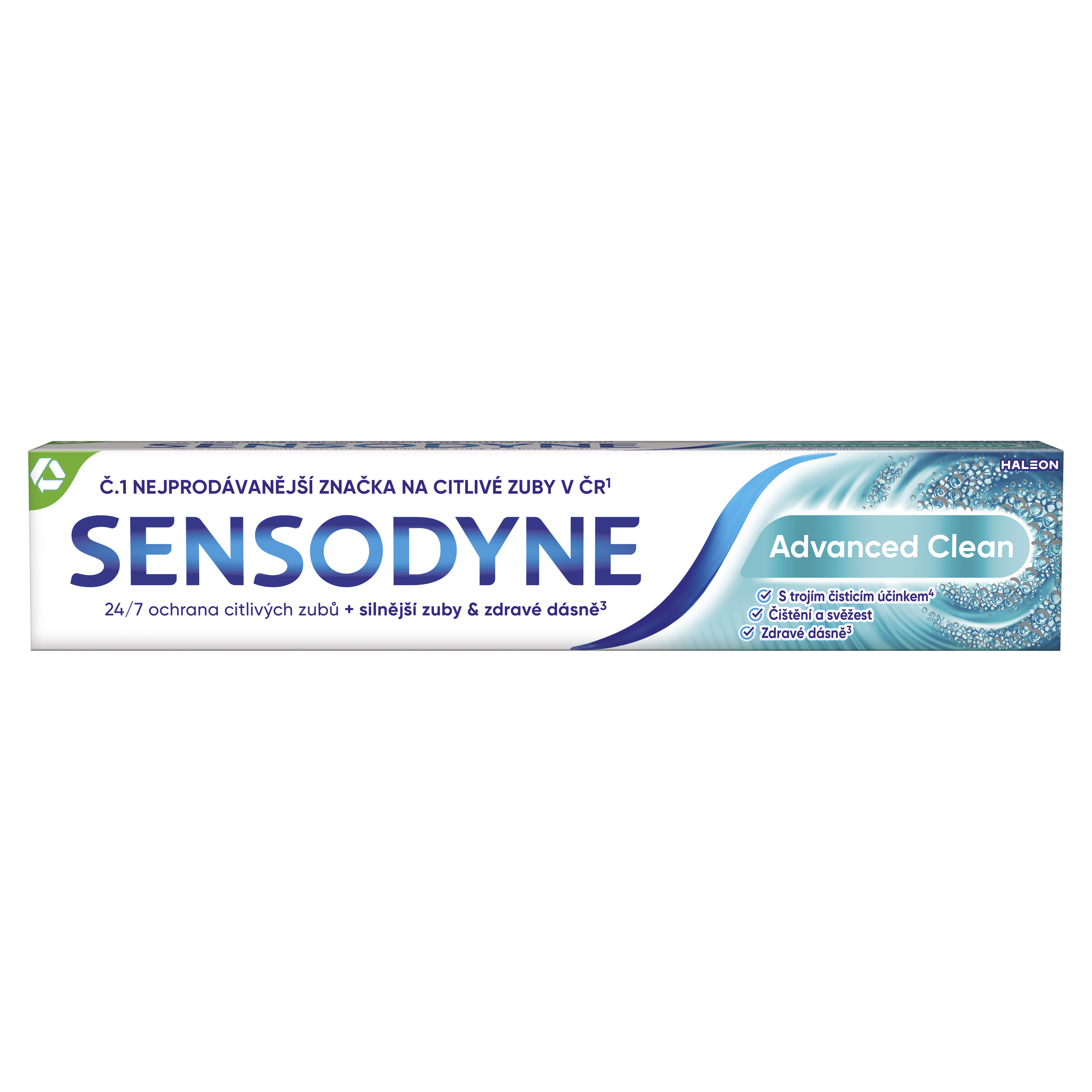 Co Sensodyne poskytuje? Je klinicky testováno, že Sensodyne poskytuje celodenní ochranu citlivých zubů³ a navíc má všechny výhody, které očekáváte od běžné zubní pasty - silnější zuby, zdravé dásně³ a svěží dech. 24/7 ochrana citlivých zubů + silnější zuby³ + zdravé dásně³ + trojí čisticí účinek⁴. Používejte Sensodyne Advanced Clean pravidelně 2x denně: