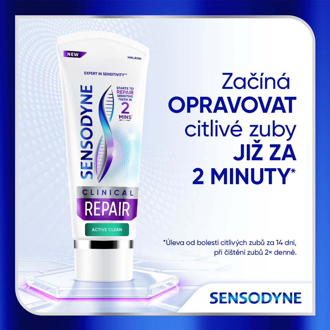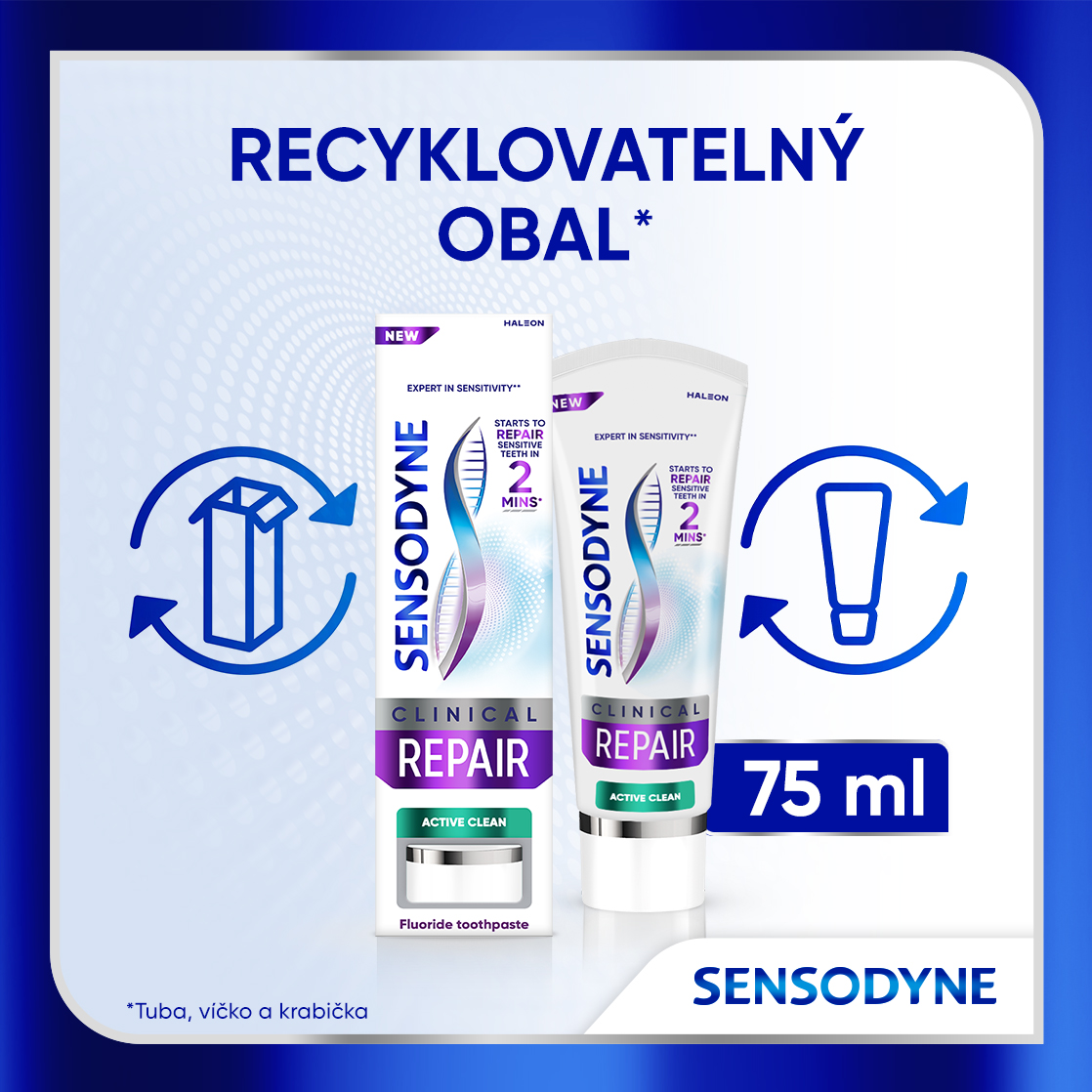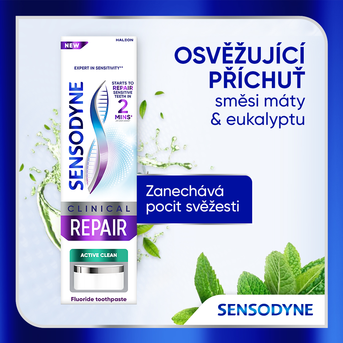 Sensodyne Clinical Repair Mint zubní pasta začíná opravovat citlivé zuby již za 2 minuty* a přináší úlevu od bolesti citlivých zubů**. Sensodyne Clinical Repair je zubní pasta s fluoridem na každodenní použití, která poskytuje péči o citlivé zuby.