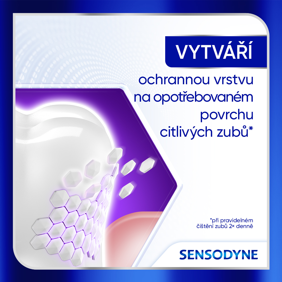 *Úleva od bolesti citlivých zubů za 14 dní, při čištění zubů 2x denně **Při pravidelném čištění zubů 2x denně ***Oproti Sensodyne Repair & Protect Cool Mint