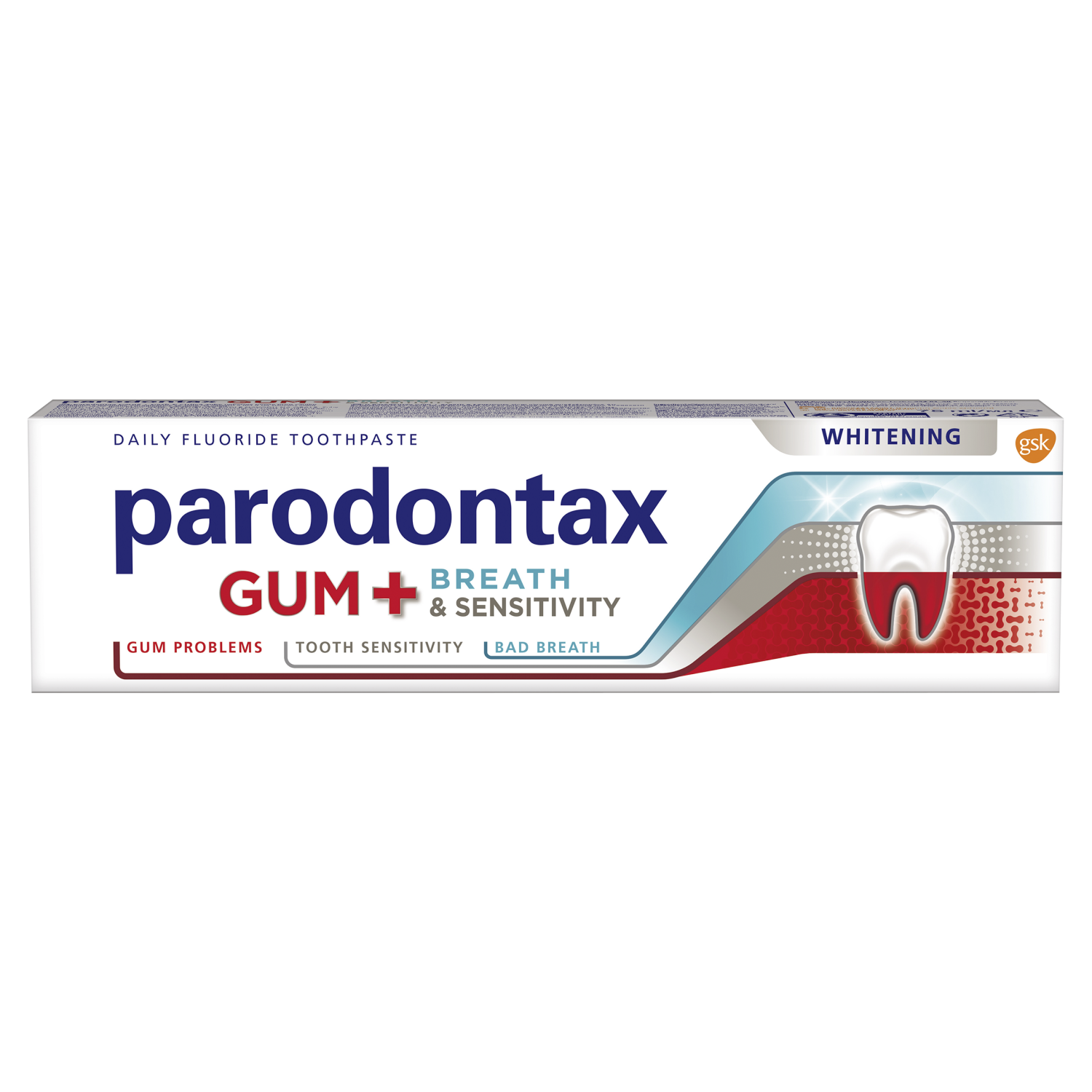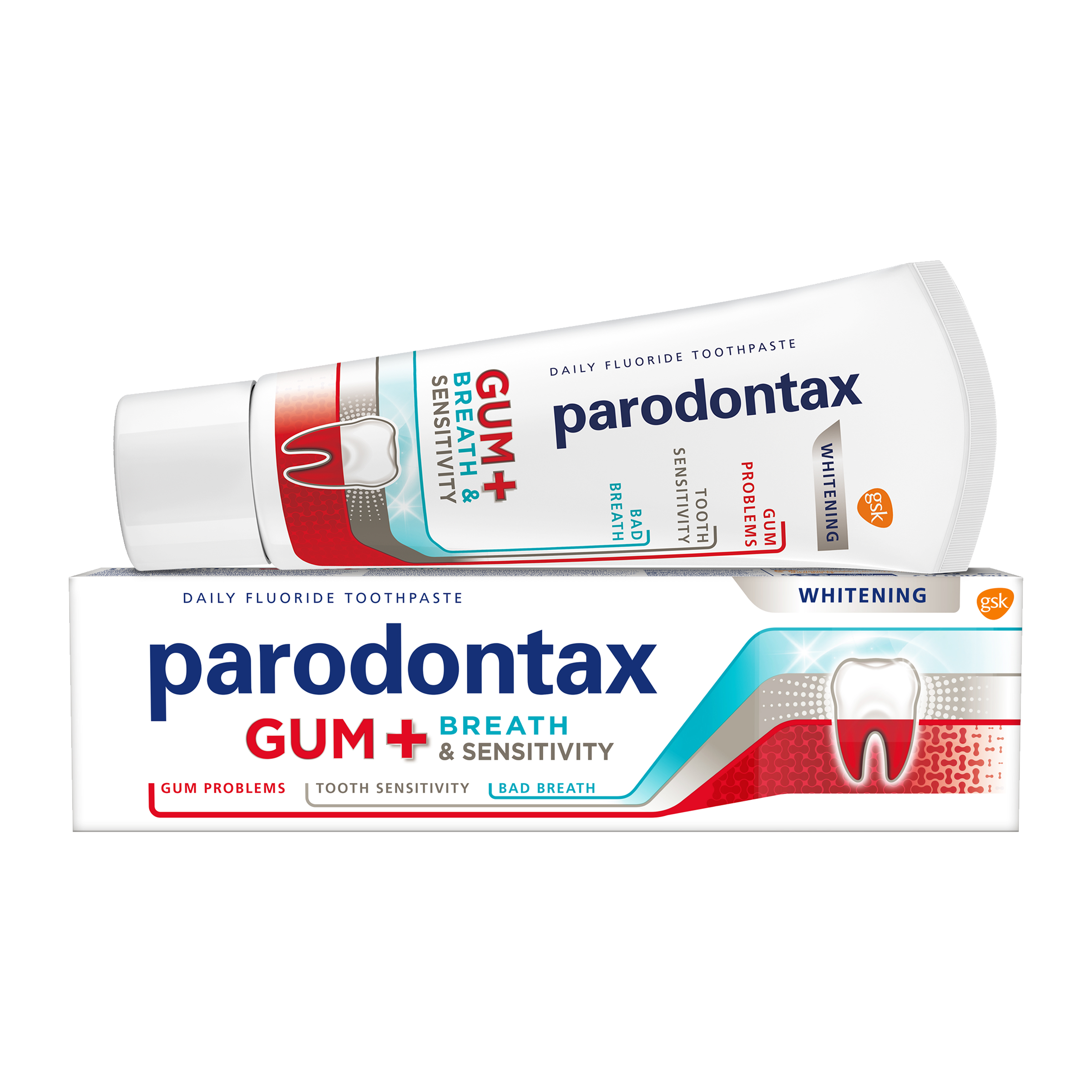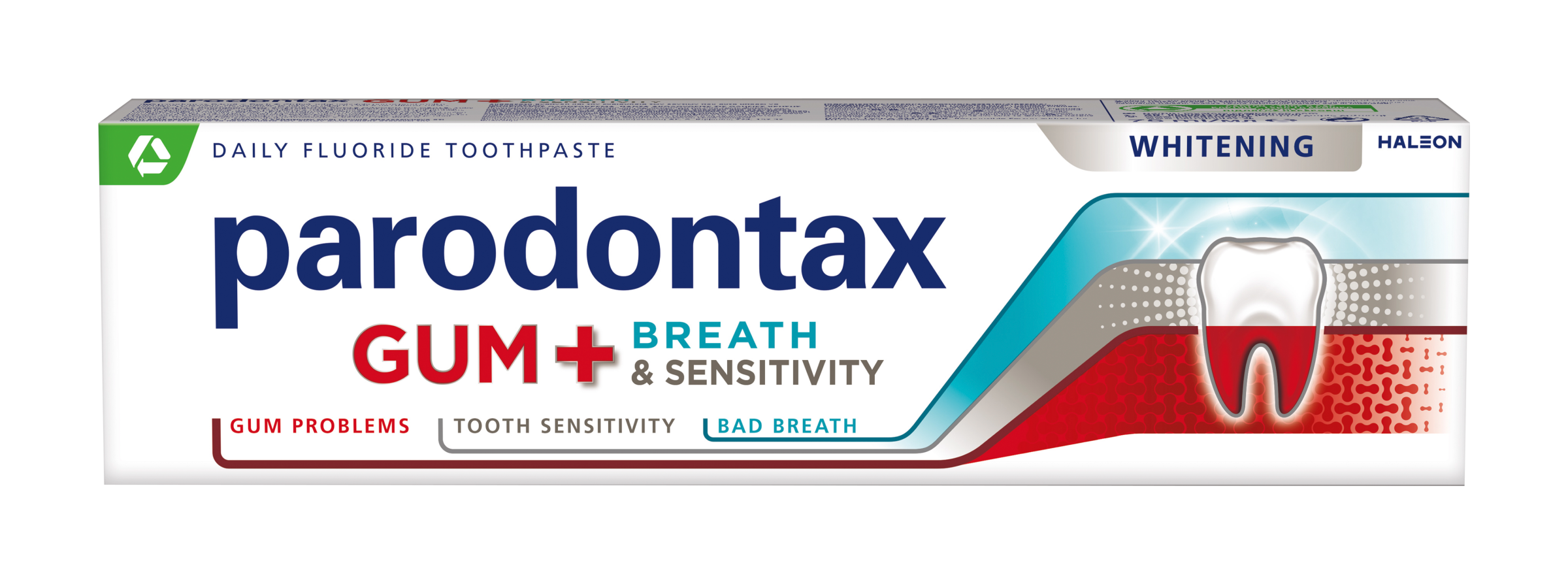 Parodontax dásně + dech & citlivé zuby nebojuje pouze s problémy s dásněmi, ale zaměřuje se také na zápach z úst a na citlivost zubů, které mohou být vyvolané problémy s dásněmi.