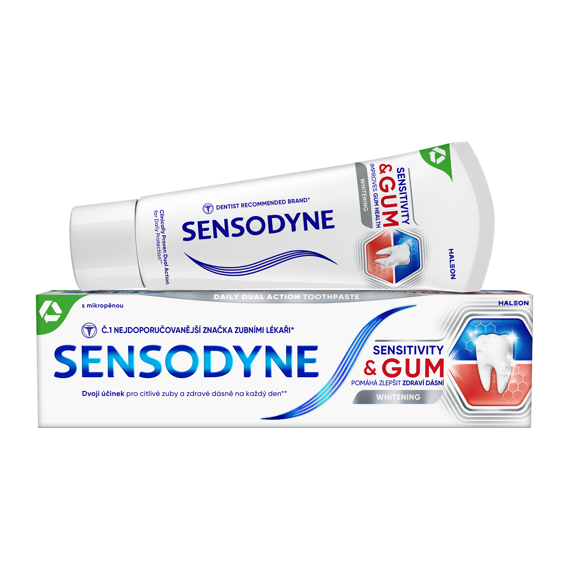 Sensodyne Sensitivity & Gum Whitening s novým složením a mikropěnou pomáhá chránit citlivé zuby a zároveň zmírňovat problémy s dásněmi**. Vytváří ochrannou vrstvu na citlivých místech zubů**. Pomáhá odstraňovat bakteriální zubní plak, proniká i do těžko dostupných míst mezi zuby a podél linie dásní. Efektivně pomáhá odstranit skvrny a obnovit přirozenou bělost zubů**. Zubní pasta s fluoridem pro každodenní použití pro silné a zdravé zuby. Dvojí účinek pro citlivé zuby a zdravé dásně na každý den**.