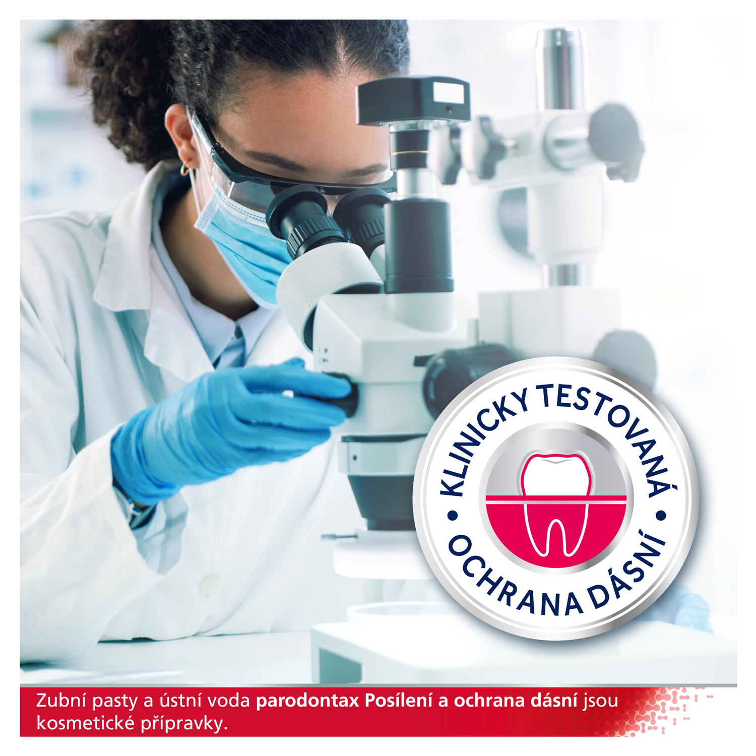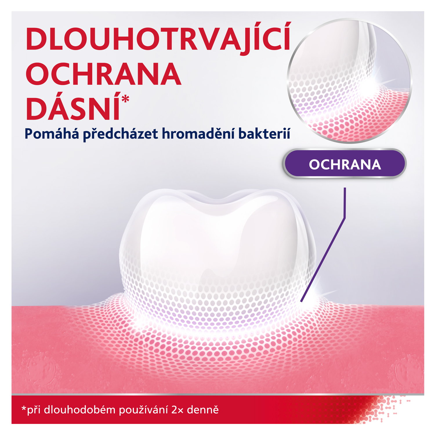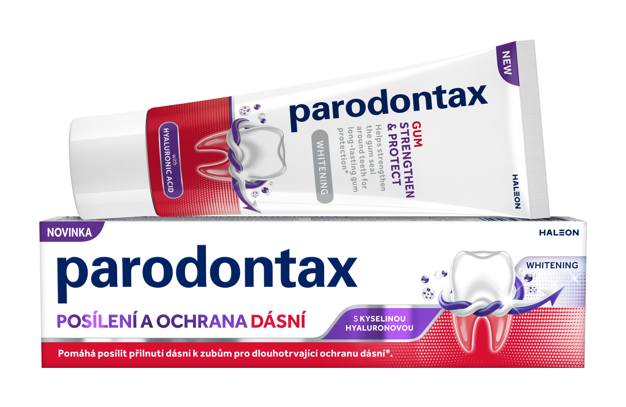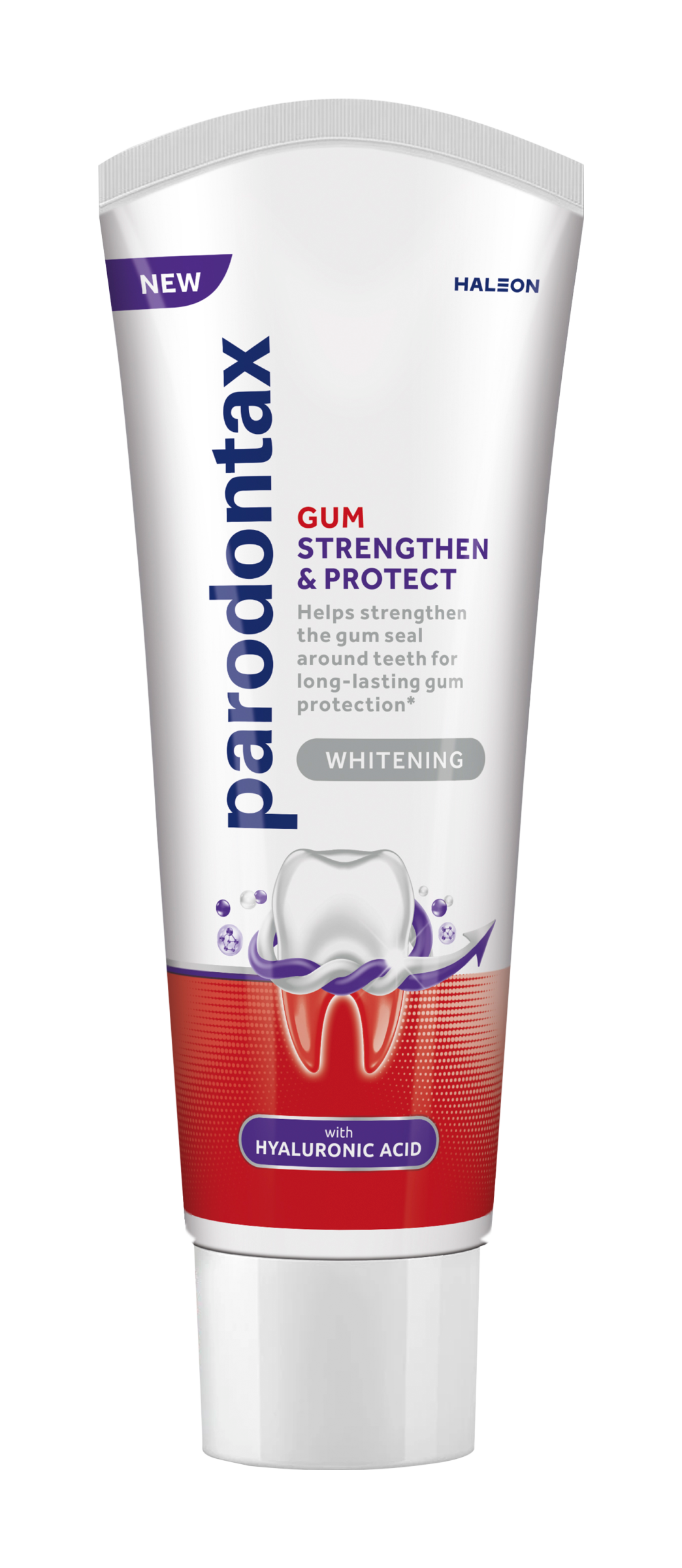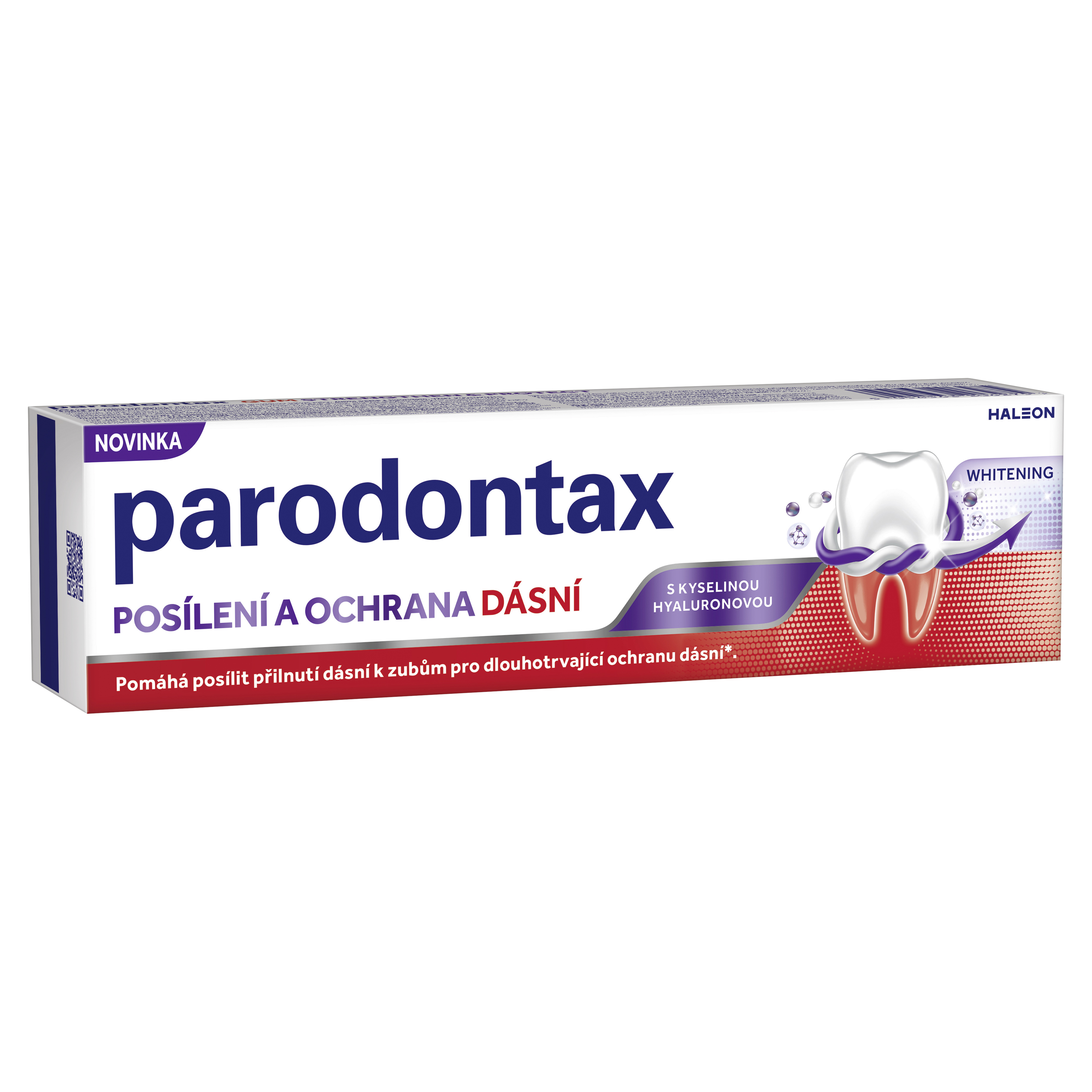 Šetrně odstraňuje skvrny a pomáhá obnovovat přirozenou bělost zubů. Pomáhá posílit přilnutí dásní k zubům pro dlouhotrvající ochranu dásní*. *při dlouhodobém používání 2x denně. Zubní pasta parodontax Posílení a ochrana dásní Whitening posiluje přilnutí dásní k zubům pro dlouhotrvající ochranu dásní* a pomáhá předcházet hromadění zubního plaku. Parodontax Posílení a ochrana dásní Whitening je zubní pasta obohacená o kyselinu hyaluronovou, což je klíčový stavební kámen silných dásní, která pomáhá snížit přilnavost bakterií a tvorbu zubního plaku.