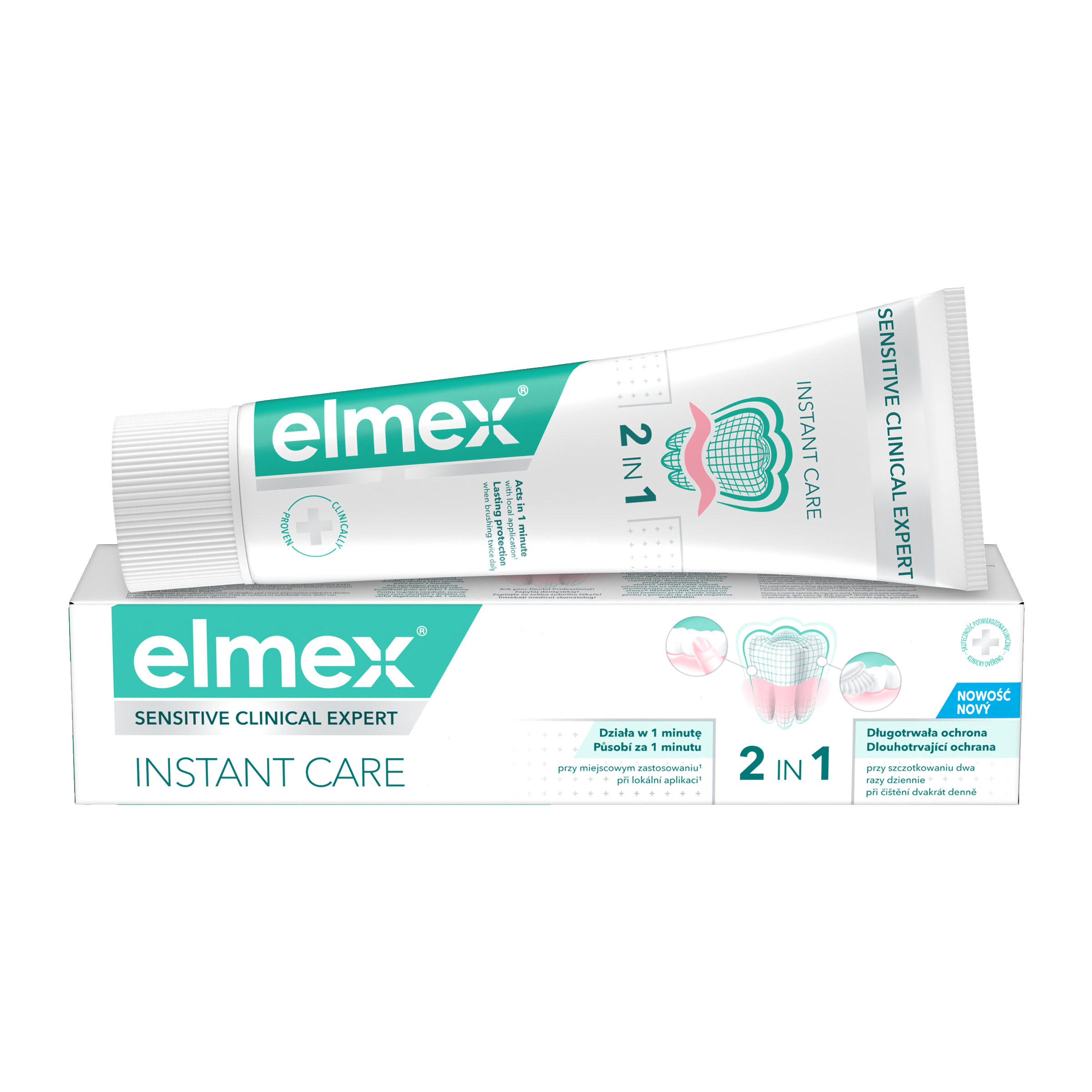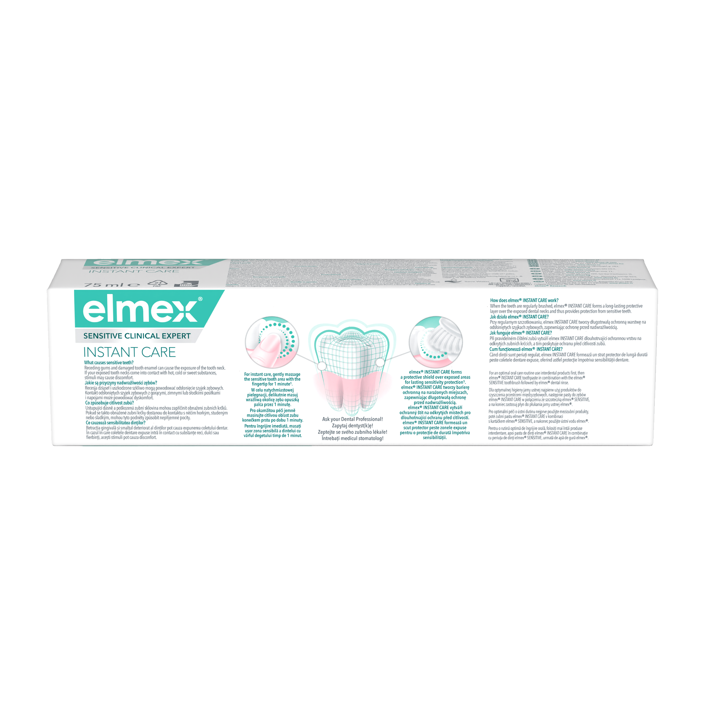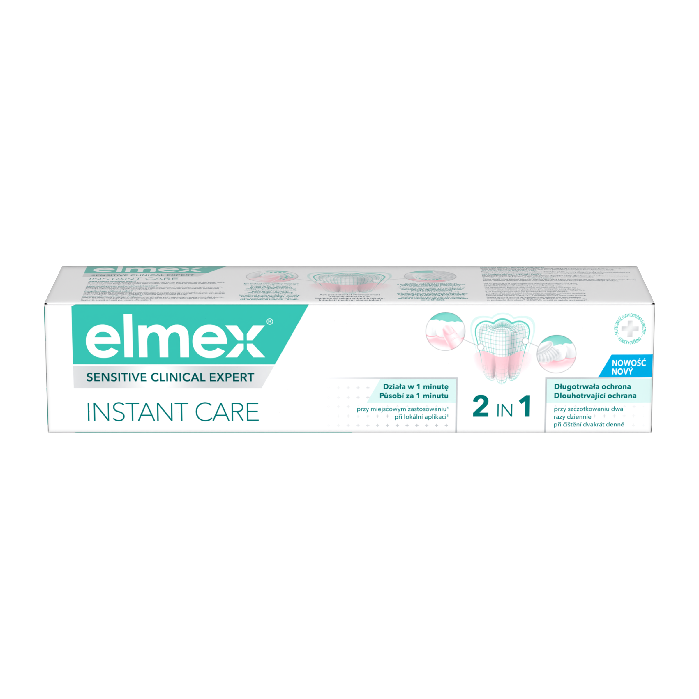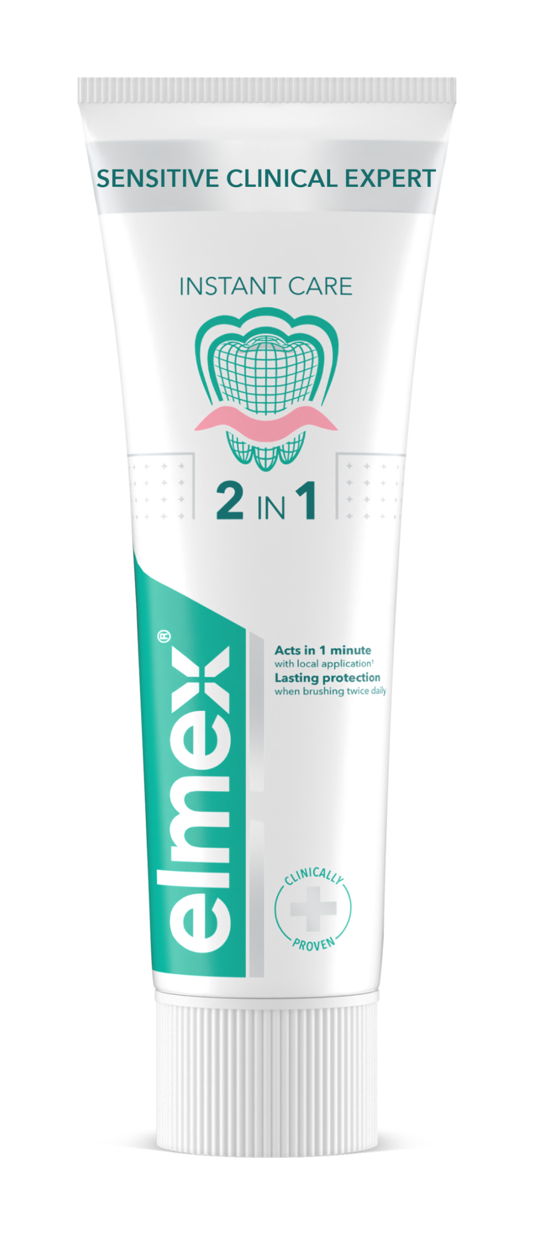 Šetrně pečujte o citlivé zuby se zubní pastou elmex® Sensitive Instant Care. Tato speciálně vyvinutá zubní pasta pro citlivé zuby, která nabízí trvalou ochranu při čištění dvakrát denně, využívá klinicky ověřenou technologii PRO-ARGIN, kterou doporučují zubní lékaři pro osoby s citlivými zuby. Zubní pasta pro citlivé zuby má rychle fungující složení, které působí již za 1 minutu* a při používání dvakrát denně vytváří na obnažených zubních krčcích dlouhotrvající ochrannou vrstvu, která pomáhá chránit před citlivostí. *Pro okamžitou péči jemně vmasírujte špičkou prstu přímo na citlivé místo zubu po dobu 1 minuty až 2x denně a u dětí 7-12 let jednou týdně nebo méně často, před šetrným čištěním zubů. Pro dlouhodobou ochranu naneste na měkký zubní kartáček a čistěte zuby 2x denně.