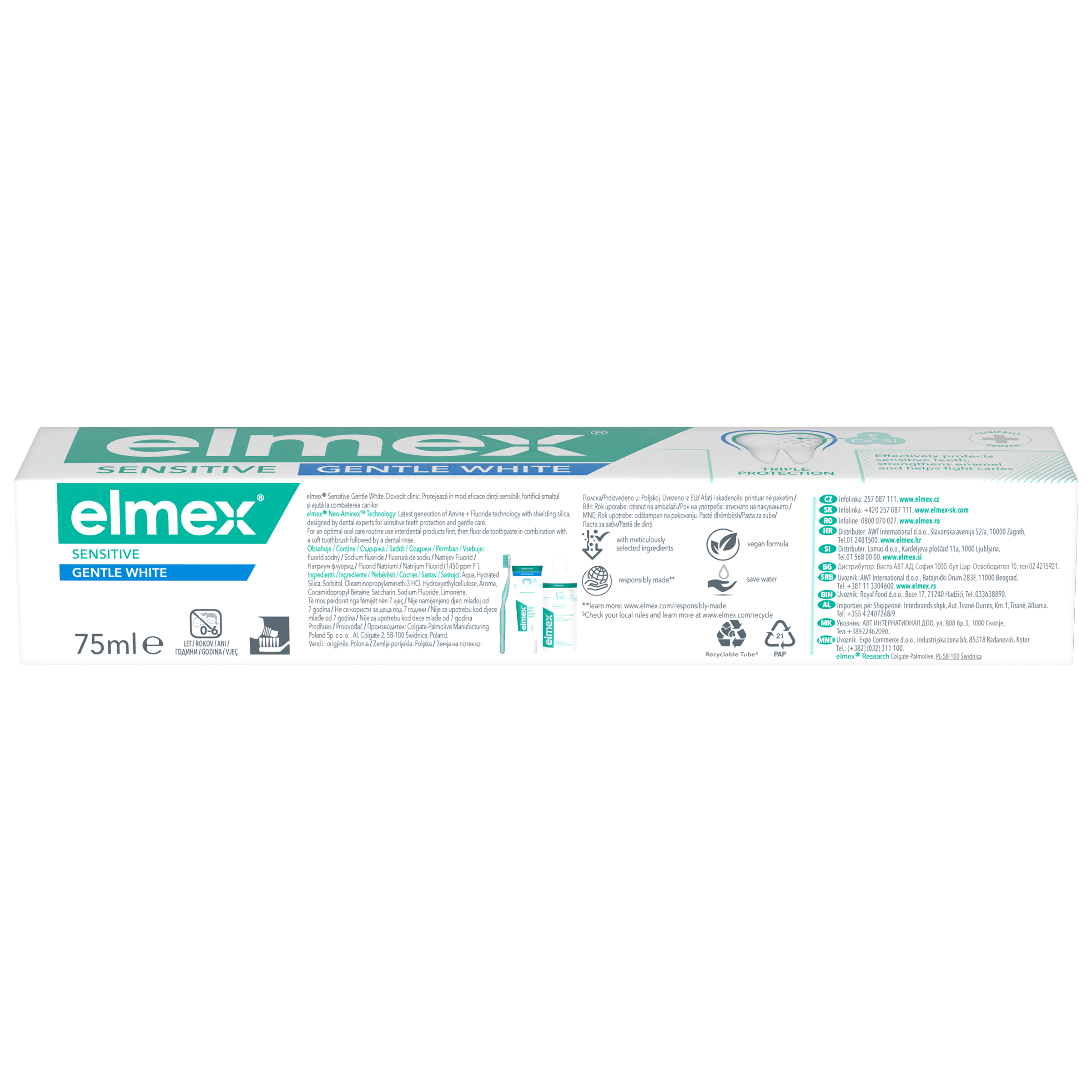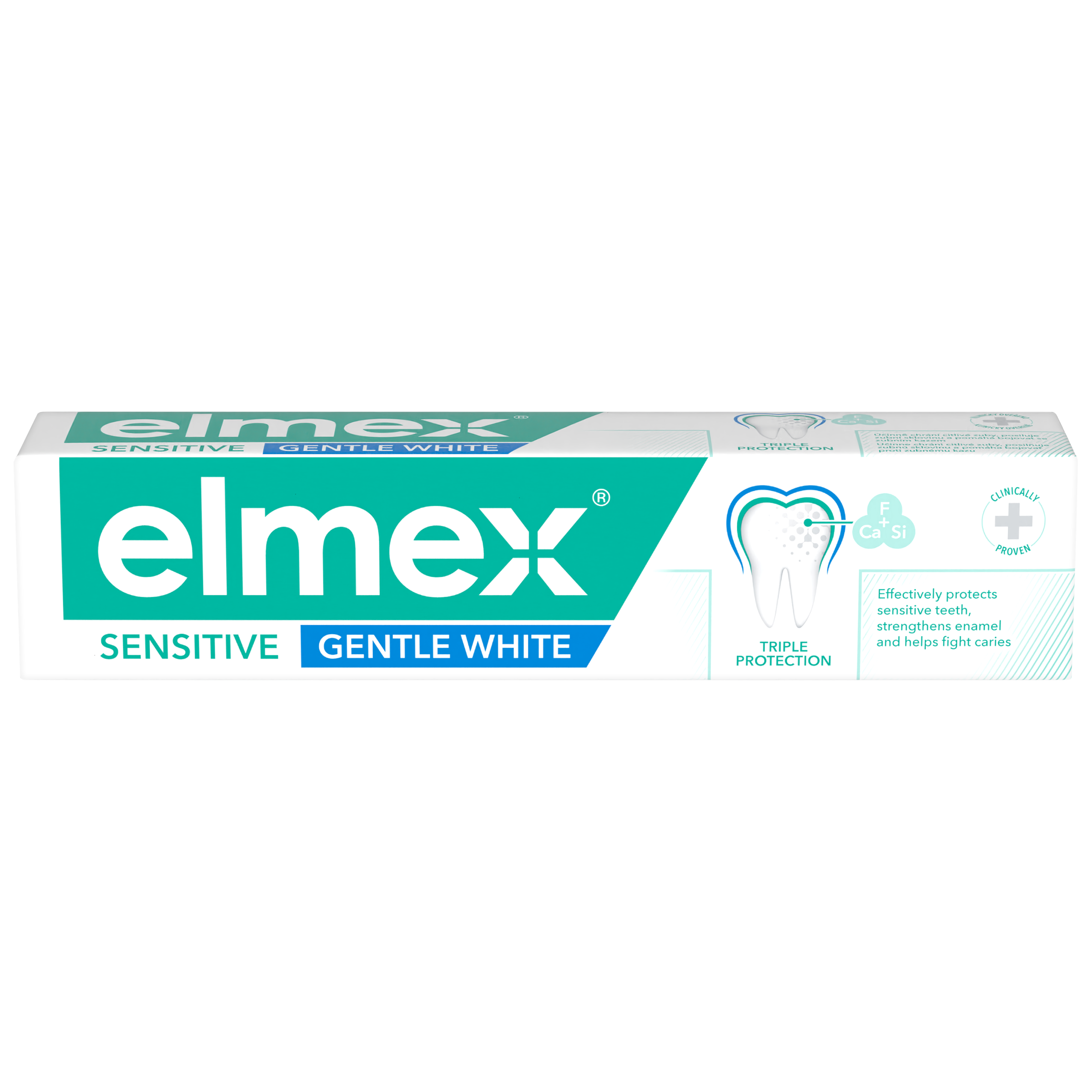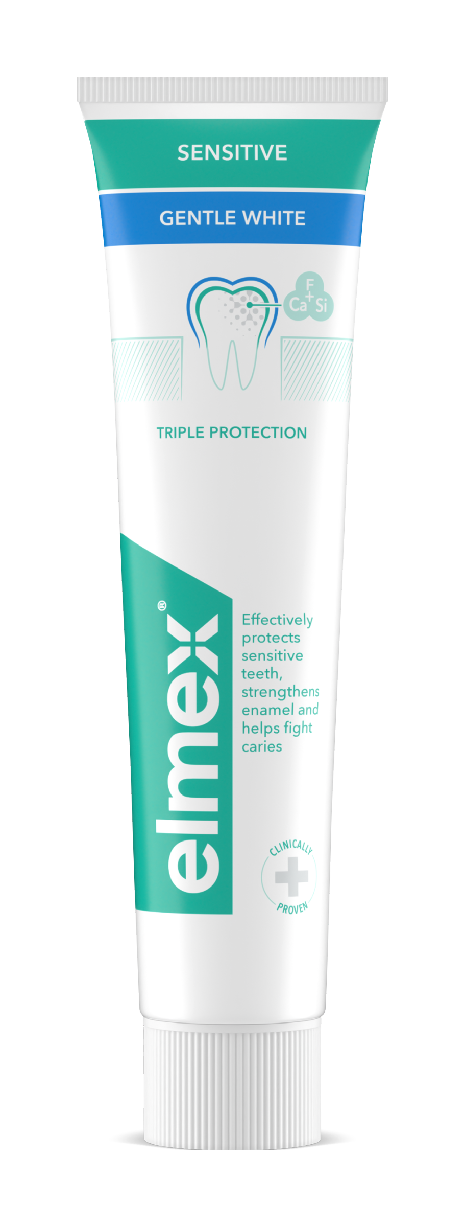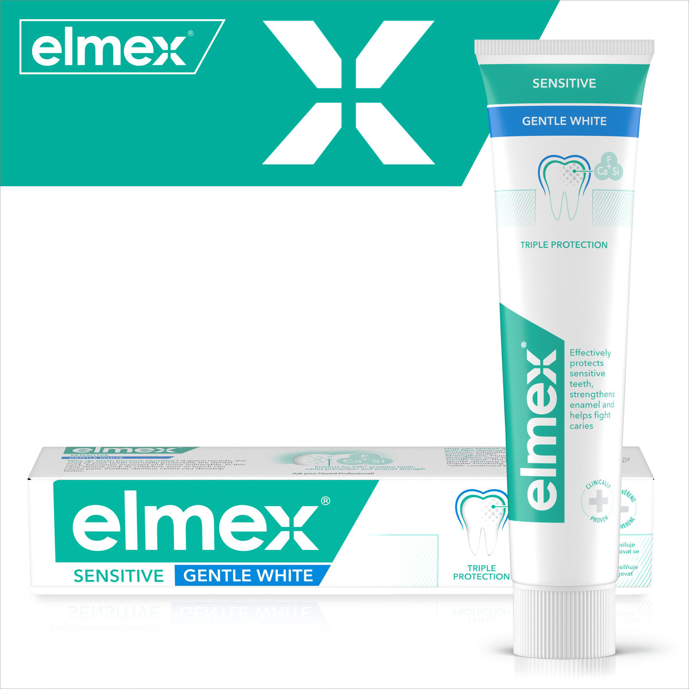 Kromě jemného čištění a ochrany má zubní pasta elmex® Sensitive Gentle White speciální čisticí složení, které šetrně a účinně odstraňuje povrchové skvrny a pomáhá obnovit přirozenou bělost vašich zubů. S ohledem na životní prostředí má tato zubní pasta veganské složení a dodává se v tubě, kterou můžete po spotřebování recyklovat. Se zubní pastou elmex®Sensitive Gentle White můžete nyní získat ochranu, kterou potřebujete. *Při pravidelném čištění zubů 2x denně.