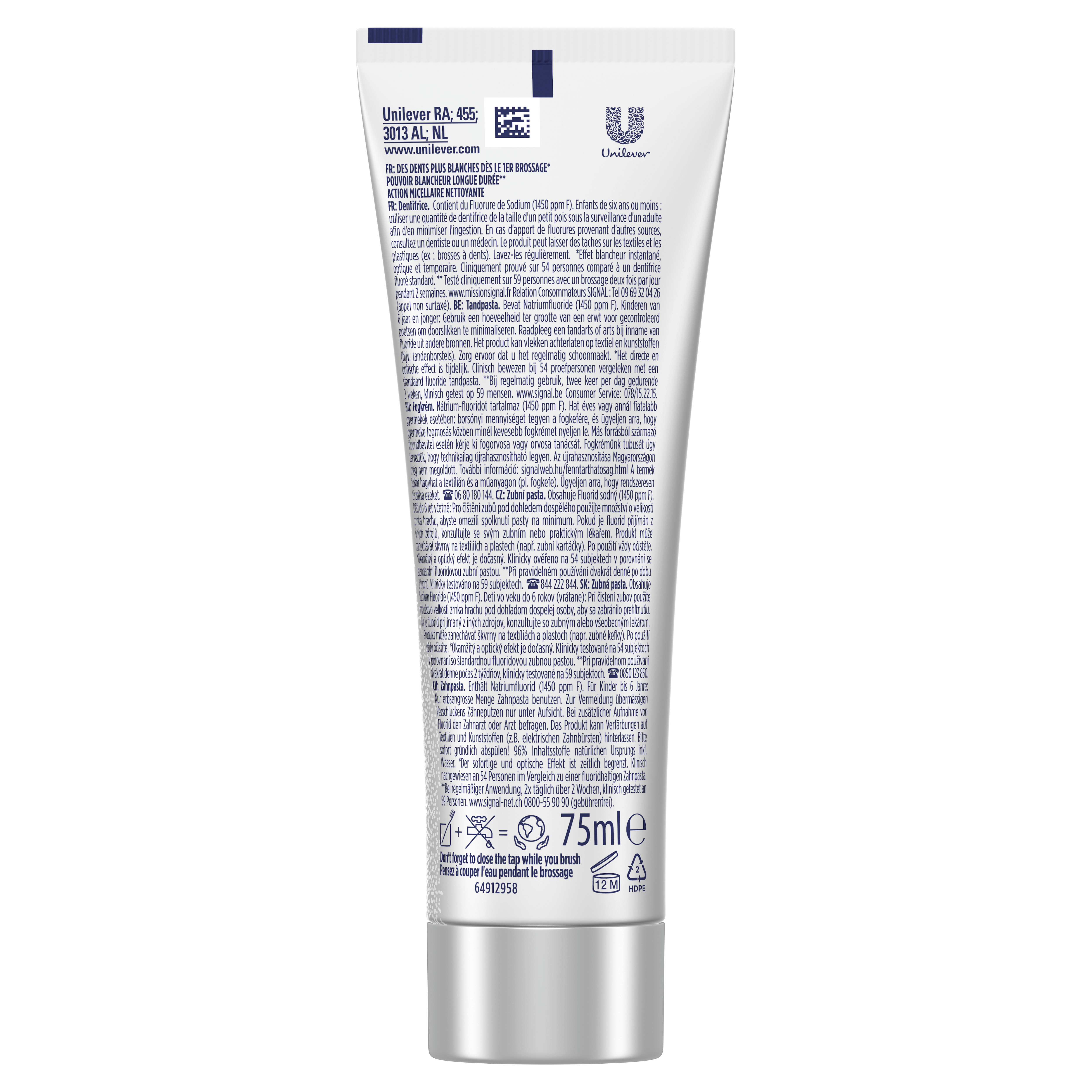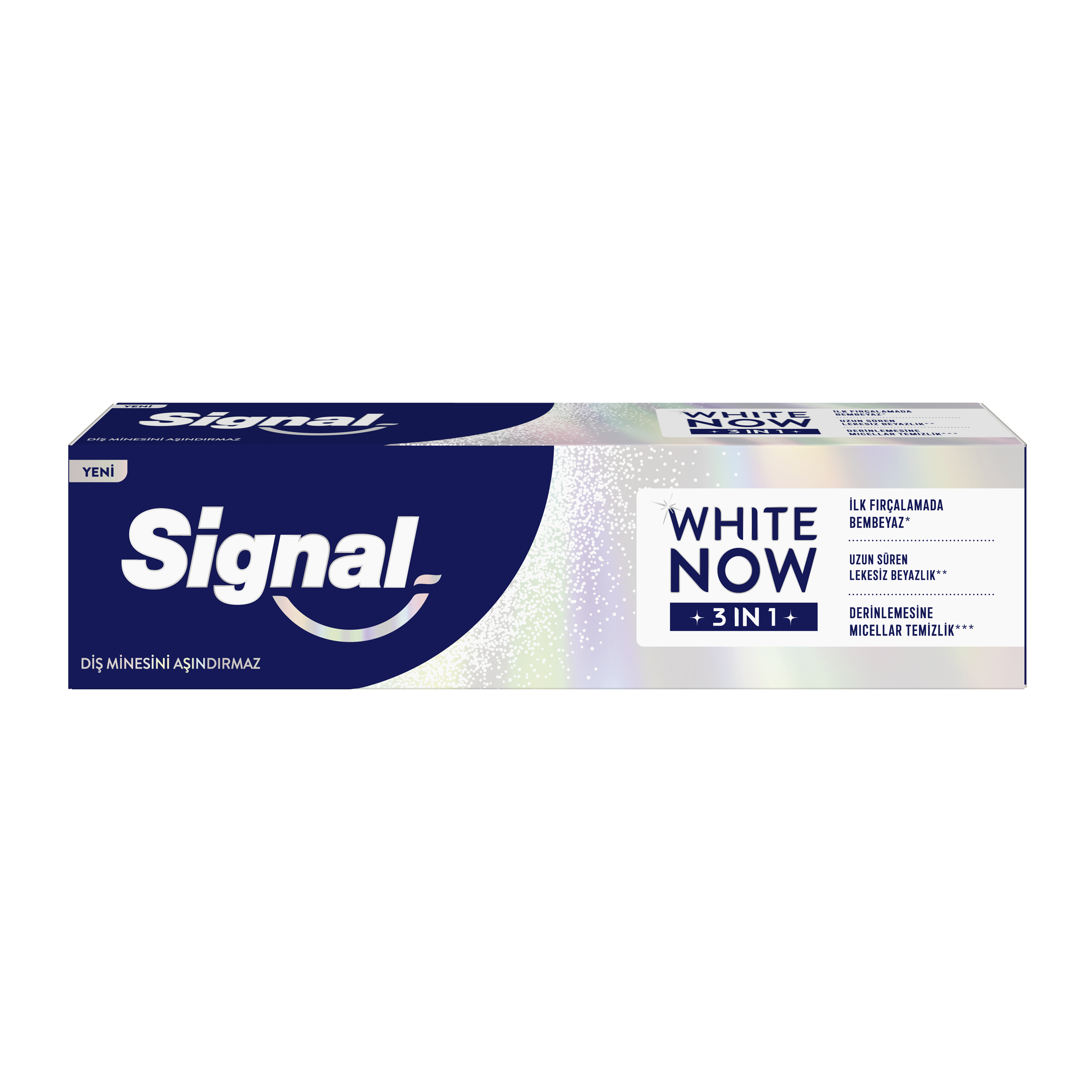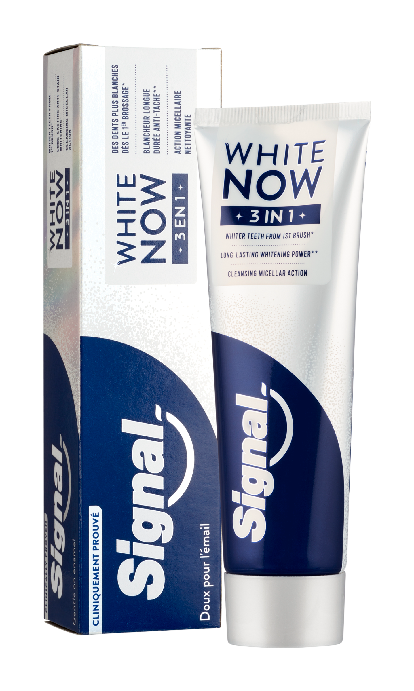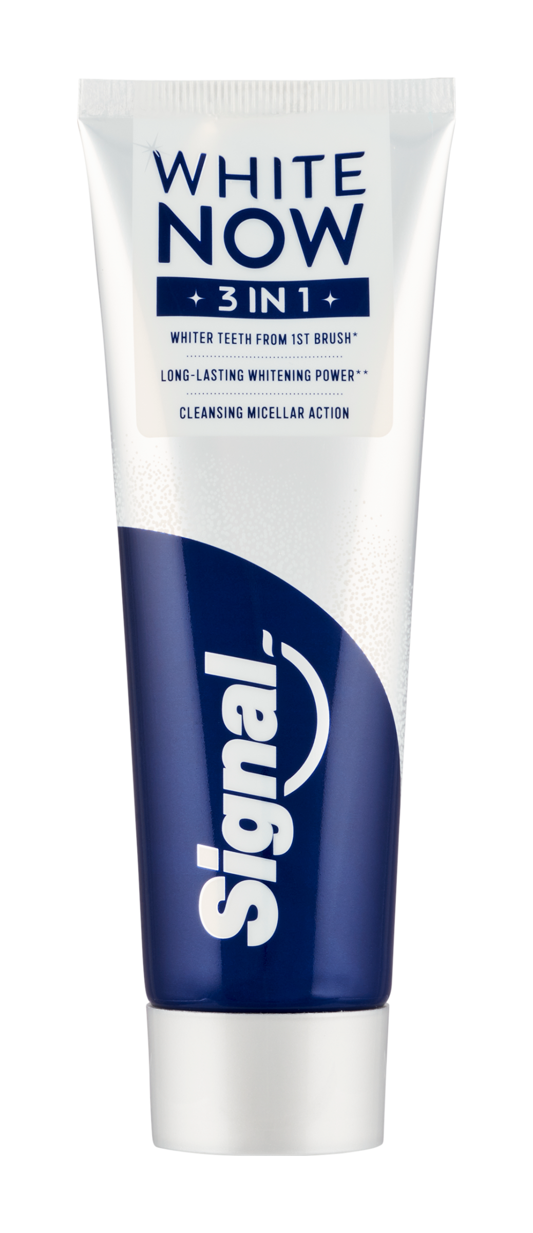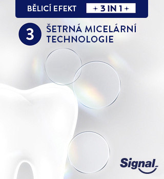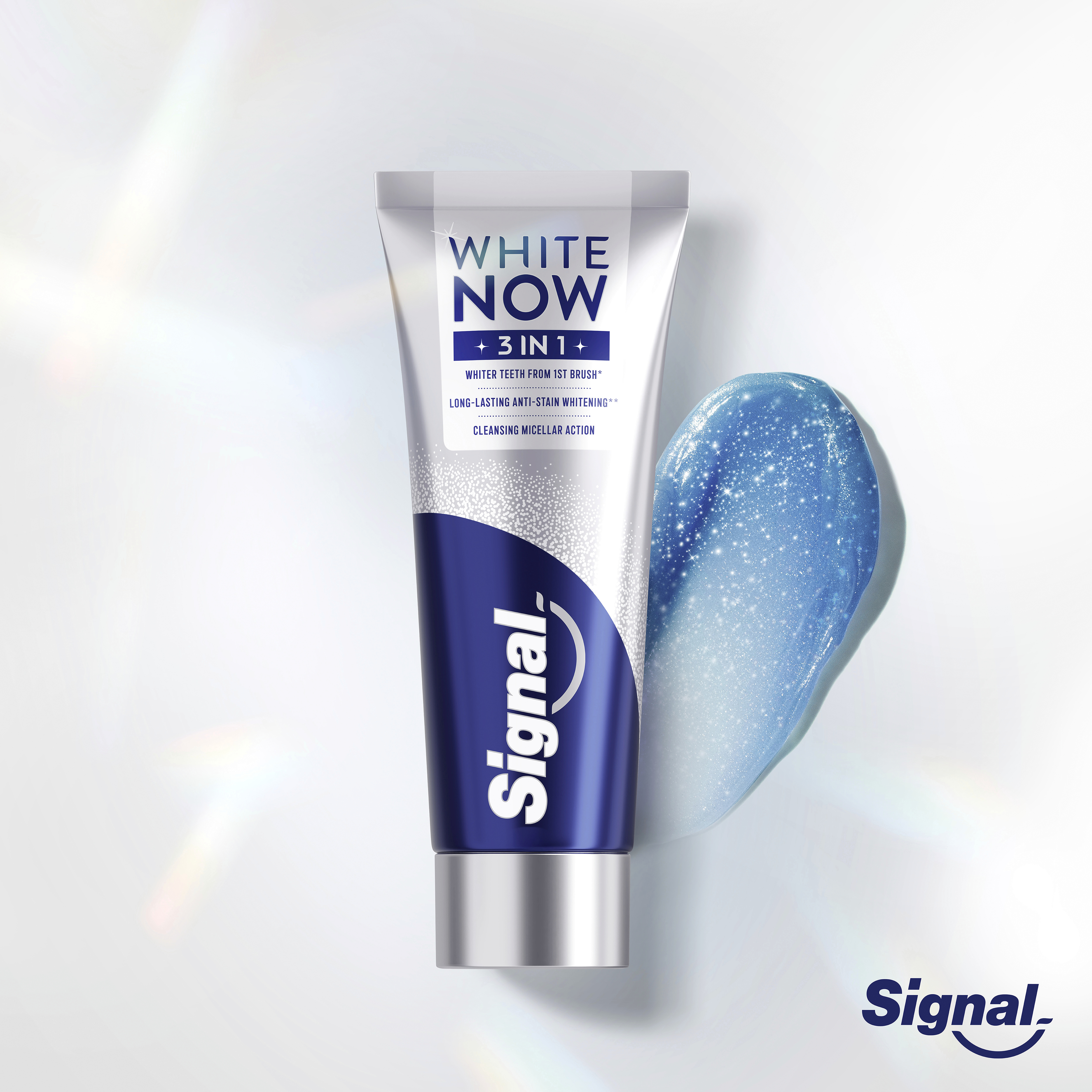 Zubní pasta White Now 3in1 od Signal přináší okamžitý efekt bělejších zubů, zatímco dlouhodobě obnovuje jejich přirozený jas a zdraví. Tato inovativní pasta kombinuje trojici účinků: okamžité zesvětlení zubů, účinné odstranění skvrn a ochranu dásní – pro každodenní péči i zářivý úsměv bez kompromisů. Technologie White Now využívá modré pigmenty, které opticky neutralizují žlutý tón skloviny již po prvním použití. Aktivní složky zároveň působí proti zažloutnutí způsobenému věkem, jídlem či nápoji, a zanechávají zuby vizuálně mladšími. Ideální volba pro ty, kdo chtějí dodat svému úsměvu svěží jiskru.